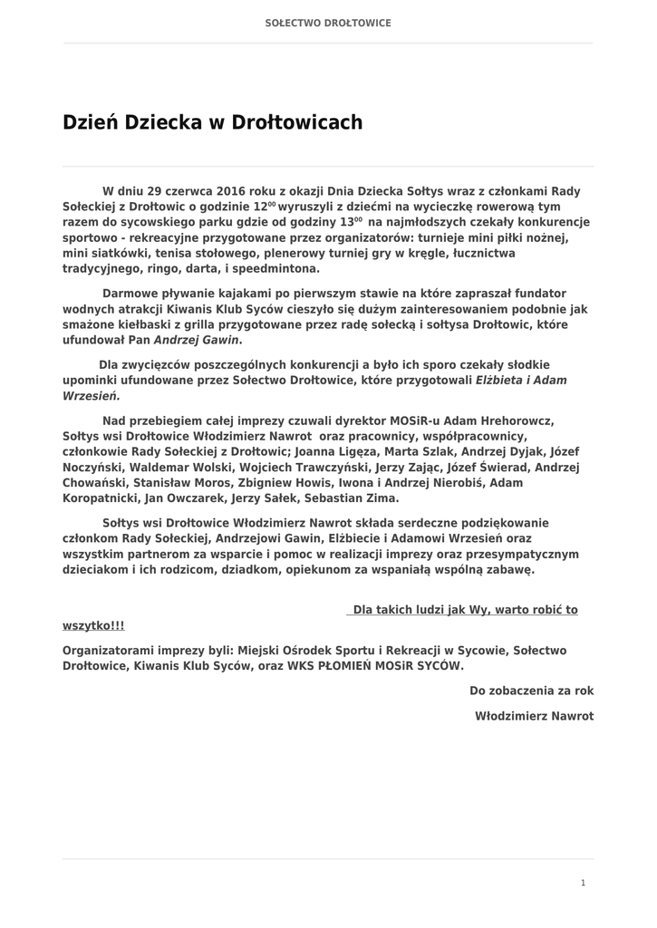 SOŁECTWO DROŁTOWICE Dzień Dziecka w Drołtowicach W dniu 29 czerwca 2016 roku z okazji Dnia Dziecka Sołtys wraz z członkami Rady Sołeckiej z Drołtowic o godzinie 1200 wyruszyli z dziećmi na wycieczkę rowerową tym razem do sycowskiego parku gdzie od godziny 1300 na najmłodszych czekały konkurencje sportowo - rekreacyjne przygotowane przez organizatorów: turnieje mini piłki nożnej, mini siatkówki, tenisa stołowego, plenerowy turniej gry w kręgle, łucznictwa tradycyjnego, ringo, darta, i speedmintona. Darmowe pływanie kajakami po pierwszym stawie na które zapraszał fundator wodnych atrakcji Kiwanis Klub Syców cieszyło się dużym zainteresowaniem podobnie jak smażone kiełbaski z grilla przygotowane przez radę sołecką i sołtysa Drołtowic, które ufundował Pan Andrzej Gawin. Dla zwycięzców poszczególnych konkurencji a było ich sporo czekały słodkie upominki ufundowane przez Sołectwo Drołtowice, które przygotowali Elżbieta i Adam Wrzesień. Nad przebiegiem całej imprezy czuwali dyrektor MOSiR-u Adam Hrehorowcz, Sołtys wsi Drołtowice Włodzimierz Nawrot oraz pracownicy, współpracownicy, członkowie Rady Sołeckiej z Drołtowic; Joanna Ligęza, Marta Szlak, Andrzej Dyjak, Józef Noczyński, Waldemar Wolski, Wojciech Trawczyński, Jerzy Zając, Józef Świerad, Andrzej Chowański, Stanisław Moros, Zbigniew Howis, Iwona i Andrzej Nierobiś, Adam Koropatnicki, Jan Owczarek, Jerzy Sałek, Sebastian Zima. Sołtys wsi Drołtowice Włodzimierz Nawrot składa serdeczne podziękowanie członkom Rady Sołeckiej, Andrzejowi Gawin, Elżbiecie i Adamowi Wrzesień oraz wszystkim partnerom za wsparcie i pomoc w realizacji imprezy oraz przesympatycznym dzieciakom i ich rodzicom, dziadkom, opiekunom za wspaniałą wspólną zabawę. Dla takich ludzi jak Wy, warto robić to wszytko!!! Organizatorami imprezy byli: Miejski Ośrodek Sportu i Rekreacji w Sycowie, Sołectwo Drołtowice, Kiwanis Klub Syców, oraz WKS PŁOMIEŃ MOSiR SYCÓW. Do zobaczenia za rok Włodzimierz Nawrot 1