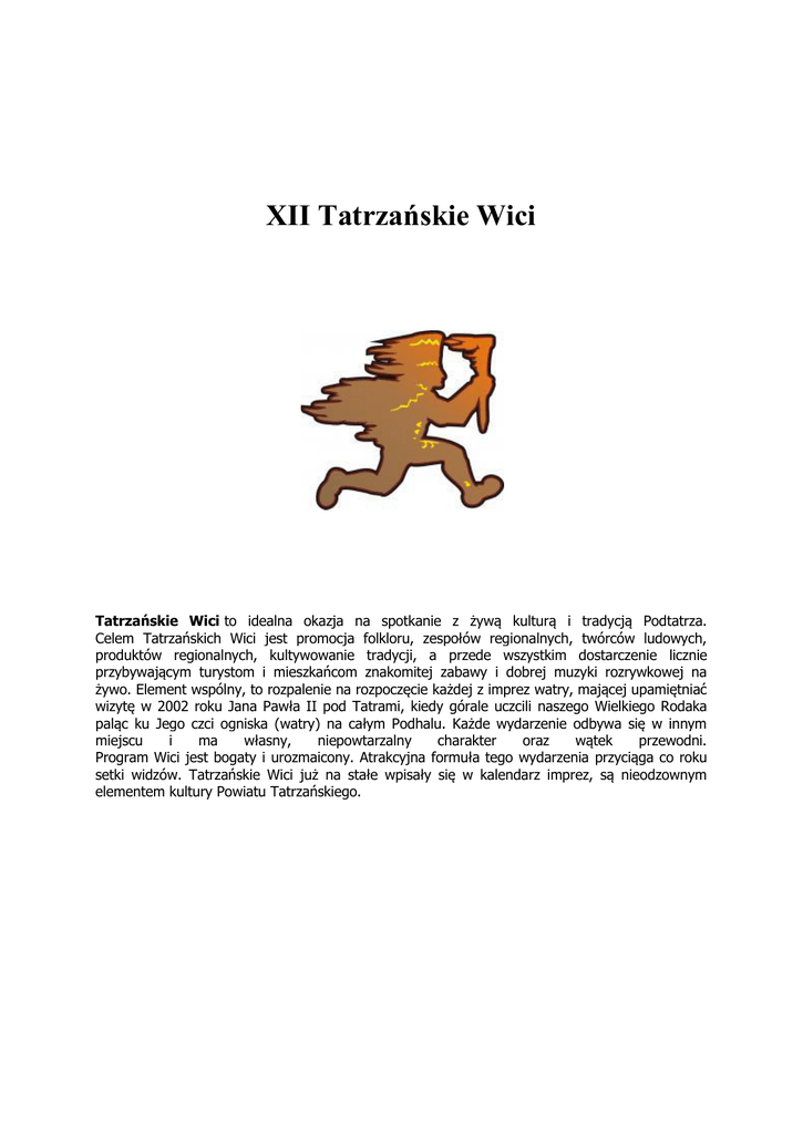 XII Tatrzańskie Wici Tatrzańskie Wici to idealna okazja na spotkanie z żywą kulturą i tradycją Podtatrza. Celem Tatrzańskich Wici jest promocja folkloru, zespołów regionalnych, twórców ludowych, produktów regionalnych, kultywowanie tradycji, a przede wszystkim dostarczenie licznie przybywającym turystom i mieszkańcom znakomitej zabawy i dobrej muzyki rozrywkowej na żywo. Element wspólny, to rozpalenie na rozpoczęcie każdej z imprez watry, mającej upamiętniać wizytę w 2002 roku Jana Pawła II pod Tatrami, kiedy górale uczcili naszego Wielkiego Rodaka paląc ku Jego czci ogniska (watry) na całym Podhalu. Każde wydarzenie odbywa się w innym miejscu i ma własny, niepowtarzalny charakter oraz wątek przewodni. Program Wici jest bogaty i urozmaicony. Atrakcyjna formuła tego wydarzenia przyciąga co roku setki widzów. Tatrzańskie Wici już na stałe wpisały się w kalendarz imprez, są nieodzownym elementem kultury Powiatu Tatrzańskiego. Wydarzenia rozpoczniemy 7 lipca „II Ogólnopodhalańskimi Wyborami Nośwarniyjsyj Górolecki” czyli góralskiej miss w Białym Dunajcu. Corocznie do konkursu przystępuje kilkanaście dziewczyn z całego Podtatrza, które muszą wykazać się umiejętnościami śpiewu, tańca góralskiego, posługiwania się gwarą podhalańską, a także posiadanymi wiadomościami o swoim regonie. W konkursie są również konkurencje codzienne, takie jak ścielenie łóżka, dojenie krowy, układanie kopy z sianem, a także konkurencje świąteczne, czyli sznurowanie gorsetów i kierpców na czas. Na kolejny weekend zapraszamy do Bustryk na „III Bustrycańskie Nomowiny”, które odbędą się 14 lipca. Międzypowiatowy Piknik Sportowy „X Dunajeckie Granie” to impreza odbywająca się 14 lipca w Białym Dunajcu, która rozwija wśród ludności wiejskiej zamiłowanie do uprawiania sportu poprzez udział amatorów w meczach piłki nożnej, a także sprzyja rozwojowi kultury, poprzez występy zespołów regionalnych i koncerty zespołów muzycznych. Na kolejne wydarzenie zapraszamy do Brzegów na „Brzegowskie Nucicki”, które odbędą się 14 lipca. „XI Dzień Polowaca” świętowany jest 28 lipca w Jurgowie. Impreza jest swojego rodzaju ukłonem w stronę dawnych miejscowych „polowackich” tradycji. Stanowi ona znakomitą okazje do spotkań członków okolicznych kół łowieckich oraz wszystkich zainteresowanych myślistwem. Dla amatorów rekreacyjnego strzelania organizowany jest otwarty konkurs z broni pneumatycznej o „Jurgowską Flintę”. „XIII Witowiańsko Watra” jest imprezą plenerową o charakterze kulturalnym. Odbędzie się 28 lipca w Witowie. Watra to przede wszystkim występy miejscowych zespołów i zespołów zaproszonych, loterie z cennymi nagrodami, regionalne stoły, grill, konkursy m.in. piłowanie drzewa, układanie kopy siana no i oczywiście bardzo ważne są Mistrzostwa Świata w jedzeniu bundzu (sera owczego) w jak najkrótszym czasie. „XII Dzień Pstrąga” coroczna impreza odbywająca się 28 lipca w Białym Dunajcu. Impreza nawiązuje swą nazwą do herbu gminy Biały Dunajec. Głównym punktem programu jest konkurs wędkarski oraz konkurs dla restauratorów na przyrządzenie najlepszych potraw z pstrąga. W zawodach wędkarskich zadaniem uczestników jest złapanie jak największej ilości pstrągów w określonym przez regulamin czasie. Następnie do rywalizacji przystępują ekipy kulinarne. Jury dokonując oceny konkursowych dań zwraca uwagę na: wygląd, smak, sposób podania oraz dekorację przyrządzonych potraw z ryb. Zapraszamy do Białki Tatrzańskiej. 3 sierpnia wszyscy nie górale mogą się tu zmierzyć o zaszczytne tytuły w„Wyborach Cepra i Ceperki Roku”. 4 sierpnia wybierzemy góralskiego „mistera”, czyli Harnasia Roku 2013. Kandydaci na Harnasia Roku muszą wykonać szereg zadań m.in. próbę siły i sprytu oraz próbę ciupagi. Innymi konkurencjami są śpiew pytacki, znajomość Tatr i Podhala, a także jazda konna. Ceper Roku musi wykazać się perfekcyjnym cięciem i rąbaniem drewna, Ceperka – świetnie sznurować góralski gorset. Trzeba też zdać egzamin z wyrażeń gwarowych. Ceper i Ceperka oraz Harnaś Roku 2013 nosić zaś będą te zaszczytne tytuły aż do kolejnych wyborów. Na kolejne wydarzenie 4 sierpnia zapraszamy na „Bieg Nartorolkowy o Puchar Prezesa LKS Poroniec” w Murzasichlu. „I Międzynarodowa Wystawa Psów Rasowych” odbędzie się w dniach 3-4 sierpnia w Kościelisku –Kiry. „Święto Olczy” odbędzie się 4 sierpnia na Olczy. 11 sierpnia, w Zębie będzie można przyjrzeć się sprawności i kunsztowi lokalnych strażaków. Drużyny strażackie zmierzą się w licznych konkurencjach i zabawach podczas swojego święta nazwanego „Strażacki Śpas”. 15 sierpnia, na Siwej Polanie w Kościelisku odbędzie się "Święto Lasu", a w jego trakcie grzybiarski Konkurs na Największego Prawdziwka i Konkurs Drwali. Na kolejne wydarzenie 17 sierpnia zapraszamy do Białki Tatrzańskiej na „Tatrzańską Ścigacke” „Dzień Misia, Miodu i Bartników” - impreza odbędzie się 18 sierpnia w Poroninie. Głównymi atrakcjami są: kiermasz wyborów pszczelarskich, wybór Królowej Miodu, przegląd zespołów regionalnych, konkurencje sprawnościowe. 24 sierpnia zagościmy na zakopiańskiej Harendzie, gdzie odbędą się Harendziańkie Zwyki, które są plenerową imprezą gromadząca tłumy mieszkańców i licznie przebywających w tym czasie na Harendzie gości. W tym roku będzie sporo regionalnej muzyki, dobrego jadła i napitku. "Osod w Nowem Bystrem" to impreza organizowana 25 sierpnia 2013 roku. Warto przyjechać na Osod, aby zobaczyć tradycyjny redyk idący przez wieś, usłyszeć zbyrk dzwonków i śpiew juhasów a także pokosztować oryginalnych wyrobów pasterskich: zyntycy, buncu i oscypków oraz zobaczyć występy zespołów regionalnych wraz z pokazem obrzędów związanych z pasterstwem w górach. „Powiatowe Zawo