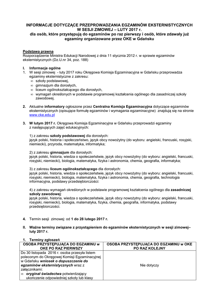 INFORMACJE DOTYCZĄCE PRZEPROWADZANIA EGZAMINÓW EKSTERNISTYCZNYCH W SESJI ZIMOWEJ – LUTY 2017 r. dla osób, które przystępują do egzaminów po raz pierwszy i osób, które zdawały już egzaminy organizowane przez OKE w Gdańsku Podstawa prawna Rozporządzenie Ministra Edukacji Narodowej z dnia 11 stycznia 2012 r. w sprawie egzaminów eksternistycznych (Dz.U.nr 34, poz. 188) I. Informacje ogólne 1. W sesji zimowej - luty 2017 roku Okręgowa Komisja Egzaminacyjna w Gdańsku przeprowadza egzaminy eksternistyczne z zakresu: • szkoły podstawowej, • gimnazjum dla dorosłych, • liceum ogólnokształcącego dla dorosłych, • wymagań określonych w podstawie programowej kształcenia ogólnego dla zasadniczej szkoły zawodowej. 2. Aktualne informatory ogłoszone przez Centralna Komisja Egzaminacyjna dotyczące egzaminów eksternistycznych (opisujące formułę egzaminów i wymagania egzaminacyjne) znajdują się na stronie www.cke.edu.pl 3. W lutym 2017 r. Okręgowa Komisja Egzaminacyjna w Gdańsku przeprowadzi egzaminy z następujących zajęć edukacyjnych: 1) z zakresu szkoły podstawowej dla dorosłych: język polski, historia i społeczeństwo, język obcy nowożytny (do wyboru: angielski, francuski, rosyjski, niemiecki), przyroda, matematyka, informatyka; 2) z zakresu gimnazjum dla dorosłych: język polski, historia, wiedza o społeczeństwie, język obcy nowożytny (do wyboru: angielski, francuski, rosyjski, niemiecki), biologia, matematyka, fizyka i astronomia, chemia, geografia, informatyka; 3) z zakresu liceum ogólnokształcącego dla dorosłych: język polski, historia, wiedza o społeczeństwie, język obcy nowożytny (do wyboru: angielski, francuski, rosyjski, niemiecki), biologia, matematyka, fizyka i astronomia, chemia, geografia, technologia informacyjna, podstawy przedsiębiorczości: 4) z zakresu wymagań określonych w podstawie programowej kształcenia ogólnego dla zasadniczej szkoły zawodowej: język polski, historia, wiedza o społeczeństwie, język obcy nowożytny (do wyboru: angielski, francuski, rosyjski, niemiecki), biologia, matematyka, fizyka, chemia, geografia, informatyka, podstawy przedsiębiorczości. 4. Termin sesji zimowej: od 1 do 28 lutego 2017 r. II. Ważne terminy związane z przystąpieniem do egzaminów eksternistycznych w sesji zimowej– luty 2017 r. 1. Terminy zgłoszeń OSOBA PRZYSTĘPUJĄCA DO EGZAMINU w OKE PO RAZ PIERWSZY Do 30 listopada 2016 r. osoba przesyła listem poleconym do Okręgowej Komisji Egzaminacyjnej w Gdańsku wniosek o dopuszczenie do egzaminów eksternistycznych wraz z załącznikami: • oryginał świadectwa potwierdzający ukończenie odpowiedniej szkoły lub klasy OSOBA PRZYSTĘPUJĄCA DO EGZAMINU w OKE PO RAZ KOLEJNY Nie dotyczy • kserokopia stron dowodu osobistego lub innego dokumentu ze zdjęciem zawierającego datę i miejsce urodzenia oraz numer ewidencyjny PESEL W przypadku osoby (niewidomej, słabowidzącej, niesłyszącej, słabosłyszącej, z niesprawnością ruchową, z upośledzeniem w stopniu lekkim lub z autyzmem) ubiegającej się o dostosowanie warunków i formy egzaminu do rodzaju niepełnosprawności do wniosku należy dołączyć zaświadczenie lekarskie potwierdzające występowanie dysfunkcji. W terminie do 14 dni od otrzymania wniosku Okręgowa Komisja Egzaminacyjna w Gdańsku przesyła do osób, które złożyły wniosek, pisemne Rozstrzygnięcie w sprawie dopuszczenia do egzaminów eksternistycznych wraz z informacją o wysokości opłat za egzaminy oraz numerem konta bankowego. Do 31 grudnia 2016 r. należy przesłać do Okręgowej Komisji Egzaminacyjnej w Gdańsku: • deklarację o wyborze zajęć edukacyjnych w sesji egzaminacyjnej • dowód wniesienia opłaty za egzamin albo wniosek o zwolnienie z opłaty wraz z załącznikami potwierdzającymi dochód (informacja nt. zwolnienia znajduje się na stronie www.oke.gda.pl ) Nie dotyczy Do 31 grudnia 2016 r. przesyła do Okręgowej Komisji Egzaminacyjnej w Gdańsku: • deklarację o wyborze zajęć edukacyjnych • dowód uiszczenia opłaty za egzamin albo składa wniosek o zwolnienie z opłat wraz z załącznikami potwierdzającymi dochód (informacja nt. zwolnienia znajduje się na stronie www.oke.gda.pl) 2. W miesiącu styczniu 2017 roku dyrektor Centralnej Komisji Egzaminacyjnej ogłasza harmonogram przeprowadzania egzaminów eksternistycznych na stronie internetowej www.cke.edu.pl 3. Do 20 stycznia 2017 r. Okręgowa Komisja Egzaminacyjna w Gdańsku ogłasza adresy ośrodków egzaminacyjnych na stronie www.oke.gda.pl oraz publikuje informacje o miejscu i terminie przystąpienia do egzaminu z poszczególnych zajęć. 4. W dniach 1 – 28 lutego 2017 r. zdający składają egzaminy eksternistyczne z wybranych zajęć edukacyjnych we wskazanym przez OKE miejscu wg ogłoszonego harmonogramu. Ogólne informacje o egzaminach eksternistycznych i warunkach przystąpienia do egzaminów eksternistycznych z zakresu obowiązkowych zajęć edukacyjnych określonych w ramowym planie nauczania dla szkoły podstawowej gimnazjum i liceum ogólnokształcącego dla dorosłych oraz z zakresu wymagań określonych w podstawie programowej kształcenia ogólnego dla zasadniczej szkoły zawodowej zostały umieszczone na stronie Centralnej Komisji Egzaminacyjnej w Warszawie www.cke.edu.pl w zakładce „egzaminy eksternistyczne”.
