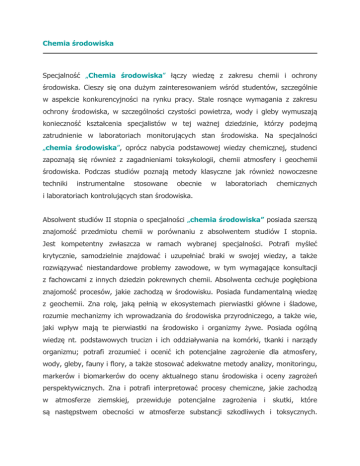 Chemia środowiska Specjalność „Chemia środowiska” łączy wiedzę z zakresu chemii i ochrony środowiska. Cieszy się ona dużym zainteresowaniem wśród studentów, szczególnie w aspekcie konkurencyjności na rynku pracy. Stale rosnące wymagania z zakresu ochrony środowiska, w szczególności czystości powietrza, wody i gleby wymuszają konieczność kształcenia specjalistów w tej ważnej dziedzinie, którzy podejmą zatrudnienie w laboratoriach monitorujących stan środowiska. Na specjalności „chemia środowiska”, oprócz nabycia podstawowej wiedzy chemicznej, studenci zapoznają się również z zagadnieniami toksykologii, chemii atmosfery i geochemii środowiska. Podczas studiów poznają metody klasyczne jak również nowoczesne techniki instrumentalne stosowane obecnie w laboratoriach chemicznych i laboratoriach kontrolujących stan środowiska. Absolwent studiów II stopnia o specjalności „chemia środowiska” posiada szerszą znajomość przedmiotu chemii w porównaniu z absolwentem studiów I stopnia. Jest kompetentny zwłaszcza w ramach wybranej specjalności. Potrafi myśleć krytycznie, samodzielnie znajdować i uzupełniać braki w swojej wiedzy, a także rozwiązywać niestandardowe problemy zawodowe, w tym wymagające konsultacji z fachowcami z innych dziedzin pokrewnych chemii. Absolwenta cechuje pogłębiona znajomość procesów, jakie zachodzą w środowisku. Posiada fundamentalną wiedzę z geochemii. Zna rolę, jaką pełnią w ekosystemach pierwiastki główne i śladowe, rozumie mechanizmy ich wprowadzania do środowiska przyrodniczego, a także wie, jaki wpływ mają te pierwiastki na środowisko i organizmy żywe. Posiada ogólną wiedzę nt. podstawowych trucizn i ich oddziaływania na komórki, tkanki i narządy organizmu; potrafi zrozumieć i ocenić ich potencjalne zagrożenie dla atmosfery, wody, gleby, fauny i flory, a także stosować adekwatne metody analizy, monitoringu, markerów i biomarkerów do oceny aktualnego stanu środowiska i oceny zagrożeń perspektywicznych. Zna i potrafi interpretować procesy chemiczne, jakie zachodzą w atmosferze ziemskiej, przewiduje potencjalne zagrożenia i skutki, które są następstwem obecności w atmosferze substancji szkodliwych i toksycznych. Zna techniki analizy instrumentalnej, które są stosowane do oceny stanu środowiska. Potrafi posługiwać się naukowymi literaturowych w zakresie chemii. bazami danych, korzystać z zasobów