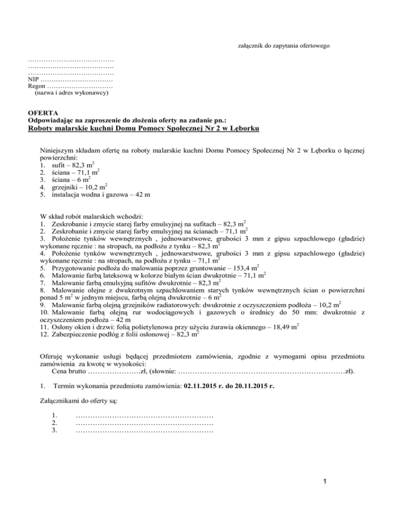 załącznik do zapytania ofertowego ………………………………… ………………………………… ………………………………… NIP …………………………… Regon ………………………… (nazwa i adres wykonawcy) OFERTA Odpowiadając na zaproszenie do złożenia oferty na zadanie pn.: Roboty malarskie kuchni Domu Pomocy Społecznej Nr 2 w Lęborku Niniejszym składam ofertę na roboty malarskie kuchni Domu Pomocy Społecznej Nr 2 w Lęborku o łącznej powierzchni: 1. sufit – 82,3 m2 2. ściana – 71,1 m2 3. ściana – 6 m2 4. grzejniki – 10,2 m2 5. instalacja wodna i gazowa – 42 m W skład robót malarskich wchodzi: 1. Zeskrobanie i zmycie starej farby emulsyjnej na sufitach – 82,3 m2 2. Zeskrobanie i zmycie starej farby emulsyjnej na ścianach – 71,1 m2 3. Położenie tynków wewnętrznych , jednowarstwowe, grubości 3 mm z gipsu szpachlowego (gładzie) wykonane ręcznie : na stropach, na podłożu z tynku – 82,3 m2 4. Położenie tynków wewnętrznych , jednowarstwowe, grubości 3 mm z gipsu szpachlowego (gładzie) wykonane ręcznie : na stropach, na podłożu z tynku – 71,1 m2 5. Przygotowanie podłoża do malowania poprzez gruntowanie – 153,4 m2 6. Malowanie farbą lateksową w kolorze białym ścian dwukrotnie – 71,1 m2 7. Malowanie farbą emulsyjną sufitów dwukrotnie – 82,3 m2 8. Malowanie olejne z dwukrotnym szpachlowaniem starych tynków wewnętrznych ścian o powierzchni ponad 5 m2 w jednym miejscu, farbą olejną dwukrotnie – 6 m2 9. Malowanie farbą olejną grzejników radiatorowych: dwukrotnie z oczyszczeniem podłoża – 10,2 m2 10. Malowanie farbą olejną rur wodociągowych i gazowych o średnicy do 50 mm: dwukrotnie z oczyszczeniem podłoża – 42 m 11. Osłony okien i drzwi: folią polietylenowa przy użyciu żurawia okiennego – 18,49 m2 12. Zabezpieczenie podłóg z folii osłonowej – 82,3 m2 Oferuję wykonanie usługi będącej przedmiotem zamówienia, zgodnie z wymogami opisu przedmiotu zamówienia za kwotę w wysokości: Cena brutto ………………….zł, (słownie: ……………………………………………………………zł). 1. Termin wykonania przedmiotu zamówienia: 02.11.2015 r. do 20.11.2015 r. Załącznikami do oferty są: 1. 2. 3. ………………………………………………… ………………………………………………… ………………………………………………… 1