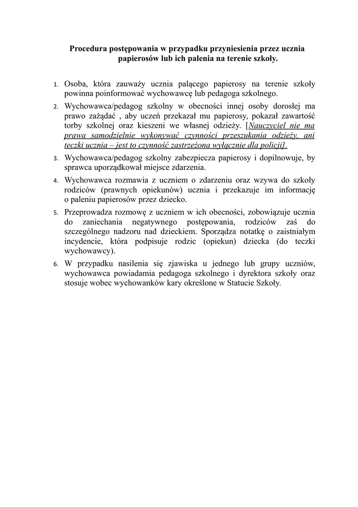 Procedura postępowania w przypadku przyniesienia przez ucznia papierosów lub ich palenia na terenie szkoły. 1. Osoba, która zauważy ucznia palącego papierosy na terenie szkoły powinna poinformować wychowawcę lub pedagoga szkolnego. 2. Wychowawca/pedagog szkolny w obecności innej osoby dorosłej ma prawo zażądać , aby uczeń przekazał mu papierosy, pokazał zawartość torby szkolnej oraz kieszeni we własnej odzieży. [Nauczyciel nie ma prawa samodzielnie wykonywać czynności przeszukania odzieży, ani teczki ucznia – jest to czynność zastrzeżona wyłącznie dla policji]. 3. Wychowawca/pedagog szkolny zabezpiecza papierosy i dopilnowuje, by sprawca uporządkował miejsce zdarzenia. 4. Wychowawca rozmawia z uczniem o zdarzeniu oraz wzywa do szkoły rodziców (prawnych opiekunów) ucznia i przekazuje im informację o paleniu papierosów przez dziecko. 5. Przeprowadza rozmowę z uczniem w ich obecności, zobowiązuje ucznia do zaniechania negatywnego postępowania, rodziców zaś do szczególnego nadzoru nad dzieckiem. Sporządza notatkę o zaistniałym incydencie, która podpisuje rodzic (opiekun) dziecka (do teczki wychowawcy). 6. W przypadku nasilenia się zjawiska u jednego lub grupy uczniów, wychowawca powiadamia pedagoga szkolnego i dyrektora szkoły oraz stosuje wobec wychowanków kary określone w Statucie Szkoły.