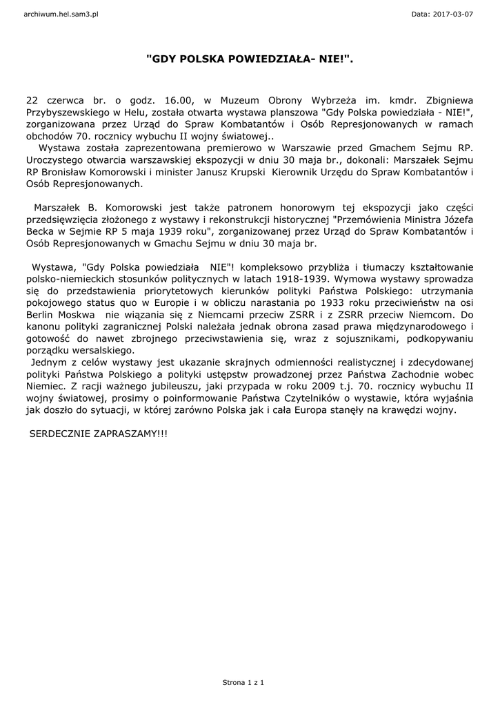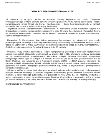 archiwum.hel.sam3.pl Data: 2017-03-07 "GDY POLSKA POWIEDZIAŁA- NIE!". 22 czerwca br. o godz. 16.00, w Muzeum Obrony Wybrzeża im. kmdr. Zbigniewa Przybyszewskiego w Helu, została otwarta wystawa planszowa "Gdy Polska powiedziała - NIE!", zorganizowana przez Urząd do Spraw Kombatantów i Osób Represjonowanych w ramach obchodów 70. rocznicy wybuchu II wojny światowej.. Wystawa została zaprezentowana premierowo w Warszawie przed Gmachem Sejmu RP. Uroczystego otwarcia warszawskiej ekspozycji w dniu 30 maja br., dokonali: Marszałek Sejmu RP Bronisław Komorowski i minister Janusz Krupski Kierownik Urzędu do Spraw Kombatantów i Osób Represjonowanych. Marszałek B. Komorowski jest także patronem honorowym tej ekspozycji jako części przedsięwzięcia złożonego z wystawy i rekonstrukcji historycznej "Przemówienia Ministra Józefa Becka w Sejmie RP 5 maja 1939 roku", zorganizowanej przez Urząd do Spraw Kombatantów i Osób Represjonowanych w Gmachu Sejmu w dniu 30 maja br. Wystawa, "Gdy Polska powiedziała NIE"! kompleksowo przybliża i tłumaczy kształtowanie polsko-niemieckich stosunków politycznych w latach 1918-1939. Wymowa wystawy sprowadza się do przedstawienia priorytetowych kierunków polityki Państwa Polskiego: utrzymania pokojowego status quo w Europie i w obliczu narastania po 1933 roku przeciwieństw na osi Berlin Moskwa nie wiązania się z Niemcami przeciw ZSRR i z ZSRR przeciw Niemcom. Do kanonu polityki zagranicznej Polski należała jednak obrona zasad prawa międzynarodowego i gotowość do nawet zbrojnego przeciwstawienia się, wraz z sojusznikami, podkopywaniu porządku wersalskiego. Jednym z celów wystawy jest ukazanie skrajnych odmienności realistycznej i zdecydowanej polityki Państwa Polskiego a polityki ustępstw prowadzonej przez Państwa Zachodnie wobec Niemiec. Z racji ważnego jubileuszu, jaki przypada w roku 2009 t.j. 70. rocznicy wybuchu II wojny światowej, prosimy o poinformowanie Państwa Czytelników o wystawie, która wyjaśnia jak doszło do sytuacji, w której zarówno Polska jak i cała Europa stanęły na krawędzi wojny. SERDECZNIE ZAPRASZAMY!!! Strona 1 z 1