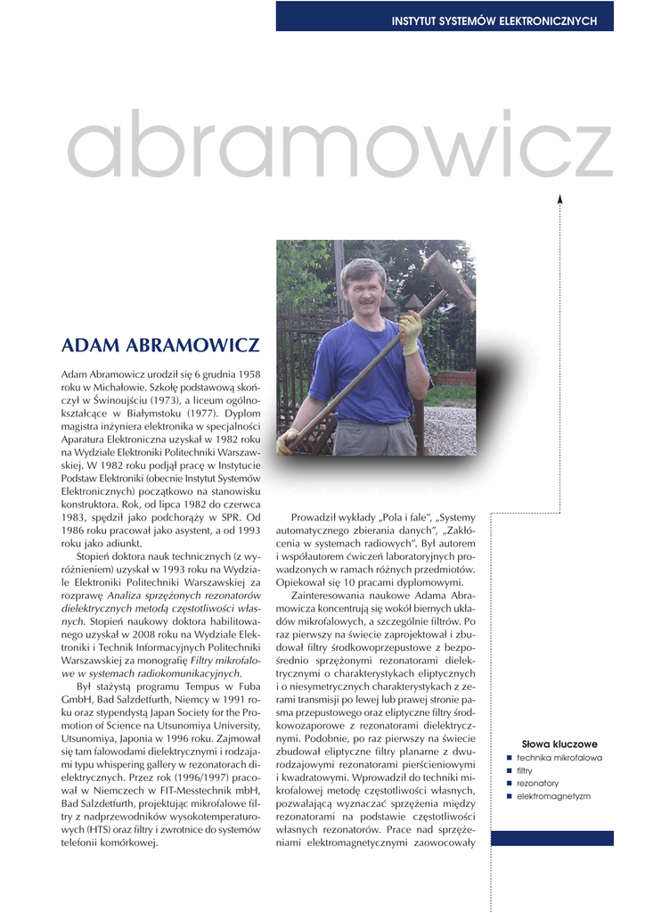 INSTYTUT SYSTEMÓW ELEKTRONICZNYCH abramowicz ADAM ABRAMOWICZ Adam Abramowicz urodzi³ siê 6 grudnia 1958 roku w Micha³owie. Szko³ê podstawow¹ skoñczy³ w Œwinoujœciu (1973), a liceum ogólnokszta³c¹ce w Bia³ymstoku (1977). Dyplom magistra in¿yniera elektronika w specjalnoœci Aparatura Elektroniczna uzyska³ w 1982 roku na Wydziale Elektroniki Politechniki Warszawskiej. W 1982 roku podj¹³ pracê w Instytucie Podstaw Elektroniki (obecnie Instytut Systemów Elektronicznych) pocz¹tkowo na stanowisku konstruktora. Rok, od lipca 1982 do czerwca 1983, spêdzi³ jako podchor¹¿y w SPR. Od 1986 roku pracowa³ jako asystent, a od 1993 roku jako adiunkt. Stopieñ doktora nauk technicznych (z wyró¿nieniem) uzyska³ w 1993 roku na Wydziale Elektroniki Politechniki Warszawskiej za rozprawê Analiza sprzê¿onych rezonatorów dielektrycznych metod¹ czêstotliwoœci w³asnych. Stopieñ naukowy doktora habilitowanego uzyska³ w 2008 roku na Wydziale Elektroniki i Technik Informacyjnych Politechniki Warszawskiej za monografiê Filtry mikrofalowe w systemach radiokomunikacyjnych. By³ sta¿yst¹ programu Tempus w Fuba GmbH, Bad Salzdetfurth, Niemcy w 1991 roku oraz stypendyst¹ Japan Society for the Promotion of Science na Utsunomiya University, Utsunomiya, Japonia w 1996 roku. Zajmowa³ siê tam falowodami dielektrycznymi i rodzajami typu whispering gallery w rezonatorach dielektrycznych. Przez rok (1996/1997) pracowa³ w Niemczech w FIT-Messtechnik mbH, Bad Salzdetfurth, projektuj¹c mikrofalowe filtry z nadprzewodników wysokotemperaturowych (HTS) oraz filtry i zwrotnice do systemów telefonii komórkowej. Prowadzi³ wyk³ady „Pola i fale”, „Systemy automatycznego zbierania danych”, „Zak³ócenia w systemach radiowych”. By³ autorem i wspó³autorem æwiczeñ laboratoryjnych prowadzonych w ramach ró¿nych przedmiotów. Opiekowa³ siê 10 pracami dyplomowymi. Zainteresowania naukowe Adama Abramowicza koncentruj¹ siê wokó³ biernych uk³adów mikrofalowych, a szczególnie filtrów. Po raz pierwszy na œwiecie zaprojektowa³ i zbudowa³ filtry œrodkowoprzepustowe z bezpoœrednio sprzê¿onymi rezonatorami dielektrycznymi o charakterystykach eliptycznych i o niesymetrycznych charakterystykach z zerami transmisji po lewej lub prawej stronie pasma przepustowego oraz eliptyczne filtry œrodkowozaporowe z rezonatorami dielektrycznymi. Podobnie, po raz pierwszy na œwiecie zbudowa³ eliptyczne filtry planarne z dwurodzajowymi rezonatorami pierœcieniowymi i kwadratowymi. Wprowadzi³ do techniki mikrofalowej metodê czêstotliwoœci w³asnych, pozwalaj¹c¹ wyznaczaæ sprzê¿enia miêdzy rezonatorami na podstawie czêstotliwoœci w³asnych rezonatorów. Prace nad sprzê¿eniami elektromagnetycznymi zaowocowa³y Słowa kluczowe n technika mikrofalowa n filtry n rezonatory n elektromagnetyzm INSTYTUT SYSTEMÓW ELEKTRONICZNYCH A równie¿ nowymi modelami sprzê¿onych rezonatorów mikrofalowych i sprzê¿onych linii transmisyjnych. Rozwin¹³ teoriê projektowania filtrów szerokopasmowych. Opracowywa³ filtry i zwrotnice mikrofalowe dla firm z Polski, Niemiec, Szwajcarii, Wielkiej Brytanii i Kanady. Zajmowa³ siê równie¿ metodami pomiarowymi w³aœciwoœci materia³ów w zakresie czêstotliwoœci mikrofalowych. Opracowa³ m.in. oryginaln¹ metodê pomiaru parametrów termicznych dielektryków metod¹ rezonatora dielektrycznego oraz jest wspó³autorem patentu na temat pomiarów parametrów ferrytów mikrofalowych. Ma du¿e doœwiadczenie w symulacjach elektromagnetycznych metodami w dziedzinie czasu i czêstotliwoœci. Adam Abramowicz jest autorem i wspó³autorem ponad 140 prac naukowych, w tym dwóch monografii o rezonatorach dielektrycznych i o filtrach mikrofalowych. Publikowa³ m.in. w: „IEEE Trans. on Microwave Theory and Techniques”, „IEEE Trans. on Applied Superconductivity”, „IEEE Antennas and Propagation Magazine”, „Microwave Journal”. Jego prace znajduj¹ siê w materia³ach licznych konferencji miêdzynarodowych m.in.: European Microwave Conference, International Microwave Symposium, Asia-Pacific Microwave Conference. Bra³ czynny udzia³ w ponad 40 konferencjach naukowych. Za swoje badania by³ wielokrotnie nagradzany. Ju¿ podczas studiów dwukrotnie otrzyma³ nagrodê Sekretarza Naukowego Wydzia³u VI Polskiej Akademii Nauk. Równie¿ dwukrotnie by³ nagradzony zespo³ow¹ Nagrod¹ Ministra Edukacji Narodowej. Czterokrotnie by³ wyró¿niany nagrodami Rektora Politechniki Warszawskiej. Ponadto otrzyma³ URSI Young Scientist Award. Jest wieloletnim cz³onkiem Intitute of Electrical and Electronics Engineers (member — 1994, senior member — 1999). Pe³ni³ funkcje sekretarza i by³ dwukrotnie wiceprzewodnicz¹cym Joint Chapter AP/AES/MTT Polskiej Sekcji IEEE. W latach 1996 –1999 by³ cz³onkiem Komitetu Krajowego URSI. Od 2008 roku jest cz³onkiem Sekcji Mikrofal, a od 2009 roku Sekcji Sygna³ów Uk³adów i Systemów Elektronicznych Komitetu Elektroniki i Telekomunikacji Polskiej Akademii Nauk. Jest sta³ym recenzentem czasopism: „IEEE Trans. on Microwave Theory and Techniques”, „IEEE Trans. on Advanced Packaging”, „IEEE Microwave and Wireless Components Letters”, „Electronics Letters”. W³ada czynnie jêzykami angielskim i rosyjskim. Jest ¿onaty i ma dwóch synów. Interesuje siê sportem i muzyk¹. Lubi czytaæ. Za osoby, które wywar³y najwiêkszy wp³yw na jego dzia³alnoœæ naukow¹, uwa¿a mgr. Jana Kowalewskiego, nauczyciela fizyki z liceum w Goleniowie, i dr. in¿. Mariana Pospieszalskieg,, promotora pracy magisterskiej.