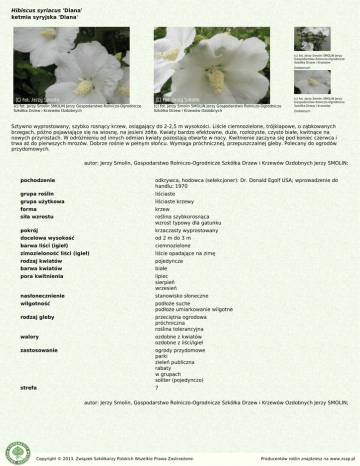 Hibiscus syriacus 'Diana' ketmia syryjska 'Diana' (c) fot. Jerzy Smolin SMOLIN Jerzy Gospodarstwo Rolniczo-Ogrodnicze Szkółka Drzew i Krzewów Ozdobnych (c) fot. Jerzy Smolin SMOLIN Jerzy Gospodarstwo Rolniczo-Ogrodnicze Szkółka Drzew i Krzewów Ozdobnych (c) fot. Jerzy Smolin SMOLIN Jerzy Gospodarstwo Rolniczo-Ogrodnicze Szkółka Drzew i Krzewów Ozdobnych (c) fot. Jerzy Smolin SMOLIN Jerzy Gospodarstwo Rolniczo-Ogrodnicze Szkółka Drzew i Krzewów Ozdobnych Sztywno wyprostowany, szybko rosnący krzew, osiągający do 2-2,5 m wysokości. Liście ciemnozielone, trójklapowe, o ząbkowanych brzegach, późno pojawiające się na wiosnę, na jesieni żółte. Kwiaty bardzo efektowne, duże, rozłożyste, czysto białe, kwitnące na nowych przyrostach. W odróżnieniu od innych odmian kwiaty pozostają otwarte w nocy. Kwitnienie zaczyna się pod koniec czerwca i trwa aż do pierwszych mrozów. Dobrze rośnie w pełnym słońcu. Wymaga próchnicznej, przepuszczalnej gleby. Polecany do ogrodów przydomowych. autor: Jerzy Smolin, Gospodarstwo Rolniczo-Ogrodnicze Szkółka Drzew i Krzewów Ozdobnych Jerzy SMOLIN; pochodzenie odkrywca, hodowca (selekcjoner): Dr. Donald Egolf USA; wprowadzenie do handlu: 1970 grupa roślin liściaste grupa użytkowa liściaste krzewy forma krzew siła wzrostu roślina szybkorosnąca wzrost typowy dla gatunku pokrój krzaczasty wyprostowany docelowa wysokość od 2 m do 3 m barwa liści (igieł) ciemnozielone zimozieloność liści (igieł) liście opadające na zimę rodzaj kwiatów pojedyncze barwa kwiatów białe pora kwitnienia lipiec sierpień wrzesień nasłonecznienie stanowisko słoneczne wilgotność podłoże suche podłoże umiarkowanie wilgotne rodzaj gleby przeciętna ogrodowa próchniczna roślina tolerancyjna walory ozdobne z kwiatów ozdobne z liści/igieł zastosowanie ogrody przydomowe parki zieleń publiczna rabaty w grupach soliter (pojedynczo) strefa 7 autor: Jerzy Smolin, Gospodarstwo Rolniczo-Ogrodnicze Szkółka Drzew i Krzewów Ozdobnych Jerzy SMOLIN; Copyright © 2013. Związek Szkółkarzy Polskich Wszelkie Prawa Zastrzeżone. Producentów roślin znajdziesz na www.zszp.pl