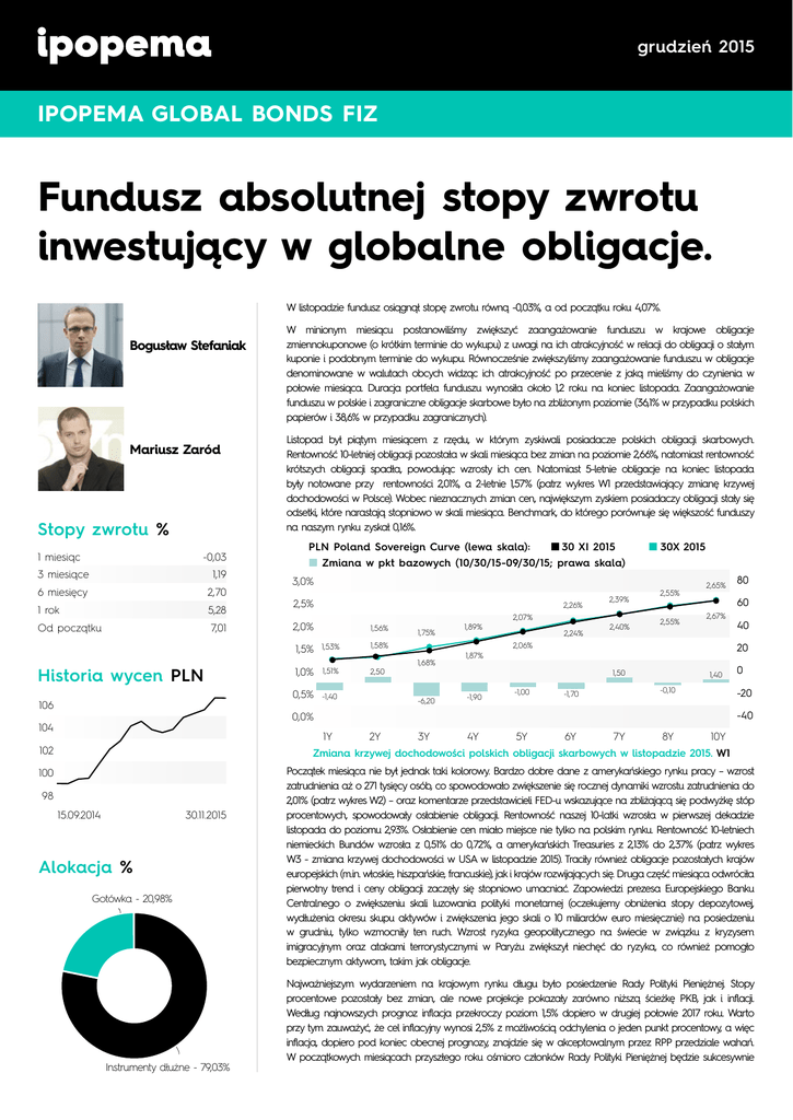grudzień 2015 IPOPEMA GLOBAL BONDS FIZ Fundusz absolutnej stopy zwrotu inwestujący w globalne obligacje. W listopadzie fundusz osiągnął stopę zwrotu równą -0,03%, a od początku roku 4,07%. Bogusław Stefaniak Mariusz Zaród Stopy zwrotu % 1 miesiąc -0,03 3 miesiące 1,19 6 miesięcy 2,70 1 rok 5,28 Od początku 7,01 Historia wycen PLN 106 W minionym miesiącu postanowiliśmy zwiększyć zaangażowanie funduszu w krajowe obligacje zmiennokuponowe (o krótkim terminie do wykupu) z uwagi na ich atrakcyjność w relacji do obligacji o stałym kuponie i podobnym terminie do wykupu. Równocześnie zwiększyliśmy zaangażowanie funduszu w obligacje denominowane w walutach obcych widząc ich atrakcyjność po przecenie z jaką mieliśmy do czynienia w połowie miesiąca. Duracja portfela funduszu wynosiła około 1,2 roku na koniec listopada. Zaangażowanie funduszu w polskie i zagraniczne obligacje skarbowe było na zbliżonym poziomie (36,1% w przypadku polskich papierów i 38,6% w przypadku zagranicznych). Listopad był piątym miesiącem z rzędu, w którym zyskiwali posiadacze polskich obligacji skarbowych. Rentowność 10-letniej obligacji pozostała w skali miesiąca bez zmian na poziomie 2,66%, natomiast rentowność krótszych obligacji spadła, powodując wzrosty ich cen. Natomiast 5-letnie obligacje na koniec listopada były notowane przy rentowności 2,01%, a 2-letnie 1,57% (patrz wykres W1 przedstawiający zmianę krzywej dochodowości w Polsce). Wobec nieznacznych zmian cen, największym zyskiem posiadaczy obligacji stały się odsetki, które narastają stopniowo w skali miesiąca. Benchmark, do którego porównuje się większość funduszy na naszym rynku zyskał 0,16%. PLN Poland Sovereign Curve (lewa skala): 30 XI 2015 Zmiana w pkt bazowych (10/30/15-09/30/15; prawa skala) 3,0% 2,5% 2,26% 2,0% 1,56% 1,5% 1,58% 1,53% 1,0% 1,51% 0,5% -1,40 2,50 1,75% 1,89% 2,07% 2,24% 2,39% 2,40% 30X 2015 2,55% 2,55% 2,65% 60 2,67% 2,06% 1,68% -6,20 1,50 -1,00 1,40 -0,10 -1,70 0 -20 -40 0,0% 104 40 20 1,87% -1,90 80 1Y 2Y 3Y 4Y 5Y 6Y 7Y 8Y 10Y 102 Zmiana krzywej dochodowości polskich obligacji skarbowych w listopadzie 2015. W1 100 Początek miesiąca nie był jednak taki kolorowy. Bardzo dobre dane z amerykańskiego rynku pracy – wzrost zatrudnienia aż o 271 tysięcy osób, co spowodowało zwiększenie się rocznej dynamiki wzrostu zatrudnienia do 2,01% (patrz wykres W2) – oraz komentarze przedstawicieli FED-u wskazujące na zbliżającą się podwyżkę stóp procentowych, spowodowały osłabienie obligacji. Rentowność naszej 10-latki wzrosła w pierwszej dekadzie listopada do poziomu 2,93%. Osłabienie cen miało miejsce nie tylko na polskim rynku. Rentowność 10-letniech niemieckich Bundów wzrosła z 0,51% do 0,72%, a amerykańskich Treasuries z 2,13% do 2,37% (patrz wykres W3 - zmiana krzywej dochodowości w USA w listopadzie 2015). Traciły również obligacje pozostałych krajów europejskich (m.in. włoskie, hiszpańskie, francuskie), jak i krajów rozwijających się. Druga część miesiąca odwróciła pierwotny trend i ceny obligacji zaczęły się stopniowo umacniać. Zapowiedzi prezesa Europejskiego Banku Centralnego o zwiększeniu skali luzowania polityki monetarnej (oczekujemy obniżenia stopy depozytowej, wydłużenia okresu skupu aktywów i zwiększenia jego skali o 10 miliardów euro miesięcznie) na posiedzeniu w grudniu, tylko wzmocniły ten ruch. Wzrost ryzyka geopolitycznego na świecie w związku z kryzysem imigracyjnym oraz atakami terrorystycznymi w Paryżu zwiększył niechęć do ryzyka, co również pomogło bezpiecznym aktywom, takim jak obligacje. 98 15.09.2014 30.11.2015 Alokacja % Gotówka - 20,98% Instrumenty dłużne - 79,03% Najważniejszym wydarzeniem na krajowym rynku długu było posiedzenie Rady Polityki Pieniężnej. Stopy procentowe pozostały bez zmian, ale nowe projekcje pokazały zarówno niższą ścieżkę PKB, jak i inflacji. Według najnowszych prognoz inflacja przekroczy poziom 1,5% dopiero w drugiej połowie 2017 roku. Warto przy tym zauważyć, że cel inflacyjny wynosi 2,5% z możliwością odchylenia o jeden punkt procentowy, a więc inflacja, dopiero pod koniec obecnej prognozy, znajdzie się w akceptowalnym przez RPP przedziale wahań. W początkowych miesiącach przyszłego roku ośmioro członków Rady Polityki Pieniężnej będzie sukcesywnie grudzień 2015 IPOPEMA GLOBAL BONDS FIZ Waluty % zastępowanych przez osoby powołane przez Prezydenta, Sejm i Senat. Z deklaracji polityków rządzącej partii wynika, że nowo powołani członkowie będą prawdopodobnie zwolennikami łagodniejszej polityki monetarnej. Listopad przyniósł kontynuację dotychczasowych tendencji w polskiej gospodarce. Produkcja przemysłowa wzrosła o 2,4% w porównaniu do października 2014 roku. Na dodatnią dynamikę produkcji wskazywały już wcześniej informacje o PMI, który od 13 miesięcy utrzymuje się powyżej neutralnego poziomu. Dane za listopad (52,1) sugerują dalszą poprawę produkcji przemysłowej. Sprzedaż detaliczna (wzrost o 3,6% rok do roku) również zaskoczyła pozytywnie analityków i inwestorów (patrz wykres W4). EUR - 0,03% USD - 38,87% PLN - 61,10% Rentowności obligacji w grudniu będą determinowane przez decyzje głównych światowych banków centralnych. Europejski Bank Centralny ma swoje posiedzenie 3 grudnia, natomiast decyzję amerykańskiej Rezerwy Federalnej poznamy w środę 16 grudnia. Oczekujemy, że mimo podniesienia stóp o 25 punktów bazowych, komunikat po posiedzeniu będzie łagodny, a dodatkowo wsparty nowymi – niższymi – projekcjami, pozwoli zachować zyski posiadaczom obligacji. Na początku przyszłego roku oczekujemy dalszego wzrostu cen obligacji w Polsce, głównie na skutek obniżek stóp procentowych przez RPP. Przy czym większe umocnienie będzie miało miejsce na krótkim końcu krzywej dochodowości (obligacje do 5 lat). Ceny dłuższych obligacji będą determinowane przez zachowa