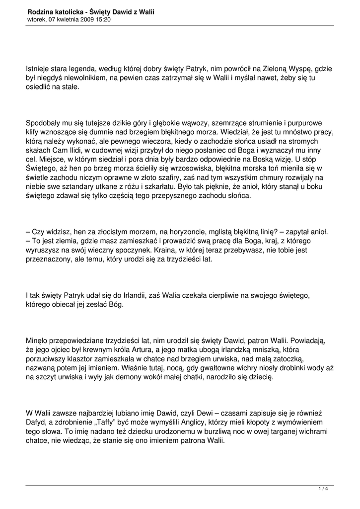 Rodzina katolicka - Święty Dawid z Walii wtorek, 07 kwietnia 2009 15:20 Istnieje stara legenda, według której dobry święty Patryk, nim powrócił na Zieloną Wyspę, gdzie był niegdyś niewolnikiem, na pewien czas zatrzymał się w Walii i myślał nawet, żeby się tu osiedlić na stałe. Spodobały mu się tutejsze dzikie góry i głębokie wąwozy, szemrzące strumienie i purpurowe klify wznoszące się dumnie nad brzegiem błękitnego morza. Wiedział, że jest tu mnóstwo pracy, którą należy wykonać, ale pewnego wieczora, kiedy o zachodzie słońca usiadł na stromych skałach Cam Ilidi, w cudownej wizji przybył do niego posłaniec od Boga i wyznaczył mu inny cel. Miejsce, w którym siedział i pora dnia były bardzo odpowiednie na Boską wizję. U stóp Świętego, aż hen po brzeg morza ścieliły się wrzosowiska, błękitna morska toń mieniła się w świetle zachodu niczym oprawne w złoto szafiry, zaś nad tym wszystkim chmury rozwijały na niebie swe sztandary utkane z różu i szkarłatu. Było tak pięknie, że anioł, który stanął u boku świętego zdawał się tylko częścią tego przepysznego zachodu słońca. – Czy widzisz, hen za złocistym morzem, na horyzoncie, mglistą błękitną linię? – zapytał anioł. – To jest ziemia, gdzie masz zamieszkać i prowadzić swą pracę dla Boga, kraj, z którego wyruszysz na swój wieczny spoczynek. Kraina, w której teraz przebywasz, nie tobie jest przeznaczony, ale temu, który urodzi się za trzydzieści lat. I tak święty Patryk udał się do Irlandii, zaś Walia czekała cierpliwie na swojego świętego, którego obiecał jej zesłać Bóg. Minęło przepowiedziane trzydzieści lat, nim urodził się święty Dawid, patron Walii. Powiadają, że jego ojciec był krewnym króla Artura, a jego matka ubogą irlandzką mniszką, która porzuciwszy klasztor zamieszkała w chatce nad brzegiem urwiska, nad małą zatoczką, nazwaną potem jej imieniem. Właśnie tutaj, nocą, gdy gwałtowne wichry niosły drobinki wody aż na szczyt urwiska i wyły jak demony wokół małej chatki, narodziło się dziecię. W Walii zawsze najbardziej lubiano imię Dawid, czyli Dewi – czasami zapisuje się je również Dafyd, a zdrobnienie „Taffy” być może wymyślili Anglicy, którzy mieli kłopoty z wymówieniem tego słowa. To imię nadano też dziecku urodzonemu w burzliwą noc w owej targanej wichrami chatce, nie wiedząc, że stanie się ono imieniem patrona Walii. 1/4 Rodzina katolicka - Święty Dawid z Walii wtorek, 07 kwietnia 2009 15:20 Jak inne dzieci, które dorastają dzikie i wolne jak ptaki, tak i Dawid wyrósł na silnego i wytrzymałego chłopca. Nauczył się wspinać na skały jak młody koziołek, a jego życie upływało na dworze: niebo służyło mu za dach nad głową, a pachnąca tymiankiem trawa za dywan. Ale te czasy minęły, gdy dorósł, ponieważ wysłano go do szkoły klasztornej. Paulinus, jego nauczyciel, pokochał chłopca z całego serca, stwierdziwszy, że jest on bystry i szybko się uczy. W starych legendach o życiu świętego Dawida niewiele można znaleźć informacji o jego dzieciństwie, ale wiadomo, że „wyrósł na pełnego wdzięku i przystojnego młodzieńca. Uczył się w szkole psalmów, miał lekcje przez cały rok, uczestniczył też w Mszy i Komunii świętej; a jego koledzy ze szkoły widzieli na jego wargach gołębicę o złotym dziobie, śpiewającą hymny na cześć Pana”. Nieskalane wargi, których nigdy nie zbrukało brzydkie słowo, uprzejma mowa, która zmieniała wrogów w przyjaciół, prawda i honor, to wszystko zauważali u młodego Dawida jego towarzysze, i być może dlatego mówili o siedzącej na jego wargach gołębicy o złotym dziobie. Kiedy Dawid dorósł i został przełożonym klasztoru, czekały go ciężkie czasy. Walię raz po raz plądrowali najeźdźcy, a wielu tutejszych bardów i plemiennych wodzów nienawidziło chrześcijaństwa i uważało Dawida za wroga. W tym kraju równie mocno jak miecz kochano muzykę i poezję, a bardowie byli nauczycielami ludu i poetami, którzy śpiewali o wielkich czynach herosów i pięknym wierszem opiewali ich klęski i zwycięstwa. Dlatego tak ważnym zadaniem było pozyskanie tych pieśniarzy dla służby Chrystusa, a Dawid uznał za swe wielkie zwycięstwo moment, kiedy wysłuchali jego nauk i zapragnęli wstąpić na służbę Pana. Klasztory witały ich chętnie, wiedząc, że muzyka ich harf wznosić będzie ludzkie dusze ku niebu. I tak sztandar Chrystusa załopotał triumfalnie nad Walią, a Dawid zakładał liczne klasztory, które dawały schronienie ludziom gotowym służyć pod tym sztandarem. W owych czasach życie zakonników nie było łatwe, a reguła świętego Dawida była wyjątkowo surowa. Tylko ci, którzy szczerze pragnęli trudzić się dla Boga, znajdowali upodobanie w takim życiu. Szorstkie i niewygodne ubrania szyto ze skór zwierząt, jedzenie było bardzo proste, a praca trwała od rana do wieczora. Jednak naśladowcy Dawida znosili takie życie z radością. Z każdą porą dnia wiązały się jakieś obowiązki: albo modlitwa, albo ciężka praca na polach. Zamiast wołów czy koni mnisi sami zakładali na siebie uprząż i orali ziemię, cierpliwie wykonując powierzone im zadanie. Mimo takich trudów miłość do piękna, muzyki i poezji nigdy nie zaginęła wśród tych prostych 2/4 Rodzina katolicka - Święty Dawid z Walii wtorek, 07 kwietnia 2009 15:20 mnichów, a przeciwnie, stawała się coraz silniejsza. Nade wszystko kochali jedną rzecz, kopiowanie Pisma Świętego, a każdy pragnął by jego kopia była piękna i niezwykła. Tak bardzo ukochali tę pracę, że trzeba było wprowadzić specjalną regułę, która nakazywała, by gdy tylko rozlegnie się dzwon bracia natychmiast przerywali pracę, porzucając w połowie zdania, a nawet wyrazy. Gdyż natychmiastowe posłuszeństwo było jedną z pierwszych rzeczy, jakiej uczyli się mnisi Dawida, i to właśn