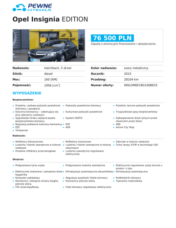 Opel Insignia EDITION 76 500 PLN Zapytaj o promocyjne finansowanie i ubezpieczenie. Nadwozie: hatchback, 5 drzwi Kolor nadwozia: szary metaliczny Silnik: diesel Rocznik: 2015 Moc: 160 [KM] Przebieg: 28104 km Pojemność: 1956 [cm ] Numer oferty: W0LGM6E18G1008633 3 WYPOSAŻENIE Bezpieczeństwo: Przednie, czołowe poduszki powietrzne (kierowcy i pasażera) Kolumna kierownicy – załamująca się przy zderzeniu czołowym Sygnalizator braku zapięcia pasów bezpieczeństwa kierowcy Regulacja położenia kolumny kierownicy ESC Tempomat Poduszka powietrzna kierowcy Przednie, boczne poduszki powietrzne Kurtynowe poduszki powietrzne Trzypunktowe pasy bezpieczeństwa System ISOFIX Zabezpieczenie drzwi tylnych przed otwarciem przez dzieci ABS Active City Stop ESP ASR Nadwozie: Reflektory biksenonowe Lusterka i klamki zewnętrzne w kolorze nadwozia Przednie reflektory przeciwmgłowe Reflektory ksenonowe Lusterka i klamki zewnętrzne w kolorze satynowym Lusterka zewnętrzne regulowane elektrycznie Zderzaki w kolorze nadwozia Tylne lampy STOP w technologii LED Podgrzewana tylna szyba Podgrzewane lusterka zewnętrzne Elektrycznie otwierane / zamykane drzwi bagażnika Komputer pokładowy Kierownica i dźwignia zmiany biegów pokryte skórą Filtr przeciwpyłkowy Klimatyzacja automatyczna dwustrefowa Elektrycznie regulowane szyby boczne z przodu i z tyłu Klimatyzacja automatyczna Regulacja wysokości fotela kierowcy Kierownica pokryta skórą Podłokietnik kierowcy Tapicerka materiałowa Wnętrze: Fotel kierowcy regulowany elektrycznie Opel Insignia EDITION Technologia: Wspomaganie układu kierowniczego Radioodtwarzacz CD / MP3 Czujnik ciśnienia w oponach Asystent zmiany biegu Przycisk Start/Stop Centralny zamek sterowany pilotem Sterowanie systemem audio przyciskami na kierownicy Czujnik zmierzchu Automatyczne światła z funkcją follow me home Automatycznie ściemniające się lusterko wsteczne Tylne czujniki parkowania Czujnik deszczu Zestaw głośnomówiący Bluetooth System Start/Stop Eco Mode Światła awaryjnego hamowania DODATKOWE INFORMACJE: WESTMOTOR GRUPA PGD Autoryzowany dealer marki Opel wchodzący w skład sieci Pewne Używane. Zapraszamy do kontaktu z naszymi doradcami: +48 667 071 265 +48 6670741 266 +48 61 610 41 02 Na samochód wystawiamy fakturę VAT 23%. Kupujący nie ponosi opłaty skarbowej. Możliwość odliczenia VAT przy zakupie na firmę. Oferujemy korzystne formy finansowania zakupu samochodu oraz ubezpieczenia komunikacyjne. Miejsce ekspozycji: Autoryzowany Dealer Opel WESTMOTOR Grupa PGD ul. Obornicka 125 62-002 Suchy Las GPS: 52°28'37.4"N 16°52'12.9"E Pewne Używane Poznań, Suchy Las ul. Obornicka 125, tel.:61 610 41 02 www.blog.pgd.pl Nota prawna Dane zawarte w niniejszej propozycji handlowej mają wyłącznie charakter informacyjny. Podane informacje nie stanowią oferty ani zapewnienia, w szczególności w rozumieniu art. 66 § 1 oraz art. 5561 Kodeksu cywilnego. Wiążące ustalenie ceny, wyposażenia oraz specyfikacji samochodu następuje w pisemnej umowie sprzedaży/zamówienia samochodu. Ze względu na ograniczenia techniczne (np. odwzorowanie kolorów przez monitor lub sposób wydruku), kolory przedstawione w niniejszej propozycji handlowej mogą się różnić od rzeczywistych kolorów nadwozia i tapicerki. Niniejsza propozycja handlowa oraz wszelkie załączniki z nią związane są poufne i nie mogą być przekazywane osobom trzecim. Prezentowane zdjęcia mogą zawierać wyposażenie opcjonalne (akcesoryjne), dodatkowo płatne. Warunki oferty maja charakter orientacyjny i mogą zostać zmienione w momencie uaktualnienia cen lub warunków promocji.