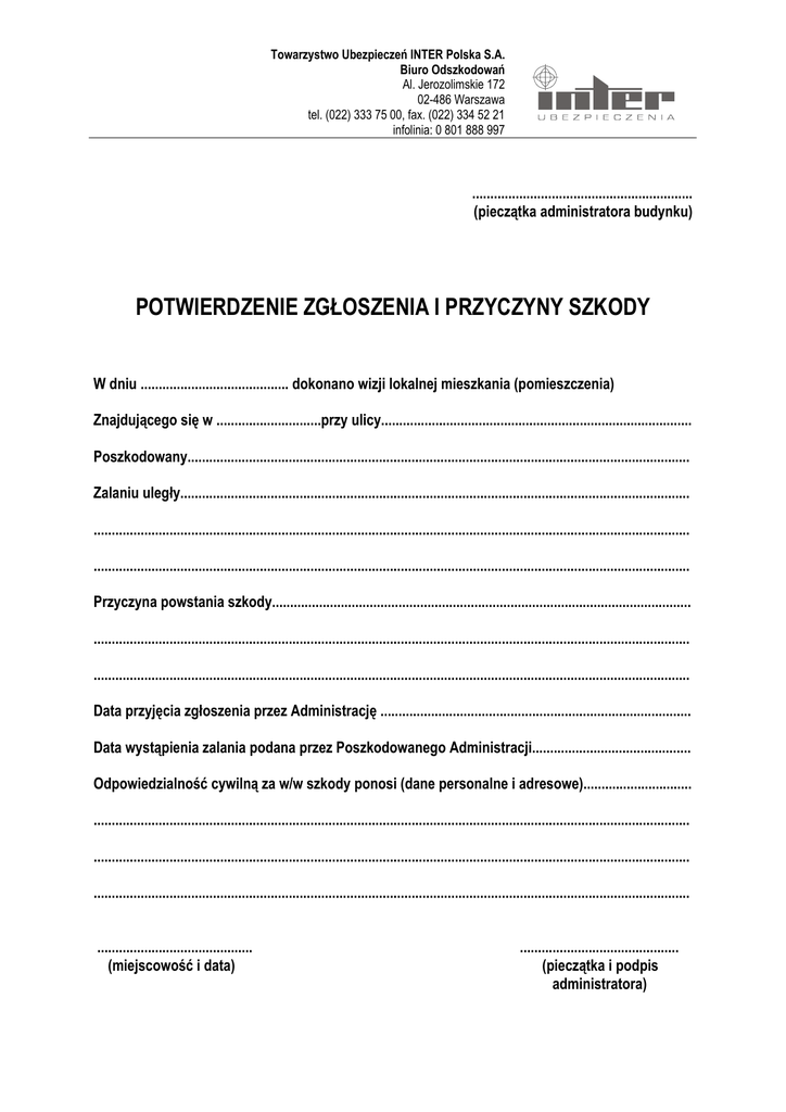 Towarzystwo Ubezpieczeń INTER Polska S.A. Biuro Odszkodowań Al. Jerozolimskie 172 02-486 Warszawa tel. (022) 333 75 00, fax. (022) 334 52 21 infolinia: 0 801 888 997 ............................................................. (pieczątka administratora budynku) POTWIERDZENIE ZGŁOSZENIA I PRZYCZYNY SZKODY W dniu ......................................... dokonano wizji lokalnej mieszkania (pomieszczenia) Znajdującego się w .............................przy ulicy...................................................................................... Poszkodowany........................................................................................................................................... Zalaniu uległy............................................................................................................................................. ..................................................................................................................................................................... ..................................................................................................................................................................... Przyczyna powstania szkody.................................................................................................................... ..................................................................................................................................................................... ..................................................................................................................................................................... Data przyjęcia zgłoszenia przez Administrację ...................................................................................... Data wystąpienia zalania podana przez Poszkodowanego Administracji............................................ Odpowiedzialność cywilną za w/w szkody ponosi (dane personalne i adresowe).............................. ..................................................................................................................................................................... ..................................................................................................................................................................... ..................................................................................................................................................................... ........................................... (miejscowość i data) ............................................ (pieczątka i podpis administratora)