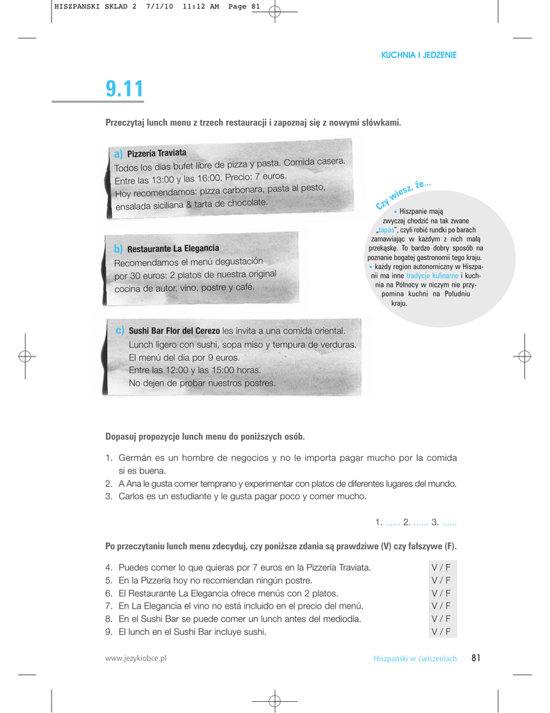 HISZPANSKI SKLAD 2 7/1/10 11:12 AM Page 81 KUCHNIA I JEDZENIE 9.11 Przeczytaj lunch menu z trzech restauracji i zapoznaj si´ z nowymi s∏ówkami. Pizzería Traviata y pasta. Comida casera. Todos los días bufet libre de pizza 7 euros. Entre las 13:00 y las 16:00. Precio: ra, pasta al pesto, Hoy recomendamos: pizza carbona te. ensalada siciliana & tarta de chocola a) Restaurante La Elegancia Recomendamos el menú degustación por 30 euros: 2 platos de nuestra original cocina de autor, vino, postre y café. b) c) y Cz , ˝e.. e sz i w . Hiszpanie majà zwyczaj chodziç na tak zwane „tapas”, czyli robiç rundki po barach zamawiajàc w ka˝dym z nich ma∏à przekàsk´. To bardzo dobry sposób na poznanie bogatej gastronomii tego kraju. ka˝dy region autonomiczny w Hiszpanii ma inne tradycje kulinarne i kuchnia na Pó∏nocy w niczym nie przypomina kuchni na Po∏udniu kraju. Sushi Bar Flor del Cerezo les invita a una comida oriental. Lunch ligero con sushi, sopa miso y tempura de verduras. El menú del día por 9 euros. Entre las 12:00 y las 15:00 horas. No dejen de probar nuestros postres. Dopasuj propozycje lunch menu do poni˝szych osób. 1. Germán es un hombre de negocios y no le importa pagar mucho por la comida si es buena. 2. A Ana le gusta comer temprano y experimentar con platos de diferentes lugares del mundo. 3. Carlos es un estudiante y le gusta pagar poco y comer mucho. 1. ...... 2. ...... 3. ...... Po przeczytaniu lunch menu zdecyduj, czy poni˝sze zdania sà prawdziwe (V) czy fa∏szywe (F). 4. 5. 6. 7. 8. 9. Puedes comer lo que quieras por 7 euros en la Pizzería Traviata. En la Pizzería hoy no recomiendan ningún postre. El Restaurante La Elegancia ofrece menús con 2 platos. En La Elegancia el vino no está incluido en el precio del menú. En el Sushi Bar se puede comer un lunch antes del mediodía. El lunch en el Sushi Bar incluye sushi. www.jezykiobce.pl V V V V V V / / / / / / F F F F F F Hiszpaƒski w çwiczeniach 81 HISZPANSKI SKLAD 2 7/1/10 11:12 AM Page 82 KUCHNIA I JEDZENIE 9.12 Po∏àcz zwroty i wyra˝enia hiszpaƒskie z ich polskimi odpowiednikami. 1. pasarse con la comida a) przekàsiç coÊ 2. hacer la digestión b) iÊç coÊ przekàsiç do baru 3. estar a régimen c) zatrzymywaç sobie reszt´ 4. comer fuera d) trawiç 5. hacer de pinche e) jeÊç poza domem 6. picar algo f) p∏aciç na pó∏ 7. ir de tapas g) robiç za pomoc kuchennà 8. quedarse la vuelta h) byç na diecie 9. pagar a escote i) przesadziç z jedzeniem 10. ser un cocinitas j) lubiç gotowaç, dobrze si´ czuç w kuchni 1. ..... 2. ..... 3. ..... 4. ..... 5. ..... 6. ..... 7. ..... 8. ..... 9. ..... 10. ..... 9.13 Po zapoznaniu si´ ze s∏ownictwem z çwiczenia 9.12 uzupe∏nij podane zdania odpowiednimi wyrazami. 1. Me gusta la costumbre española de ir ........................................ . 2. Marisa está siempre ........................................ , pero nunca adelgaza. 3. Jesús es un ........................................ . Le gusta inventarse platos originales. 4. Tengo hambre. ¿Vamos a ........................................ algo? 5. ¿Me puedes hacer ........................................ ? Corta estos tomates, por favor. 6. ¿Pagamos ........................................ o me invitas? 7. Ahora voy a descansar y hacer la ........................................ después de esta comida. 8. El camarero es un caradura. Se ha quedado ........................................ sin decir nada. 9. Mañana vamos a comer ........................................ . No tengo ganas de cocinar. 10. Te has pasado con ........................................ . No deberías comer tanto. 82 Hiszpaƒski w çwiczeniach