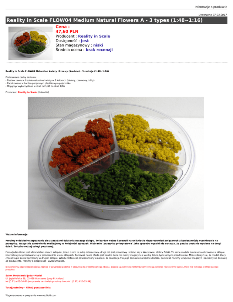 Informacje o produkcie Utworzono 07-03-2017 Reality in Scale FLOW04 Medium Natural Flowers A - 3 types (1:48~1:16) Cena : 47,60 PLN Producent : Reality in Scale Dostępność : Jest Stan magazynowy : niski Średnia ocena : brak recenzji Reality in Scale FLOW04 Naturalne kwiaty i krzewy (średnie) - 3 rodzaje (1:48~1:16) Podstawowe cechy zestawu: - Zestaw zawiera średnie naturalne kwiaty w 3 kolorach (zielony, czerwony, żółty) - Zapakowane w bardzo poręcznym plastikowym pojemniku - Mogą być wykorzystane w skali od 1/48 do skali 1/16 Producent: Reality in Scale (Holandia) Ważne informacje: Prosimy o dokładne zapoznanie się z zasadami działania naszego sklepu. To bardzo ważne i pozwoli na uniknięcie nieporozumień związanych z koniecznością oczekiwania na przesyłkę. Wszystkie zamówienia realizujemy w kolejności zgłoszeń. Wybranie "przesyłka priorytetowa" jako sposobu wysyłki nie oznacza, że paczka zostanie wysłana na drugi dzień. To tylko rodzaj usługi pocztowej. Firma Jadar-Model jest właścicielem dwóch sklepów. Jeden z nich to sklep internetowy, drugi zaś jest prawdziwy i mieści się w Warszawie, stolicy Polski. Te same modele i akcesoria oferowane w sklepie internetowym sprzedawane są w jednocześnie w obu sklepach. Ponieważ nasza oferta jest bardzo duża nie mamy magazynu z wielką ilością tych samych przedmiotów. Może zdarzyć się, że model, który chcesz kupić został sprzedany w drugim sklepie. Wtedy zostaniesz powiadomiony emailem, że realizacja Twojego zamówienia będzie dłuższa, ponieważ musimy uzupełnić magazyn i czekamy na dostawę od producenta. Prosimy o cierpliwość i wyrozumiałość. Nie ponosimy odpowiedzialności za różnicę w zawartości pudełka w stosunku do prezentowanego zdjęcia. Zdjęcia są zazwyczaj reklamówkami i mogą zawierać również inne części, które nie wchodzą w skład danego produktu. Salon Modelarski Jadar-Model Ul. Jagiellońska 58, 03-468 Warszawa (przy Pl.Hallera) tel.(0 22) 403-34-30 (w sprawie zamówień prosimy dzwonić: (0 22) 620-05-39) Tutaj jesteśmy - kliknij poniższy link: Wygenerowano w programie www.oscGold.com Warszawa, Jagiellońska 58 sklep jest czynny w godz.: pon.-pt. 11.oo 19.oo sobota 10.oo 14.oo