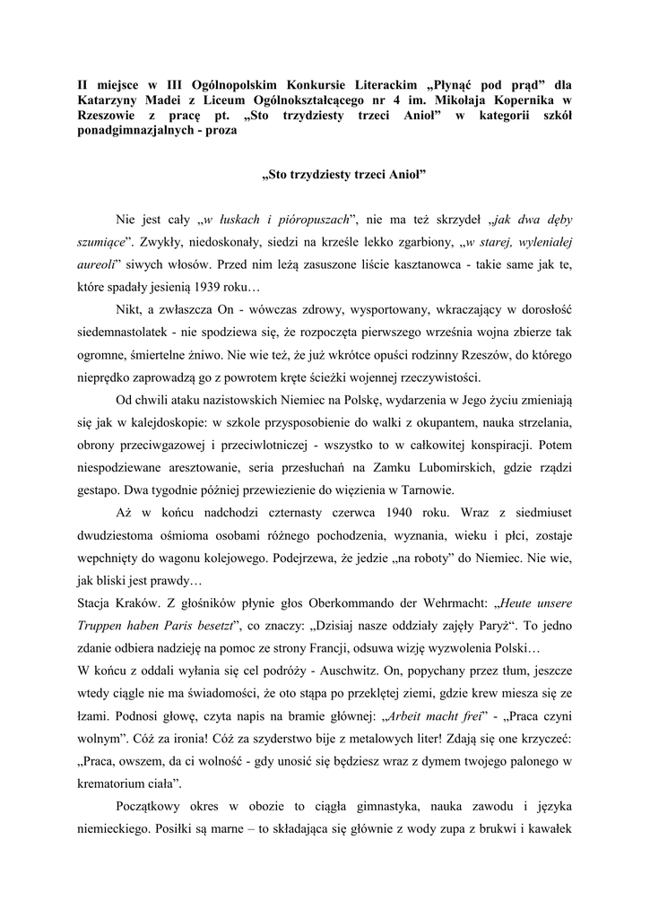 II miejsce w III Ogólnopolskim Konkursie Literackim „Płynąć pod prąd” dla Katarzyny Madei z Liceum Ogólnokształcącego nr 4 im. Mikołaja Kopernika w Rzeszowie z pracę pt. „Sto trzydziesty trzeci Anioł” w kategorii szkół ponadgimnazjalnych - proza „Sto trzydziesty trzeci Anioł” Nie jest cały „w łuskach i pióropuszach”, nie ma też skrzydeł „jak dwa dęby szumiące”. Zwykły, niedoskonały, siedzi na krześle lekko zgarbiony, „w starej, wyleniałej aureoli” siwych włosów. Przed nim leżą zasuszone liście kasztanowca - takie same jak te, które spadały jesienią 1939 roku… Nikt, a zwłaszcza On - wówczas zdrowy, wysportowany, wkraczający w dorosłość siedemnastolatek - nie spodziewa się, że rozpoczęta pierwszego września wojna zbierze tak ogromne, śmiertelne żniwo. Nie wie też, że już wkrótce opuści rodzinny Rzeszów, do którego nieprędko zaprowadzą go z powrotem kręte ścieżki wojennej rzeczywistości. Od chwili ataku nazistowskich Niemiec na Polskę, wydarzenia w Jego życiu zmieniają się jak w kalejdoskopie: w szkole przysposobienie do walki z okupantem, nauka strzelania, obrony przeciwgazowej i przeciwlotniczej - wszystko to w całkowitej konspiracji. Potem niespodziewane aresztowanie, seria przesłuchań na Zamku Lubomirskich, gdzie rządzi gestapo. Dwa tygodnie później przewiezienie do więzienia w Tarnowie. Aż w końcu nadchodzi czternasty czerwca 1940 roku. Wraz z siedmiuset dwudziestoma ośmioma osobami różnego pochodzenia, wyznania, wieku i płci, zostaje wepchnięty do wagonu kolejowego. Podejrzewa, że jedzie „na roboty” do Niemiec. Nie wie, jak bliski jest prawdy… Stacja Kraków. Z głośników płynie głos Oberkommando der Wehrmacht: „Heute unsere Truppen haben Paris besetzt”, co znaczy: „Dzisiaj nasze oddziały zajęły Paryż“. To jedno zdanie odbiera nadzieję na pomoc ze strony Francji, odsuwa wizję wyzwolenia Polski… W końcu z oddali wyłania się cel podróży - Auschwitz. On, popychany przez tłum, jeszcze wtedy ciągle nie ma świadomości, że oto stąpa po przeklętej ziemi, gdzie krew miesza się ze łzami. Podnosi głowę, czyta napis na bramie głównej: „Arbeit macht frei” - „Praca czyni wolnym”. Cóż za ironia! Cóż za szyderstwo bije z metalowych liter! Zdają się one krzyczeć: „Praca, owszem, da ci wolność - gdy unosić się będziesz wraz z dymem twojego palonego w krematorium ciała”. Początkowy okres w obozie to ciągła gimnastyka, nauka zawodu i języka niemieckiego. Posiłki są marne – to składająca się głównie z wody zupa z brukwi i kawałek chleba. Widok trupów, zmaganie się ze słabościami ciała i poranioną, tęskniącą za domem duszą, są tu na porządku dziennym. Ale On nie pozwala sobie na zwątpienie, ciągle, uparcie wierzy, że odzyska wolność, że dane Mu będzie ujrzeć matkę, ojca, rodzeństwo. Pomimo strachu, pomimo urągających godności warunków, niezłomnie trwa w walce o przeżycie, idzie przed siebie „wyprostowany pośród tych, którzy na kolanach, wśród odwróconych plecami, obalonych w proch”. Wciąż zostaje c z ł o w i ek i e m, wierząc, iż tylko przez człowieczeństwo, przez zdolność do pomocy drugiemu, można ocenić czyjąś wartość, zachować szacunek do samego siebie. Pewnego dnia z Jego bloku ucieka więzień. Procedura w takich wypadkach jest standardowa: dziesięciu spośród współwięźniów dezertera zostaje wysłanych do bunkra głodowego. Stojąc w szeregu na apelu, nikt nie wie, dla kogo ta zbiórka będzie ostatnią. Zazwyczaj biorą chorych, niezdatnych do pracy. Po Jego plecach przechodzą ciarki, dopiero opuścił szpital obozowy, potocznie nazywany rewirem, Jego ciało jest wyniszczone, bark zwichnięty - na takich jak On mówi się tu „muzułman”. Kiedy Lagerführer nazwiskiem Fritsch zatrzymuje wzrok na Jego twarzy, pojmuje, co oznacza powiedzenie: „Spojrzeć śmierci w oczy”. Te miały zimny, stalowy odcień. A jednak to nie była Jego kolej. Los daruje Mu kilka chwil życia więcej. Lecz nie każdy ma tyle szczęścia. Jeden z więźniów, wybrany przez SS-mana na stracenie, pada na kolana i prosi o łaskę: „Mam żonę, dzieci... Proszę darować mi życie” - mówi błagalnym tonem. Wówczas z szeregu występuje inny więzień, podchodzi do Niemca i ze spokojem proponuje: „Proszę odesłać tego człowieka, ja za niego pójdę na głodówkę”. Ku zdumieniu wszystkich, Fritsch przystaje na tę propozycję. Zamiast Franciszka Gajowniczka do bunkra trafia ksiądz Kolbe… A On… On patrzy na to, umacniając się w swej wierze, iż dobro zwycięży. Widzi, jak na Jego oczach człowiek staje się święty. „Świat nie zniesie dłużej tego, co robią Niemcy” myśli, i ta myśl podnosi Go na duchu, pozwala wspierać towarzyszy niedoli, dzielić się nadzieją, która jest tu równie potrzebna jak chleb. Krótko po przewiezieniu do Birkenau, oddalonego od Auschwitz o kilka kilometrów, trafia do kierownika obozu na przesłuchanie jako podejrzany o pomoc w ucieczce jednego z tamtejszych więźniów. Zapytany, dlaczego nie zawiadomił nikogo o dezercji współwięźnia, odpowiada hardo, patrząc w oczy mężczyźnie: „Herr Lagerführer, wenn ich wüsste, dass er fluhen will, wäre mit ihm geflohen”, co oznaczało: „Panie kierowniku, gdybym wiedział, że on chce uciec, uciekłbym razem z nim”. SS-man patrzy na Niego zdumiony - mało kto pozwala sobie na taką bezczelność, za którą grozi rozstrzelanie. Nie wiadomo więc, co kieruje Niemcem - szok spowodowany nieoczekiwaną szczerością przesłuchiwanego, czy litość - gdy po dłuższej chwili milczenia rozkazuje Polakowi odejść do obozu słowami: „Hau ab ins Lager”. Wyzwolenie przyszło piętnastego kwietnia 1945 roku, kiedy to do Bergen-Belsen wkroczył 63. Pułk Artylerii Przeciwpancernej podpułkownika Richarda Taylora z brytyjskiej 11. Dywizji Pancernej. Wreszcie jest wolny! Bra