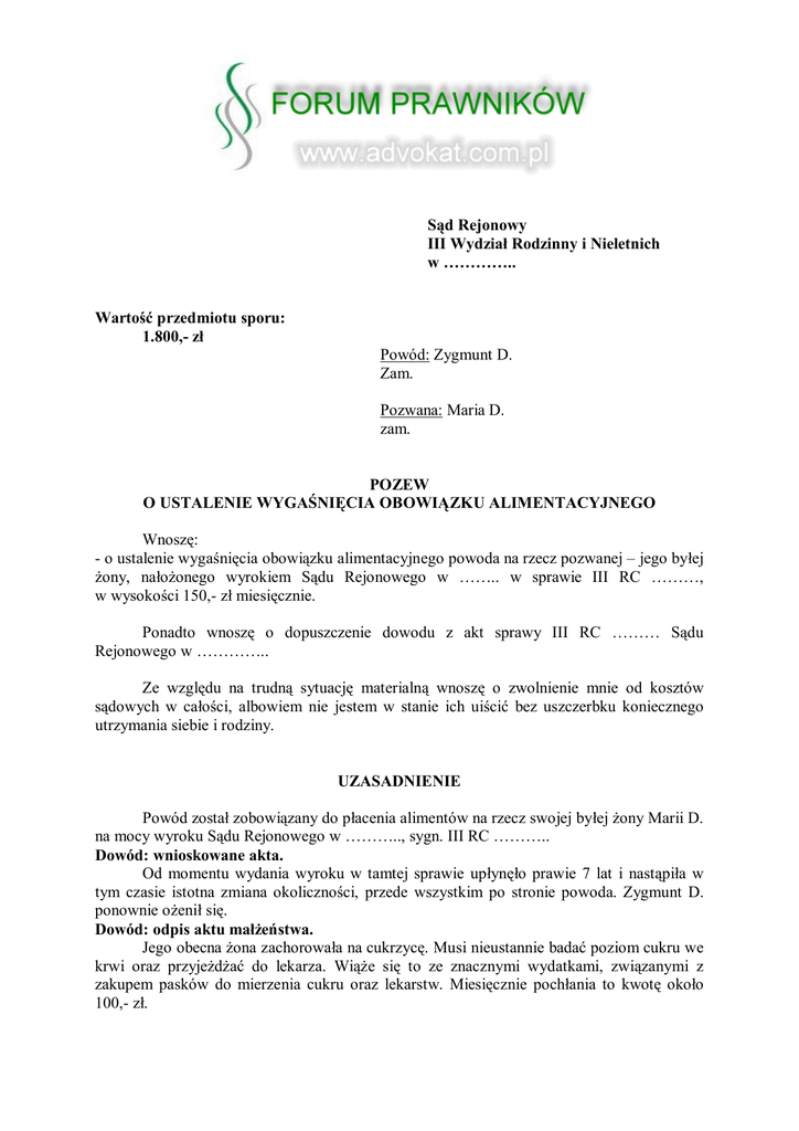 Sąd Rejonowy III Wydział Rodzinny i Nieletnich w ………….. Wartość przedmiotu sporu: 1.800,- zł Powód: Zygmunt D. Zam. Pozwana: Maria D. zam. POZEW O USTALENIE WYGAŚNIĘCIA OBOWIĄZKU ALIMENTACYJNEGO Wnoszę: - o ustalenie wygaśnięcia obowiązku alimentacyjnego powoda na rzecz pozwanej – jego byłej żony, nałożonego wyrokiem Sądu Rejonowego w …….. w sprawie III RC ………, w wysokości 150,- zł miesięcznie. Ponadto wnoszę o dopuszczenie dowodu z akt sprawy III RC ……… Sądu Rejonowego w ………….. Ze względu na trudną sytuację materialną wnoszę o zwolnienie mnie od kosztów sądowych w całości, albowiem nie jestem w stanie ich uiścić bez uszczerbku koniecznego utrzymania siebie i rodziny. UZASADNIENIE Powód został zobowiązany do płacenia alimentów na rzecz swojej byłej żony Marii D. na mocy wyroku Sądu Rejonowego w ……….., sygn. III RC ……….. Dowód: wnioskowane akta. Od momentu wydania wyroku w tamtej sprawie upłynęło prawie 7 lat i nastąpiła w tym czasie istotna zmiana okoliczności, przede wszystkim po stronie powoda. Zygmunt D. ponownie ożenił się. Dowód: odpis aktu małżeństwa. Jego obecna żona zachorowała na cukrzycę. Musi nieustannie badać poziom cukru we krwi oraz przyjeżdżać do lekarza. Wiąże się to ze znacznymi wydatkami, związanymi z zakupem pasków do mierzenia cukru oraz lekarstw. Miesięcznie pochłania to kwotę około 100,- zł. Żona powoda Danuta D. nigdzie nie pracuje, nie posiada prawa do zasiłku. Rodzina utrzymuje się wyłącznie z pensji powoda w wysokości 998,10 netto miesięcznie. Dowód: zaświadczenie o zarobkach. Z kwoty tej potrącana jest od razu rata zaciągniętej pożyczki w zakładzie pracy (150 zł) oraz egzekwowane alimenty. Do wypłaty pozostaje kwota ok. 561,- zł. Dowód: wyszczególnienie składników wynagrodzenia. Stałe wydatki powoda obejmują opłaty za energię elektryczną (ok.50,- zł miesięcznie), gaz (40 zł), wodę (50 zł), koszty dojazdu do pracy (bilet miesięczny 109 zł). Dowód: kserokopie rachunków. Dodatkowo dochodzą koszty ogrzania domu – przez okres zimowy zużywa się 2,5 tony węgla (jest to koszt około 1.200,- zł), co powoduje, że powód musi co miesiąc przez cały rok odkładać po ok.100,- zł na ogrzewanie. Reasumując stwierdzić należy, że z otrzymywanej co miesiąc kwoty 561 zł powód dokonuje opłat o łącznej wartości 350,- zł oraz pokrywa koszty leczenia żony (100 zł) i jej dojazdy do lekarza do ……….. (jednorazowy bilet 7 zł). Powodowi nie pozostają żadne środki do życia, żyje poniżej wszelkich standardów, brakuje mu pieniędzy na żywność. Obowiązek alimentacyjny jest warunkowany z jednej strony usprawiedliwionymi potrzebami uprawnionego, z drugiej – możliwościami zarobkowymi i majątkowymi zobowiązanego. Powód nie dysponuje środkami, które pozwoliłyby mu płacić alimenty. W związku z powyższym powództwo jest uzasadnione. Jednocześnie przedstawione wyżej okoliczności uzasadniają wniosek o zwolnienie powoda od kosztów sądowych w całości. Zygmunt D. Załączniki: - zaświadczenie o dochodach - wyszczególnienie składników wynagrodzenia - odpis aktu małżeństwa - zaświadczenie lekarskie - zaświadczenie o zakupie aparatu do mierzenia cukru we krwi - kserokopia biletu miesięcznego - zaświadczenie Urzędu Pracy - rachunki za wodę, energię elektryczną