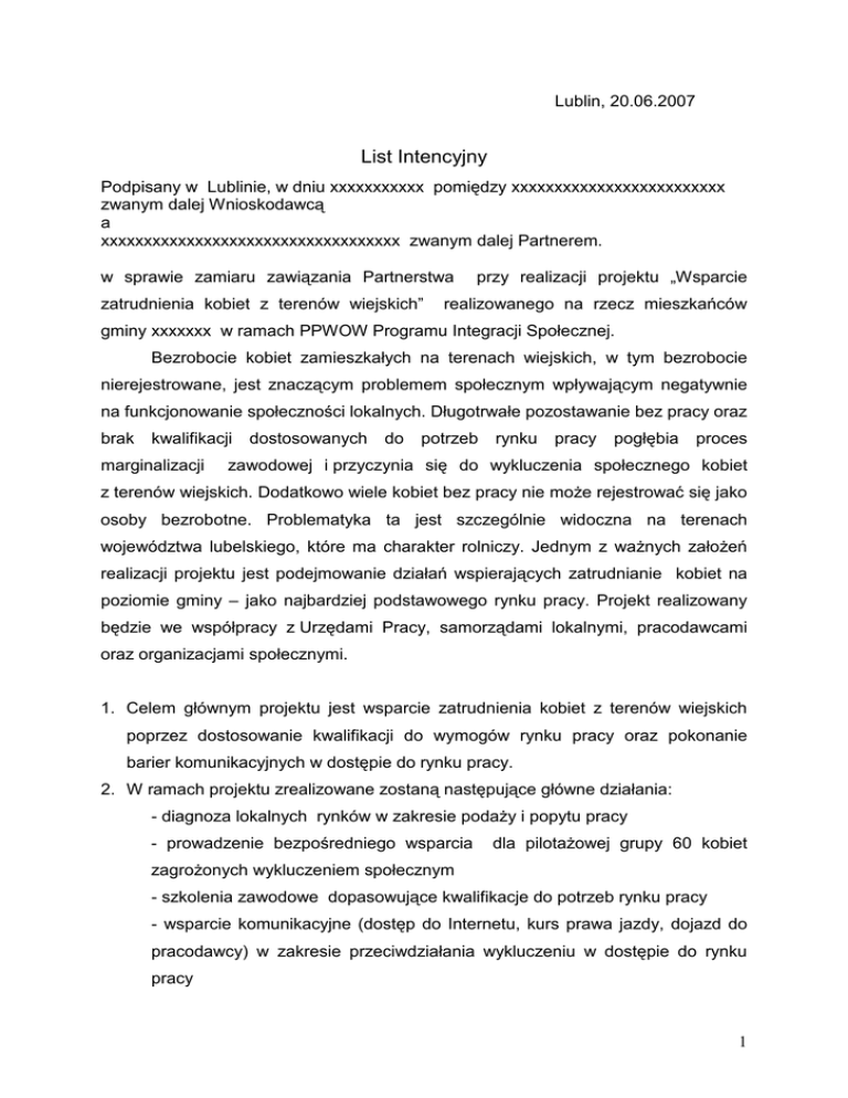 Lublin, 20.06.2007 List Intencyjny Podpisany w Lublinie, w dniu xxxxxxxxxxx pomiędzy xxxxxxxxxxxxxxxxxxxxxxxxx zwanym dalej Wnioskodawcą a xxxxxxxxxxxxxxxxxxxxxxxxxxxxxxxxxxx zwanym dalej Partnerem. w sprawie zamiaru zawiązania Partnerstwa zatrudnienia kobiet z terenów wiejskich” przy realizacji projektu „Wsparcie realizowanego na rzecz mieszkańców gminy xxxxxxx w ramach PPWOW Programu Integracji Społecznej. Bezrobocie kobiet zamieszkałych na terenach wiejskich, w tym bezrobocie nierejestrowane, jest znaczącym problemem społecznym wpływającym negatywnie na funkcjonowanie społeczności lokalnych. Długotrwałe pozostawanie bez pracy oraz brak kwalifikacji marginalizacji dostosowanych do potrzeb rynku pracy pogłębia proces zawodowej i przyczynia się do wykluczenia społecznego kobiet z terenów wiejskich. Dodatkowo wiele kobiet bez pracy nie moŜe rejestrować się jako osoby bezrobotne. Problematyka ta jest szczególnie widoczna na terenach województwa lubelskiego, które ma charakter rolniczy. Jednym z waŜnych załoŜeń realizacji projektu jest podejmowanie działań wspierających zatrudnianie kobiet na poziomie gminy – jako najbardziej podstawowego rynku pracy. Projekt realizowany będzie we współpracy z Urzędami Pracy, samorządami lokalnymi, pracodawcami oraz organizacjami społecznymi. 1. Celem głównym projektu jest wsparcie zatrudnienia kobiet z terenów wiejskich poprzez dostosowanie kwalifikacji do wymogów rynku pracy oraz pokonanie barier komunikacyjnych w dostępie do rynku pracy. 2. W ramach projektu zrealizowane zostaną następujące główne działania: - diagnoza lokalnych rynków w zakresie podaŜy i popytu pracy - prowadzenie bezpośredniego wsparcia dla pilotaŜowej grupy 60 kobiet zagroŜonych wykluczeniem społecznym - szkolenia zawodowe dopasowujące kwalifikacje do potrzeb rynku pracy - wsparcie komunikacyjne (dostęp do Internetu, kurs prawa jazdy, dojazd do pracodawcy) w zakresie przeciwdziałania wykluczeniu w dostępie do rynku pracy 1 3. Wnioskodawca merytorycznych zobowiązuje się projektu, szczególności w do zapewnienie realizacji organizacji i zadań finansowania doradztwa zawodowego, szkoleń aktywizujących i zawodowych 4. Partner projektu zobowiązuje się do pomocy przy rekrutacji beneficjentek z terenów wiejskich, przekazywania informacji o projekcie w środowiskach lokalnych oraz do współpracy w zakresie aktywizacji lokalnej na rzecz wspierania zatrudnienia oraz do zapewnienia niezbędnych pomieszczeń do realizacji działań projektu (sala na szkolenia, warsztaty, doradztwo). 5. Wnioskodawca zapewni kadrę do zarządzania projektem w tym finansami projektu oraz do realizacji zadań merytorycznych. 6. W przypadku otrzymania dofinansowania na realizację projektu Wnioskodawca i Partner zobowiązują się do zawarcia Umowy Partnerskiej w zakresie współpracy przy realizacji projektu. Wnioskodawca Partner 2