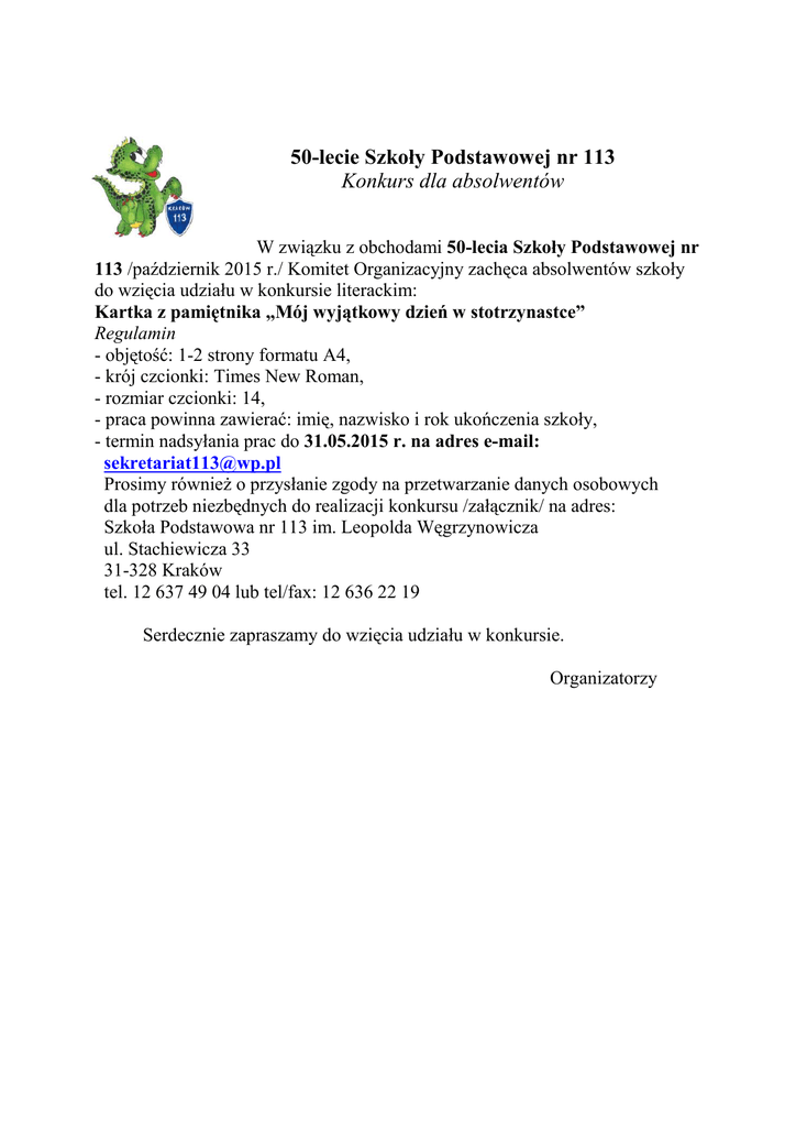 50-lecie Szkoły Podstawowej nr 113 Konkurs dla absolwentów W związku z obchodami 50-lecia Szkoły Podstawowej nr 113 /październik 2015 r./ Komitet Organizacyjny zachęca absolwentów szkoły do wzięcia udziału w konkursie literackim: Kartka z pamiętnika „Mój wyjątkowy dzień w stotrzynastce” Regulamin - objętość: 1-2 strony formatu A4, - krój czcionki: Times New Roman, - rozmiar czcionki: 14, - praca powinna zawierać: imię, nazwisko i rok ukończenia szkoły, - termin nadsyłania prac do 31.05.2015 r. na adres e-mail: [email protected] Prosimy również o przysłanie zgody na przetwarzanie danych osobowych dla potrzeb niezbędnych do realizacji konkursu /załącznik/ na adres: Szkoła Podstawowa nr 113 im. Leopolda Węgrzynowicza ul. Stachiewicza 33 31-328 Kraków tel. 12 637 49 04 lub tel/fax: 12 636 22 19 Serdecznie zapraszamy do wzięcia udziału w konkursie. Organizatorzy