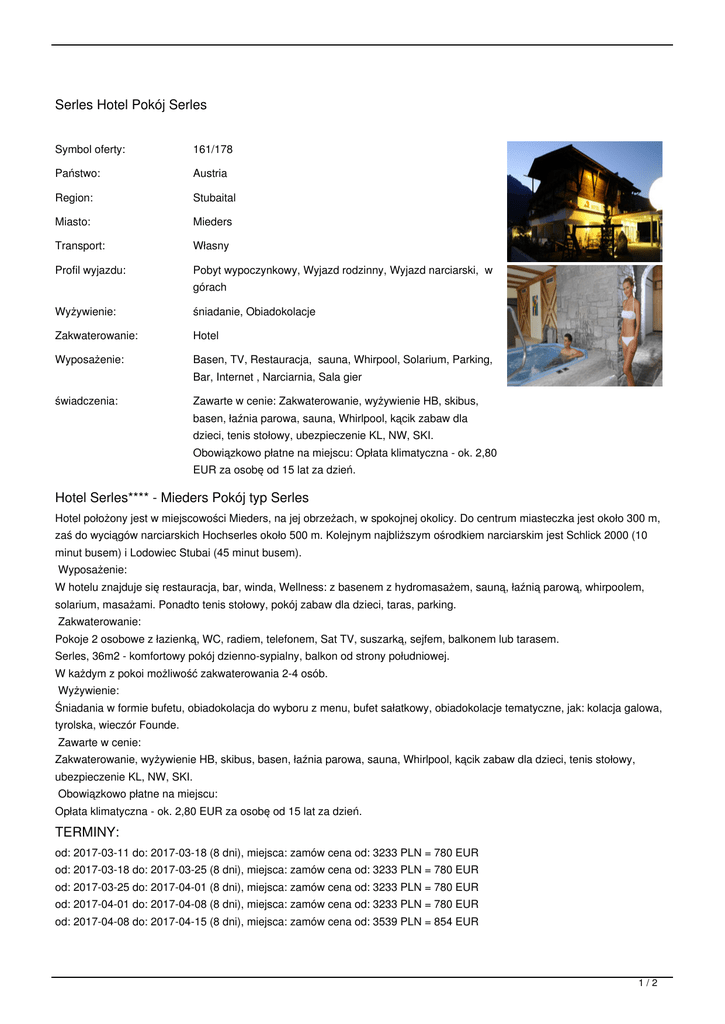 Serles Hotel Pokój Serles Symbol oferty: 161/178 Państwo: Austria Region: Stubaital Miasto: Mieders Transport: Własny Profil wyjazdu: Pobyt wypoczynkowy, Wyjazd rodzinny, Wyjazd narciarski, w Wyżywienie: śniadanie, Obiadokolacje Zakwaterowanie: Hotel Wyposażenie: Basen, TV, Restauracja, sauna, Whirpool, Solarium, Parking, świadczenia: Zawarte w cenie: Zakwaterowanie, wyżywienie HB, skibus, górach Bar, Internet , Narciarnia, Sala gier basen, łaźnia parowa, sauna, Whirlpool, kącik zabaw dla dzieci, tenis stołowy, ubezpieczenie KL, NW, SKI. Obowiązkowo płatne na miejscu: Opłata klimatyczna - ok. 2,80 EUR za osobę od 15 lat za dzień. Hotel Serles**** - Mieders Pokój typ Serles Hotel położony jest w miejscowości Mieders, na jej obrzeżach, w spokojnej okolicy. Do centrum miasteczka jest około 300 m, zaś do wyciągów narciarskich Hochserles około 500 m. Kolejnym najbliższym ośrodkiem narciarskim jest Schlick 2000 (10 minut busem) i Lodowiec Stubai (45 minut busem). Wyposażenie: W hotelu znajduje się restauracja, bar, winda, Wellness: z basenem z hydromasażem, sauną, łaźnią parową, whirpoolem, solarium, masażami. Ponadto tenis stołowy, pokój zabaw dla dzieci, taras, parking. Zakwaterowanie: Pokoje 2 osobowe z łazienką, WC, radiem, telefonem, Sat TV, suszarką, sejfem, balkonem lub tarasem. Serles, 36m2 - komfortowy pokój dzienno-sypialny, balkon od strony południowej. W każdym z pokoi możliwość zakwaterowania 2-4 osób. Wyżywienie: Śniadania w formie bufetu, obiadokolacja do wyboru z menu, bufet sałatkowy, obiadokolacje tematyczne, jak: kolacja galowa, tyrolska, wieczór Founde. Zawarte w cenie: Zakwaterowanie, wyżywienie HB, skibus, basen, łaźnia parowa, sauna, Whirlpool, kącik zabaw dla dzieci, tenis stołowy, ubezpieczenie KL, NW, SKI. Obowiązkowo płatne na miejscu: Opłata klimatyczna - ok. 2,80 EUR za osobę od 15 lat za dzień. TERMINY: od: 2017-03-11 do: 2017-03-18 (8 dni), miejsca: zamów cena od: 3233 PLN = 780 EUR od: 2017-03-18 do: 2017-03-25 (8 dni), miejsca: zamów cena od: 3233 PLN = 780 EUR od: 2017-03-25 do: 2017-04-01 (8 dni), miejsca: zamów cena od: 3233 PLN = 780 EUR od: 2017-04-01 do: 2017-04-08 (8 dni), miejsca: zamów cena od: 3233 PLN = 780 EUR od: 2017-04-08 do: 2017-04-15 (8 dni), miejsca: zamów cena od: 3539 PLN = 854 EUR 1/2 od: 2017-04-15 do: 2017-04-22 (8 dni), miejsca: zamów cena od: 3539 PLN = 854 EUR od: 2017-04-22 do: 2017-04-29 (8 dni), miejsca: zamów cena od: 2988 PLN = 721 EUR od: 2017-04-29 do: 2017-05-06 (8 dni), miejsca: zamów cena od: 2988 PLN = 721 EUR od: 2017-05-06 do: 2017-05-13 (8 dni), miejsca: zamów cena od: 2988 PLN = 721 EUR od: 2017-05-13 do: 2017-05-20 (8 dni), miejsca: zamów cena od: 2988 PLN = 721 EUR CENNIK: Długość pobytu: 8 dni 8 dni 8 dni Grupa cenowa: D C B 14 14 14 2.5 2.5 2.5 (-) (-) (-) (-) (-) 707 840 766 354 420 383 495 588 536 636 756 689 (-) (-) (-) Ubezpieczenie (obligatoryjne) (*) Ubezpieczenie KL, NW, SKI (*) Turystyczny Fundusz Gwarancyjny Pobyt w obiekcie (do wyboru) (*) Pokój 2 osobowy standardowo dla osób: 4 minimalnie: 2 (-) Rodzaj osoby (do wyboru) Dziecko 0-5 (*) Osoba dorosła Dziecko 6-11 Dziecko 12-17 lat 3 osoba na dostawce Rodzaj osoby (opcjonalny) 3 osoba dorosła na dostawce Waluta: EUR Aktualne ceny z systemu S.A.R.T. (-) - cena usługi, podatku kalkulowana przy osobie lub gratis (*) - kwota wliczona w cenę standardową 2/2