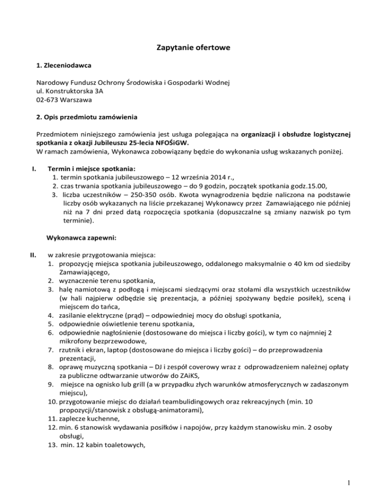 Zapytanie ofertowe 1. Zleceniodawca Narodowy Fundusz Ochrony Środowiska i Gospodarki Wodnej ul. Konstruktorska 3A 02-673 Warszawa 2. Opis przedmiotu zamówienia Przedmiotem niniejszego zamówienia jest usługa polegająca na organizacji i obsłudze logistycznej spotkania z okazji Jubileuszu 25-lecia NFOŚiGW. W ramach zamówienia, Wykonawca zobowiązany będzie do wykonania usług wskazanych poniżej. I. Termin i miejsce spotkania: 1. termin spotkania jubileuszowego – 12 września 2014 r., 2. czas trwania spotkania jubileuszowego – do 9 godzin, początek spotkania godz.15.00, 3. liczba uczestników – 250-350 osób. Kwota wynagrodzenia będzie naliczona na podstawie liczby osób wykazanych na liście przekazanej Wykonawcy przez Zamawiającego nie później niż na 7 dni przed datą rozpoczęcia spotkania (dopuszczalne są zmiany nazwisk po tym terminie). Wykonawca zapewni: II. w zakresie przygotowania miejsca: 1. propozycję miejsca spotkania jubileuszowego, oddalonego maksymalnie o 40 km od siedziby Zamawiającego, 2. wyznaczenie terenu spotkania, 3. halę namiotową z podłogą i miejscami siedzącymi oraz stołami dla wszystkich uczestników (w hali najpierw odbędzie się prezentacja, a później spożywany będzie posiłek), sceną i miejscem do tańca, 4. zasilanie elektryczne (prąd) – odpowiedniej mocy do obsługi spotkania, 5. odpowiednie oświetlenie terenu spotkania, 6. odpowiednie nagłośnienie (dostosowane do miejsca i liczby gości), w tym co najmniej 2 mikrofony bezprzewodowe, 7. rzutnik i ekran, laptop (dostosowane do miejsca i liczby gości) – do przeprowadzenia prezentacji, 8. oprawę muzyczną spotkania – DJ i zespół coverowy wraz z odprowadzeniem należnej opłaty za publiczne odtwarzanie utworów do ZAiKS, 9. miejsce na ognisko lub grill (a w przypadku złych warunków atmosferycznych w zadaszonym miejscu), 10. przygotowanie miejsc do działań teambulidingowych oraz rekreacyjnych (min. 10 propozycji/stanowisk z obsługą-animatorami), 11. zaplecze kuchenne, 12. min. 6 stanowisk wydawania posiłków i napojów, przy każdym stanowisku min. 2 osoby obsługi, 13. min. 12 kabin toaletowych, 1 14. odpowiednią liczbę koszy do segregacji odpadów, 15. parking dla 5 autokarów i samochodów osobowych dla min. 10% uczestników spotkania. III. w zakresie obsługi spotkania: 1. nadzór nad przebiegiem spotkania – osoba odpowiedzialna za koordynację całego spotkania, która będzie w stałym kontakcie z koordynatorem Zamawiającego w kwestiach dotyczących organizacji i przebiegu imprezy, a w czasie trwania spotkania zapewni jego sprawny, zgodny ze scenariuszem przebieg, 2. osoba prowadząca spotkanie – konferansjer, 3. osoby obsługujące oprawę muzyczną (DJ i zespół coverowy), 4. animatorzy prowadzący działania teambuildingowe i rekreacyjne, 5. osoby odpowiedzialne za bezpieczeństwo i porządek podczas spotkania– min. 8 osób, 6. ochronę zdrowia uczestników (jeden zespół ratowniczy wyjazdowy), 7. ochronę przeciwpożarową spotkania, 8. uprzątnięcie terenu przed, w trakcie i po spotkaniu, 9. wszystkie osoby obsługujące spotkanie zobowiązane są do noszenia imiennych identyfikatorów (bądź też innych spójnych elementów wizualnych, np. czapeczki itp.), tak aby uczestnicy spotkania bez trudu mogli rozpoznać przedstawicieli Wykonawcy. Osoby obsługujące wydawanie posiłków obowiązuje jednolity strój. IV. w zakresie logistyki: 1. sprzęt, materiały i wyposażenie niezbędne do przeprowadzenia spotkania jubileuszowego wraz z transportem, 2. montaż i demontaż sprzętu niezbędnego do przeprowadzenia spotkania jubileuszowego. Uwaga: transport uczestników na miejsce spotkania zapewnia Zamawiający. V. menu: 1. Wykonawca wszystkie posiłki będzie serwował w naczyniach jednorazowego użytku z plastikowymi sztućcami (posiadających atest do kontaktu z żywnością, w tym z gorącymi posiłkami i napojami). 2. Menu zaoferowane przez Wykonawcę musi uwzględniać następujące pozycje: a) dostępne przez cały czas trwania spotkania (stół szwedzki): - przekąski zimne - co najmniej 3 propozycje – każda co najmniej 80 g. na osobę: - sałaty i sałatki – co najmniej 3 propozycje – łącznie co najmniej 150 g na osobę, - przekąski słodkie i słone – ciasta, ciastka, owoce, paluszki, orzeszki – łącznie co najmniej 200 g na osobę, - bez ograniczeń kawę i herbatę (w saszetkach kawa i mix herbat w tym czarna, owocowe i zielona). Woda w termosach do serwowania kawy i herbaty powinna mieć temperaturę nie niższą niż 90 st. C, - wodę mineralną gazowaną i niegazowaną – łącznie co najmniej 0,5 l na osobę, w butelkach o pojemności nie większej niż 0,5 l. - soki (3 rodzaje do wyboru) i słodkie napoje gazowane (typu: coca-cola, fanta, sprite) w opakowaniach o pojemności nie większej niż 1,0 l – łącznie co najmniej 1,0 l na osobę, w równych proporcjach. 2 b) serwowane przez obsługę w ustalonych wg scenariusza godzinach: - zupy – co najmniej 2 propozycje, z czego jedna zupa wegetariańska – co najmniej 300 ml na osobę, - dania ciepłe – co najmniej 3 propozycje – 1 danie mięsne, 1 rybne, 1 wegetariańskie - co najmniej 250 g na osobę, - wybór pieczywa – co najmniej 3 rodzaje – bułka, chleb jasny, chleb ciemny - 250 g na osobę, - kiełbaski, kaszankę, karkówkę, warzywa na ognisko/grilla - łącznie, co najmniej 400 g na osobę, z zastrzeżeniem, że łącznie nie mniej niż 25 kg każdego. Danie ciepłe powinny mieć temperaturę nie niższą niż 70 st. C. 3. Zakres prac dla Wykonawcy Po podpisaniu umowy Wykonawca zobowiązany będzie do: - opracowania i przedstawienia koncepcji spotkania; - przedstawienia propozycji miejsca spotkania (spełniającego wymagania określone w Zapytaniu ofertowym); - przedstawienia propozycji DJ i zespołu coverowego (wraz z próbkami typu demo); - opracowania menu posiłku oraz posiłku na ognisko lub grilla; - opracowania działań teambuildingow