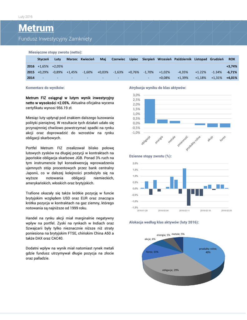 Luty 2016 Metrum Fundusz Inwestycyjny Zamknięty Miesięczne stopy zwrotu (netto): Styczeń Luty Marzec Kwiecień Maj Czerwiec Lipiec Sierpień Wrzesień Październik Listopad Grudzień ROK 2016 +1,65% +2,05% 2015 +0,29% -0,89% +1,45% -1,60% +0,03% -1,63% +0,76% -1,70% +1,02% -4,35% +1.22% -1.34% -6,71% - - - - - - - +0,08% +1,39% +1,18% +1,31% +4,01% 2014 - +3,74% Komentarz do wyników: Metrum FIZ osiągnął w lutym wynik inwestycyjny netto w wysokości +2.05%. Aktualna oficjalna wycena certyfikatu wynosi 956.19 zł. Miesiąc luty upłynął pod znakiem dalszego luzowania polityki pieniężnej. W rezultacie tych działań udało się przynajmniej chwilowo powstrzymać spadki na rynku akcji oraz doprowadzić do wzrostów na rynku obligacji skarbowych. Portfel Metrum FIZ zrealizował blisko połowę lutowych zysków na długiej pozycji w kontraktach na japońskie obligacja skarbowe JGB. Ponad 3% ruch na tym instrumencie był konsekwencją wprowadzenia ujemnych stóp procentowych przez bank centralny Japonii, co w dalszej kolejności przełożyło się na wyższe notowania obligacji niemieckich, amerykańskich, włoskich oraz brytyjskich. Atrybucja wyniku do klas aktywów: 3,0% 2,5% 2,0% 1,5% 1,0% 0,5% 0,0% -0,5% -1,0% Dzienne stopy zwrotu (%): 2,0% 1,5% 1,0% 0,5% 0,0% Trafione okazały się także krótkie pozycję w funcie brytyjskim względem USD oraz EUR oraz znacząca krótka pozycja w kontraktach na gaz ziemny, którego notowania są najniższe od 1999 roku. Handel na rynku akcji miał marginalnie negatywny wpływ na portfel. Zyski na rynkach w Indiach oraz Szwajcarii były tylko nieznacznie niższe niż straty poniesiona na brytyjskim FTSE, chińskim China A50 a także DAX oraz CAC40. Dodatni wpływ na wynik miał natomiast rynek metali gdzie fundusz utrzymywał długie pozycja na złocie oraz palladzie. -0,5% -1,0% -1,5% 2016-01-28 2016-02-04 2016-02-11 2016-02-18 Alokacja według klas aktywów (luty 2016): energia; 5% metale; 5% akcje; 6% produkty rolne; 40% forex; 15% obligacje; 29% 2016-02-25 Luty 2016 Metrum Fundusz Inwestycyjny Zamknięty W porównaniu do stycznia, na koniec lutego zwiększona została alokacja aktywów funduszu na produkty rolne a zmniejszeniu uległa alokacja na kontrakty walutowe oraz indeksy akcyjne. Histogram dziennych stóp zwrotu: 200 częstotliwość Sektor produktów rolnych pozostał w lutym praktycznie bez wpływu na wynik funduszu. Zyski na kontraktach na bawełnę, soję, pszenicę i ryż zostały całkowicie zniesione przez straty na tarcicy oraz tuszach wołowych. 150 100 50 0 Istotnemu zmniejszeniu uległa też ekspozycja na kontrakty notowane w Europie i Azji. Podsumowanie: dzienna stopa zwrotu (%) Wyceny certyfikatów inwestycyjnych: Najlepsze wyniki: obligacje 1020 energia 1000 3. 10-letnie obligacje skarbowe Niemiec (Bund) obligacje Najgorsze wyniki: 1. Bydło produkty rolne 2. NZD/USD forex 3. CHF/USD forex wycena CI (pln) 1. 10-letnie obligacje skarbowe Japonii (JGB) 2. Gaz ziemny (Henry Hub) 980 960 940 920 900 Największe pozycje: 1. 2-letnie obligacje skarbowe Niemiec (Schatz) 2. Soja obligacje 3. Mączka sojowa produkty rolne produkty rolne Na końcu lutego aktywa netto funduszu wynosiły ponad 21 mln. zł. Jeśli mają Państwo pytania dotyczące funduszu Metrum FIZ, lub potrzebują dodatkowych informacji, prosimy o kontakt mailowy na adres [email protected] 880