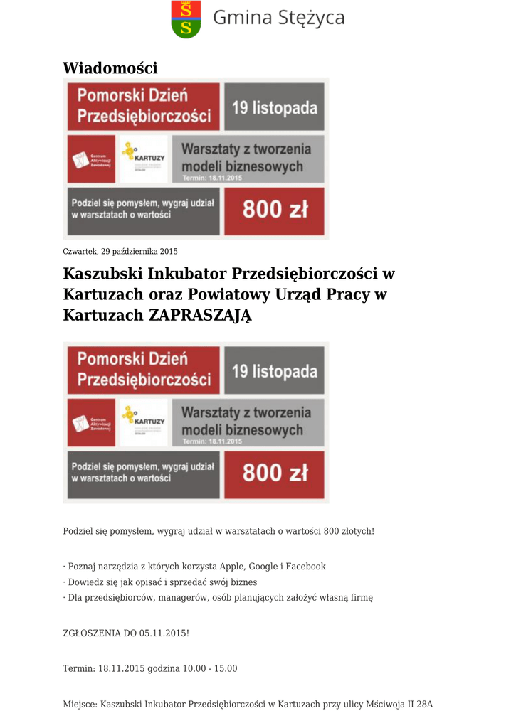 Wiadomości Czwartek, 29 października 2015 Kaszubski Inkubator Przedsiębiorczości w Kartuzach oraz Powiatowy Urząd Pracy w Kartuzach ZAPRASZAJĄ Podziel się pomysłem, wygraj udział w warsztatach o wartości 800 złotych! · Poznaj narzędzia z których korzysta Apple, Google i Facebook · Dowiedz się jak opisać i sprzedać swój biznes · Dla przedsiębiorców, managerów, osób planujących założyć własną firmę ZGŁOSZENIA DO 05.11.2015! Termin: 18.11.2015 godzina 10.00 - 15.00 Miejsce: Kaszubski Inkubator Przedsiębiorczości w Kartuzach przy ulicy Mściwoja II 28A Prowadząca: Joanna Woźniczka Więcej informacji na http://www.pup.kartuzy.pl/index.php?menu_id=81&news_id=1132