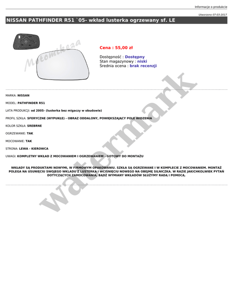 Informacje o produkcie Utworzono 07-03-2017 NISSAN PATHFINDER R51 `05- wkład lusterka ogrzewany sf. LE Cena : 55,00 zł MARKA: NISSAN MODEL: PATHFINDER R51 er m ar k Dostępność : Dostępny Stan magazynowy : niski Średnia ocena : brak recenzji LATA PRODUKCJI: od 2005- (lusterka bez migaczy w obudowie) PROFIL SZKŁA: SFERYCZNE (WYPUKŁE) - OBRAZ ODDALONY, POWIĘKSZAJĄCY POLE WIDZENIA KOLOR SZKŁA: SREBRNE OGRZEWANIE: TAK MOCOWANIE: TAK STRONA: LEWA - KIEROWCA UWAGI: KOMPLETNY WKŁAD Z MOCOWANIEM I OGRZEWANIEM - GOTOWY DO MONTAŻU w at WKŁADY SĄ PRODUKTAMI NOWYMI, W FIRMOWYM OPAKOWANIU. SZKŁA SĄ OGRZEWANE I W KOMPLECIE Z MOCOWANIEM. MONTAŻ POLEGA NA USUNIĘCIU SWOJEGO WKLADU Z LUSTERKA I WCIŚNIĘCIU NOWEGO NA OBEJMĘ SILNICZKA. W RAZIE JAKICHKOLWIEK PYTAŃ DOTYCZĄCYCH ZAMOCOWANIA, BĄDŹ WYMIANY WKŁADÓW SŁUŻYMY RADĄ I POMOCĄ.