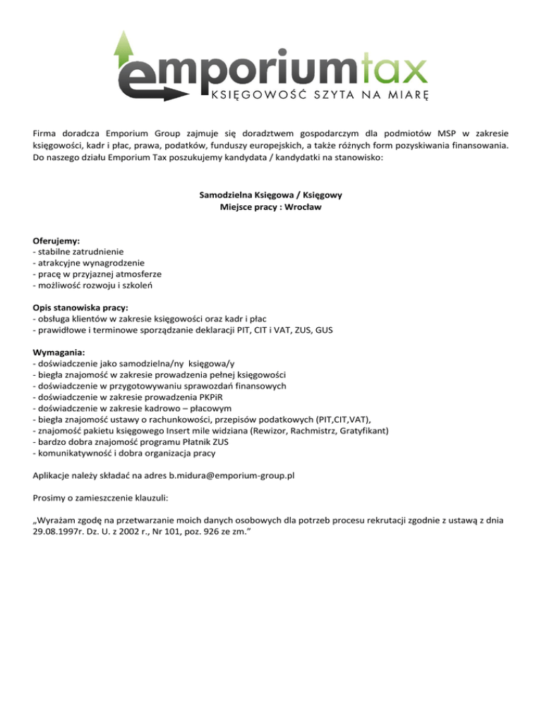 Firma doradcza Emporium Group zajmuje się doradztwem gospodarczym dla podmiotów MSP w zakresie księgowości, kadr i płac, prawa, podatków, funduszy europejskich, a także różnych form pozyskiwania finansowania. Do naszego działu Emporium Tax poszukujemy kandydata / kandydatki na stanowisko: Samodzielna Księgowa / Księgowy Miejsce pracy : Wrocław Oferujemy: - stabilne zatrudnienie - atrakcyjne wynagrodzenie - pracę w przyjaznej atmosferze - możliwość rozwoju i szkoleń Opis stanowiska pracy: - obsługa klientów w zakresie księgowości oraz kadr i płac - prawidłowe i terminowe sporządzanie deklaracji PIT, CIT i VAT, ZUS, GUS Wymagania: - doświadczenie jako samodzielna/ny księgowa/y - biegła znajomość w zakresie prowadzenia pełnej księgowości - doświadczenie w przygotowywaniu sprawozdań finansowych - doświadczenie w zakresie prowadzenia PKPiR - doświadczenie w zakresie kadrowo – płacowym - biegła znajomość ustawy o rachunkowości, przepisów podatkowych (PIT,CIT,VAT), - znajomość pakietu księgowego Insert mile widziana (Rewizor, Rachmistrz, Gratyfikant) - bardzo dobra znajomość programu Płatnik ZUS - komunikatywność i dobra organizacja pracy Aplikacje należy składać na adres [email protected] Prosimy o zamieszczenie klauzuli: „Wyrażam zgodę na przetwarzanie moich danych osobowych dla potrzeb procesu rekrutacji zgodnie z ustawą z dnia 29.08.1997r. Dz. U. z 2002 r., Nr 101, poz. 926 ze zm.”