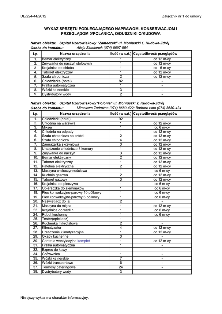 Załącznik nr 1 do umowy DE/224-44/2012 WYKAZ SPRZĘTU PODLEGAJĄCEGO NAPRAWOM, KONSERWACJOM I PRZEGLĄDOM 0/POLANICA, O/DUSZNIKI O/KUDOWA Nazwa obiektu: Szpital Uzdrowiskowy "Zameczek" ul. Moniuszki 1, Kudowa-Zdrój Alicja Ziemianek (074) 8697-854 Osoba do kontaktu: Lp. 1. 2. 3. 4. 5. 6. 7. 8. 9. Nazwa urządzenia Bemar elektryczny Zmywarka do naczyń stołowych Krajalnica do chleba Taboret elektryczny Szafa chłodnicza Chłodziarka (hotel) Pralka automatyczna Wózki kelnerskie Dystrybutory wody Ilość (w szt.) Częstotliwość przeglądów 1 1 1 1 2 82 1 3 2 co 12 m-cy co 12 m-cy co 6 m-cy co 12 m-cy co 12 m-cy - Nazwa obiektu: Szpital Uzdrowiskowy"Polonia" ul. Moniuszki 2, Kudowa-Zdrój Mirosława Zadrożna (074) 8680-422; Barbara Łata (074) 8680-424 Osoba do kontaktu: Lp. 1. 2. 3. 4. 5. 6. 7. 8. 9. 10. 11. 12. 13. 14. 15. 16. 17. 18. 19. 20. 21. 22. 24. 25. 26. 27. 28. 29. 30. 31. 32. 34. 35. 36. 37. 38. Nazwa urządzenia Chłodziarki (hotel) Chłodnia na warzywa Mikser Chłodnia na odpady Szafa chłodnicza na próbki Szafa chłodnicza Zamrażarka skrzyniowa Urządzenie chłodnicze 3 komory Zmywarka do naczyń Bemar elektryczny Taboret elektryczny Patelnia elektryczna Maszyna wieloczynnościowa Kuchnia gazowa Taboret gazowy Krajalnica do pieczywa Obieraczka do ziemniaków Piec konwekcyjno-parowy 10 półkowy Piec konwekcyjno-parowy 6 półkowy Naświetlacz do jaj Maszyna do mięsa Krajalnica do wędlin Robot kuchenny Toster(opiekacz) Kuchenka mikrofalowa Klimatyzator Urządzenie klimatyzacyjne Okapy kuchenne Centrala wentylacyjna komplet Pralka automatyczna Expres do kawy Gofrownica Wózki kelnerskie Wózki transportowe Termosy cateringowe Dystrybutory wody Niniejszy wykaz ma charakter informacyjny. Ilość (w szt.) Częstotliwość przeglądów 92 1 1 1 2 4 3 1 3 2 1 2 1 2 3 1 1 1 1 2 1 1 1 1 2 4 1 3 1 1 1 1 7 6 24 3 co 12 m-cy co 6 m-cy co 12 m-cy co 12 m-cy co 12 m-cy co 12 m-cy co 12 m-cy co 12 m-cy co 12 m-cy co 12 m-cy co 12 m-cy co 6 m-cy co 12 m-cy co 12 m-cy co 6 m-cy co 6 m-cy co 6 m-cy co 6 m-cy co 12 m-cy co 6 m-cy co 6 m-cy co 12 m-cy co 12 m-cy co 12 m-cy - Załącznik nr 1 do umowy DE/224-44/2012 Nazwa obiektu: Szpital Uzdrowiskowy "Koga" ul. Warszawska 6, Kudowa-Zdrój Osoba do kontaktu: Dorota Mosiołek (074) 8661-290 Lp. 1. 2. 3. 4. 5. 6. 7. 8. 9. 10. 11. 12. 13. 14. 15. 16. 17. 18. 19. 20. 21. 22. 23. Nazwa urządzenia Patelnia elektryczna Krajalnica do wędlin Krajalnica do pieczywa Piekarnik elektryczny Taboret gazowy Kuchnia gazowa Obieraczka do ziemniaków Zmywarka do naczyń Zamrażarka Chłodziarka Komora chłodnicza Piec konwekcyjno-parowy Pralka automatyczna Chłodnia Naświetlacz do jaj Maszyna gastronomiczna Maszynka do mielenia mięsa Kuchenka mikrofalowa Cłodziarki (hotel) Okap kuchenny Dystrybutor wody Wózek transportowy Termosy cateringowe Ilość (w szt.) Częstotliwość przeglądów 3 2 1 2 2 2 1 1 6 3 1 1 1 1 1 1 1 1 2 2 1 2 20 co 12 m-cy co 6 m-cy co 6 m-cy co 12 m-cy co 12 m-cy co 12 m-cy co 6 m-cy co 12 m-cy co 12 m-cy co 12 m-cy co 12 m-cy co 6 m-cy co 12 m-cy co 12 m-cy co 12 m-cy - Nazwa obiektu: Szpital Uzdrowiskowy "Zacisze" ul. Słowackiego 12, Kudowa-Zdrój Osoba do kontaktu: Dorota Mosiołek (074) 8667-470 Nazwa urządzenia Ilość (w szt.) Częstotliwość przeglądów Lp. 1 co 12 m-cy 1. Chłodnia Kuchnia gazowa 1 co 12 m-cy 2. 1 co 12 m-cy 3. Bemar 1 4. Kuchnia mikrofalowa 1 co 12 m-cy 5. Zmywarka 4 6. Chłodziarka (hotel) 1 7. Pralka automatyczna 1 8. Dystrybutor wody 2 9. Wózek kelnerski 2 10. Wózek transportowy 1 11. Okap kuchenny Nazwa obiektu: Szpital Uzdrowiskowy "Jagusia" ul. Słoneczna 12, Kudowa-Zdrój Osoba do kontaktu: Dorota Mosiołek (074) 8661-290 Lp. 1. 2. 3. 4. 5. 6. 7. 8. 9. 10. 11. 12. 13. Nazwa urządzenia Patelnia elektryczna Krajalnica do wędlin Krajalnica do pieczywa Piekarnik elektryczny Taboret gazowy Kuchnia gazowa Bemar Zmywarka do naczyń Kuchenka elektryczna Chłodziarka Pralka automatyczna Okap kuchenny Chłodziarka (hotel) Niniejszy wykaz ma charakter informacyjny. Ilość (w szt.) Częstotliwość przeglądów 1 1 1 2 1 2 1 1 1 1 2 1 1 co 12 m-cy co 6 m-cy co 6 m-cy co 12 m-cy co 12 m-cy co 12 m-cy co 12 m-cy co 12 m-cy co 12 m-cy - Załącznik nr 1 do umowy DE/224-44/2012 14. 15. 16. Dystrybutor wody Wózek transportowy Wózek kelnerski 2 1 2 - Nazwa obiektu: Szpital Uzdrowiskowy "Wielka Pieniawa" ul. Parkowa 4, Polanica-Zdrój Irena Sowiak (074) 8680-234 Ewa Brzezińska (074) 8680-318 Osoba do kontaktu: Nazwa urządzenia Ilość (w szt.) Częstotliwość przeglądów Lp. 160 1. Lodówki (hotel) 3 2. Kuchenka mikrofalowa 3 co 12 m-cy 3. Zmywarka do naczyń 2 co 12 m-cy 4. Patelnia elektryczna 1 co 12 m-cy 5. Płyta grzejna gazowa 6 co 12 m-cy 6. Szafa chłodnicza 3 co 12 m-cy 7. Zamrażarka 5 co 12 m-cy 8. Komora chłodnicza 3 co 12 m-cy 9. Lodówko-chłodziarki 2 co 12 m-cy 10. Bemar jezdny wodny 2 co 12 m-cy 11. Taboret gazowy 1 co 6 m-cy 12. Mikser planetarny 3 co 12 m-cy 13. Rozdrabniarka do jarzyn 2 co 12 m-cy 14. Wilk do mięsa 1 co 6 m-cy 15. Krajalnica do pieczywa 3 co 6 m-cy 16. Krajalnica do wędlin i serów 1 co 6 m-cy 17. Obieraczka do ziemniaków 2 co 6 m-cy 18. Piec konwekcyjno-parowy 1 co 12 m-cy 19. Kuchnia gazowa sześcio palnikowa 2 20. Naświetlacz do jaj 1 co 12 m-cy 21. Stól podgrzewaczy - elektryczny 1 co 6 m-cy 22. Robot kuchenny 1 co 6 m-cy 23. Robot wieloczynnościowy z przystaw. 1 co 6 m-cy 24. Mikser ręczny elektryczny 2 co 12 m-cy 25. Kocioł warzelny elekt. ogrzewany wodą 26. Kocioł warzelny elekt. ogrzewany olejem 4 co 12 m-cy 27. Okap kuchenny 13 28. Wentylacja 1 co 12 m-cy 29. Pralka automatyczna 2 30. Stół chłodniczy 1 co 12 m-cy 31. Dystrybutory wody 3 32. Wózki transportowe 10 33. Kostkarka do lodu 1 34. Moduł chłodniczo-grzewczy 1 35. Ekspres do kawy 1 36. Toster 1 Nazwa obiektu: Szpital Uzdrowiskowy "Zdrowie" ul. M. Konopnickiej 2, Polanica-Zdrój Irena Kiełbasińska (074) 8680-209 Osoba do kontaktu: Nazwa urządzenia Ilość (w szt.) Częstotliwo