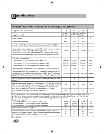 O perating data Product fiche_Commission Delegated Regulation(EU) No 1061/2010 Supplier’s name or trade mark Supplier’s model Rated capacity Energy efficiency class Awarded an “EU Ecolabel award” under Regulation (EC) No 66/2010 Weighted annual energy consumption (AEC) in kWh per year based on 220 standard washing cycles for cotton programme at full and partial load, and the consumption of the low-power modes. Actual energy consumption will depend on how the appliance is used. LG LG LG F12B8T/QD F10B8T/Q F14B8T/Q D(W)(A)(1~9) (W)(A)(1~9)/ D(W)(A)(1~9) 8/7 8/7 8/7 A+++ A+++ A+++ No No No 175/156 175/156 175/156 kg kWh/year The energy consumption - the standard 60 °C cotton programme at full load 0.89/0.80 0.89/0.80 0.89/0.80 kWh - the standard 60 °C cotton programme at partial load 0.75/0.64 0.75/0.64 0.75/0.64 kWh - the standard 40 °C cotton programme at partial load 0.67/0.60 0.67/0.60 0.67/0.60 kWh Weighted power consumption of the off-mode and of the left-on mode. 0.33 0.33 0.33 W Weighted annual wa er con umption (AW C) in litres per year based on 22 standard was hing cycles for cot ton programmes at 60°C and 40°C at full and 11 000/10 000 11 000/10 000 11 000/10 000 liters/year partial load. Actual water consumption will depend on how the appliance is used Spin-drying efficiency class on a scale from G (least efficient) to A (most efficient). Maximum spin speed attained for the standard 60°C cotton programme at full load or the standard 40°C cotton programme at partial load, whichever is the lower, and remaining moisture content attained for the standard 60°C cotton programme at full load or the standard 40°C cotton programme at partial load, whichever is the greater. A B B 1400 1200 1000 rpm 44 53 53 % The "Cotton Eco 60°C/40°C +Intensive" are the standard washing programmes to which the information in the label and the fiche relates, that these programmes are suitable to clean normally soiled cotton laundry and that they are the most efficient programmes in terms of combined energy and water consumption; The programme time 252/240 252/240 252/240 min - the standard 60°C cotton programme at full load 225/209 225/209 225/209 min - the standard 60 °C cotton programme at partial load 226/212 226/212 226/212 min - the standard 40 °C cotton programme at partial load The duration of the left-on mode (Tl) 10 10 10 Airborne acoustical noise emissions expressed in dB(A) re 1 pW and rounded to the nearest integer during the washing and spinning phases for the standard 60°C cotton programme at full load 54 54 54 75 74 74 Free standing 32 38 min dB(A) Karta produktu Karta produktu_Rozporządzenie delegowane Komisji (UE) nr 1061/2010 Nazwa dostawcy lub znak towarowy Identyfikator modelu dostawcy Pojemność znamionowa w kg Klasa efektywności energetycznej Przyznano "oznakowanie ekologiczne UE" zgodnie z rozporządzeniem (WE) nr 66/2010 ważone roczne zużycie energii (AEC) kWh rocznie na podstawie 220 standardowych cykli prania w przypadku programów prania tkanin bawełnianych w 60°C i 40°C przy pełnym i częściowym załadowaniu oraz zużycie w trybach niskiego zużycia energii. Rzeczywiste zużycie energii rależy od sposobu użytkowania urządzenia. LG LG LG F14B8T/Q F12B8T/Q F10B8T/Q D(W)(A)(1~9) D(W)(A)(1~9) D(W)(A)(1~9) 8/7 8/7 8/7 A+++ A+++ A+++ No No No 175/156 175/156 175/156 kg kWh/rok Zużycie energii - średnia 60°C Program bawełna przy pełnym obciążeniu 0.89/0.80 0.89/0.80 0.89/0.80 kWh - średnia 60°C Program bawełna przy częściowym obciążeniu 0.75/0.64 0.75/0.64 0.75/0.64 kWh - średnia 40°C Program bawełna przy częściowym obciążeniu 0.67/0.60 0.67/0.60 0.67/0.60 kWh 0.33 0.33 0.33 W Ważone zużycie energii w trybie wyłączenia i w trybie czuwania Ważone roczne zużycie wody (AWC) w litrach rocznie na podstawie 220 standardowych cykli prania w przypadku programów prania tkanin bawełnianych w 60 °C i 40 °C przy pełnym i częściowym załadowaniu. Rzeczywiste zużycie wody zależy od sposobu użytkowania urządzenia Klasa efektywności wirowania w skali od G (najmniejsza efektywność) do A (największa efektywność) 11 000/10 000 11 000/10 000 11 000/10 000 litr/rok A B B Maksymalna szybkość wirowania w przypadku standardowego programu prania tkanin bawełnianych w 60°C przy pełnym załadowaniu lub standardowego programu prania tkanin bawełnianych w 40°C przy rpm 1400 1200 1000 częściowym załadowaniu, w zależności od tego, która z tych wartości jest niższa, oraz wilgotność resztkowa uzyskana w przypadku standardowego programu prania tkanin bawełnianych w 60°C przy pełnym załadowaniu lub standardowego programu prania tkanin bawełnianych w 40°C przy częściowym załadowaniu, w zależności od tego, która z tych % 44 53 53 wartości jest wyższa Bawełna 60°C/40° + Intensywne" stanowią standardowe programy prania, do których odnoszą się informacje na etykiecie i w karcie, że są one odpowiednie do prania tkanin bawełnianych normalnie zabrudzonych oraz że są najbardziej efektywnymi programami pod względem łącznego zużycia energii i wody Czas programu - średnia 60°C Program bawełna przy pełnym obciążeniu - średnia 60°C Program bawełna przy częściowym obciążeniu - średnia 40°C Program bawełna przy częściowym obciążeniu 252/240 252/240 252/240 min 225/209 225/209 225/209 min 226/212 226/212 226/212 min Czas trwania trybu czuwania (Tl) 10 10 10 min Poziom emitowanego hałasu, który powstaje podczas faz prania i wirowania, w przypadku standardowego programu prania tkanin bawełnianych w 60 °C przy pełnym załadowaniu, wyrażony w dB(A) re 1 pW i zaokrąglony do najbliższej liczby całkowitej 54 75 54 74 54 74 dB(A) Wolnostojąca 32