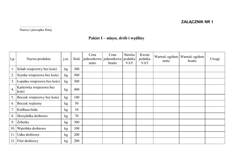 ZAŁĄCZNIK NR 1 ……………………….. Nazwa i pieczątka firmy Pakiet I – mięso, drób i wędliny j.m. Cena Cena Stawka Ilość jednostkowa jednostkowa podatku netto brutto VAT 1. Schab wieprzowy bez kości kg 300 2. Szynka wieprzowa bez kości kg 500 3. Łopatka wieprzowa bez kości kg 500 Karkówka wieprzowa bez kości kg 400 5. Boczek wieprzowy bez kości kg 100 6. Boczek wędzony kg 50 7. Kiełbasa biała kg 10 8. Skrzydełka drobiowe kg 70 9. Żeberka kg 300 10. Wątróbka drobiowa kg 100 11. Udka drobiowe kg 200 12. Filet drobiowy kg 200 Lp. 4. Nazwa produktu Kwota podatku VAT Wartość ogółem Wartość ogółem netto brutto Uwagi 13. Kurczaki kg 100 14. Szynka wędz . rodzinna kg 10 15. Szynka senatorska kg 10 16. Szynka swojska kg 10 17. Szynka szkolna kg 10 18. Szynka wiejska kg 10 19. Szynka królewiecka kg 25 20. Szynka konserwowa kg 25 21. Szynka z fileta indyka kg 21 22. Szynka ostrołęcka kg 12 23. Szynka farmerska kg 11 24. Szynka chłopska kg 24 25. Szynka pieczona kg 15 26. Szynka biała kg 15 27. Szynka królewska kg 10 28. Szynka kuleczka kg 10 29. Szynka opiekana kg 10 30. Szynkówka kg 50 31. Szynka w galarecie kg 20 32. Szynka z kurcząt kg 10 33 Szynka wędzona kg 10 34 Szynka z lasu kg 10 35 Szynka z żurawiną kg 10 36 Szynka czereśniowa kg 10 37 Szynka delikatesowa kg 10 38 Szynka diabelska kg 10 39 Cielęcina pieczarkowa kg 5 40 Łopatka konserwowa kg 5 41 Polędwica sopocka kg 50 42 Polędwica miodowa kg 25 43 Polędwica z indyka kg 10 44 Mielonka kg 20 45 Mortadela kg 30 46 Serdelki kg 50 47 Paluszki indykpolki kg 50 48 Paluszki drosetki kg 70 49. Kaszanka kg 5 50. Pasztet kg 30 51. Pasztetowa z pomidorem kg 50 52. Pasztetowa podwędzana kg 50 53. Pieczen rzymska kg 20 54. Baleron gotowany kg 30 55. Salceson kg 25 55. Kiełbasa podwawelska kg 170 56. Kurczak faszerowany kg 25 Razem netto ………………………………… zł podatek VAT w % …… / …………… zł brutto ……………………………… zł Słownie cena brutto:....................................................................................................... ………………………………. pieczątka i podpis osoby upoważnionej