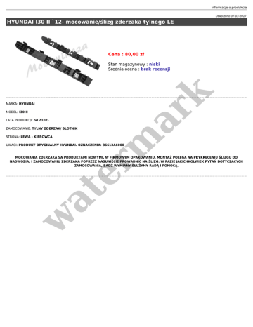 Informacje o produkcie Utworzono 07-03-2017 HYUNDAI I30 II `12- mocowanie/ślizg zderzaka tylnego LE Cena : 80,00 zł MARKA: HYUNDAI MODEL: I30 II LATA PRODUKCJI: od 2102- er m ar k Stan magazynowy : niski Średnia ocena : brak recenzji ZAMOCOWANIE: TYLNY ZDERZAK/ BŁOTNIK STRONA: LEWA - KIEROWCA UWAGI: PRODUKT ORYGINALNY HYUNDAI. OZNACZENIA: 86613A6000 w at MOCOWANIA ZDERZAKA SĄ PRODUKTAMI NOWYMI, W FIRMOWYM OPAKOWANIU. MONTAŻ POLEGA NA PRYKRĘCENIU ŚLIZGU DO NADWOZIA, I ZAMOCOWANIU ZDERZAKA POPRZEZ NASUNIĘCIE PROWADNIC NA ŚLIZG. W RAZIE JAKICHKOLWIEK PYTAŃ DOTYCZĄCYCH ZAMOCOWANIA, BĄDŹ WYMIANY SŁUŻYMY RADĄ I POMOCĄ.