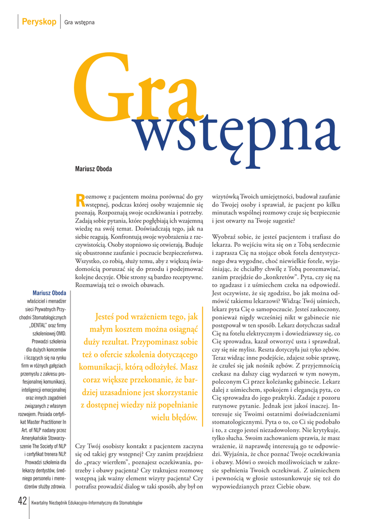 Peryskop Gra wstępna Gra wstępna Mariusz Oboda R Mariusz Oboda właściciel i menadżer sieci Prywatnych Przychodni Stomatologicznych „DENTAL” oraz firmy szkoleniowej OMD. Prowadzi szkolenia dla dużych koncernów i liczących się na rynku firm w różnych gałęziach przemysłu z zakresu profesjonalnej komunikacji, inteligencji emocjonalnej oraz innych zagadnień związanych z własnym rozwojem. Posiada certyfikat Master Practitioner In Art. of NLP nadany przez Amerykańskie Stowarzyszenie The Society of NLP i certyfikat trenera NLP. Prowadzi szkolenia dla lekarzy dentystów, średniego personelu i menedżerów służby zdrowia. 42 ozmowę z pacjentem można porównać do gry wstępnej, podczas której osoby wzajemnie się poznają. Rozpoznają swoje oczekiwania i potrzeby. Zadają sobie pytania, które pogłębiają ich wzajemną wiedzę na swój temat. Doświadczają tego, jak na siebie reagują. Konfrontują swoje wyobrażenia z rzeczywistością. Osoby stopniowo się otwierają. Buduje się obustronne zaufanie i poczucie bezpieczeństwa. Wszystko, co robią, służy temu, aby z większą świadomością poruszać się do przodu i podejmować kolejne decyzje. Obie strony są bardzo receptywne. Rozmawiają też o swoich obawach. Jesteś pod wrażeniem tego, jak małym kosztem można osiągnąć duży rezultat. Przypominasz sobie też o ofercie szkolenia dotyczącego komunikacji, którą odłożyłeś. Masz coraz większe przekonanie, że bardziej uzasadnione jest skorzystanie z dostępnej wiedzy niż popełnianie wielu błędów. Czy Twój osobisty kontakt z pacjentem zaczyna się od takiej gry wstępnej? Czy zanim przejdziesz do „pracy wiertłem”, poznajesz oczekiwania, potrzeby i obawy pacjenta? Czy traktujesz rozmowę wstępną jak ważny element wizyty pacjenta? Czy potrafisz prowadzić dialog w taki sposób, aby był on Kwartalny Niezbędnik Edukacyjno-Informatyczny dla Stomatologów wizytówką Twoich umiejętności, budował zaufanie do Twojej osoby i sprawiał, że pacjent po kilku minutach wspólnej rozmowy czuje się bezpiecznie i jest otwarty na Twoje sugestie? Wyobraź sobie, że jesteś pacjentem i trafiasz do lekarza. Po wejściu wita się on z Tobą serdecznie i zaprasza Cię na stojące obok fotela dentystycznego dwa wygodne, choć niewielkie fotele, wyjaśniając, że chciałby chwilę z Tobą porozmawiać, zanim przejdzie do „konkretów”. Pyta, czy się na to zgadzasz i z uśmiechem czeka na odpowiedź. Jest oczywiste, że się zgodzisz, bo jak można odmówić takiemu lekarzowi? Widząc Twój uśmiech, lekarz pyta Cię o samopoczucie. Jesteś zaskoczony, ponieważ nigdy wcześniej nikt w gabinecie nie postępował w ten sposób. Lekarz dotychczas sadzał Cię na fotelu elektrycznym i dowiedziawszy się, co Cię sprowadza, kazał otworzyć usta i sprawdzał, czy się nie mylisz. Reszta dotyczyła już tyko zębów. Teraz widząc inne podejście, zdajesz sobie sprawę, że czułeś się jak nośnik zębów. Z przyjemnością czekasz na dalszy ciąg wydarzeń w tym nowym, poleconym Ci przez koleżankę gabinecie. Lekarz dalej z uśmiechem, spokojem i elegancją pyta, co Cię sprowadza do jego praktyki. Zadaje z pozoru rutynowe pytanie. Jednak jest jakoś inaczej. Interesuje się Twoimi ostatnimi doświadczeniami stomatologicznymi. Pyta o to, co Ci się podobało i to, z czego jesteś niezadowolony. Nie krytykuje, tylko słucha. Swoim zachowaniem sprawia, że masz wrażenie, iż naprawdę interesują go te odpowiedzi. Wyjaśnia, że chce poznać Twoje oczekiwania i obawy. Mówi o swoich możliwościach w zakresie spełnienia Twoich oczekiwań. Z uśmiechem i pewnością w głosie ustosunkowuje się też do wypowiedzianych przez Ciebie obaw. Mariusz Oboda Peryskop Zaczynasz zdawać sobie sprawę, że tych kilka minut luźnej rozmowy przekroczyło Twoje oczekiwania i zbudowało między Wami relację. Siadasz na fotelu dentystycznym z zupełnie innym niż dotychczas nastawieniem, zwłaszcza, że wiesz, czego się spodziewać, ponieważ zaczniecie od badania. Jest to dla Ciebie ciekawe doświadczenie. Zastanawiasz się, co zaszło, co tak zmieniło Twoje nastawienie do lekarza i leczenia. Na czym polega ta magia? W swojej pracy też masz kontakt z ludźmi i zaczynasz sobie zdawać sprawę, że popełniałeś dotychczas błędy na omawianym etapie. Zbyt szybko przechodziłeś do czynności medycznych, uważając, że rozmowa wstępna jest stratą czasu. Ludzie wiedzą, po co przyszli i chcą to jak najszybciej otrzymać. Na własnej skórze doświadczyłeś, jak gra wstępna buduje fundament. Teraz rozumiesz, dlaczego często później traciłeś znacznie więcej czasu na przekonywanie do swoich planów. Nie zbudowałeś fundamentu, czyli wystarczającego zaufania i poczucia bezpieczeństwa, dlatego Twoje budowle były chwiejne i traciłeś wiele energii na utrzymywanie ich w pionie. Jesteś pod wrażeniem tego, jak małym kosztem można osiągnąć duży rezultat. Przypominasz sobie też o ofercie szkolenia dotyczącego komunikacji, którą odłożyłeś. Masz coraz większe przekonanie, że bardziej uzasadnione jest skorzystanie z dostępnej wiedzy niż popełnianie wielu błędów. Rozmowa jest momentem wizyty, w trakcie którego następuje przygotowanie gleby i zasiewanie ziarna, aby za jakiś czas zebrać plon w postaci zgody pacjenta na estetyczne i kompleksowe rozwiązania. Na tym etapie ogrodnik poznaje glebę. Po to, aby później dobrać odpowiedni nawóz i właściwie zasiać. Czy może być skuteczne zasadzenie rośliny bez sprawdzenia rodzaju gleby? Codzienność notuje przypadki, w których osoba nie miała czasu zasiać, bo była zbyt zajęta i później dziwiła się, że nic nie wyrosło. Tak naprawdę się dzieje. Postępowanie z pacjentem jest jak sadzenie rośliny. Trzeba spulchnić glebę, sprawdzić jej rodzaj i określić jej potrzeby, aby dopasować odpowiedni nawóz. Dla mądrego ogrodnika jest to oczywiste. Efekt pracy jest przewidywa