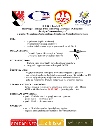 R E G U LA M I N Halowego Turnieju Piłki Siatkowej Dziewcząt i Chłopców „Drużyn Czteroosobowych” o puchar Sekretarza Gołdapskiego Szkolnego Związku Sportowego CEL: - popularyzacja piłki siatkowej - stworzenie rywalizacji sportowej - realizacja kalendarza imprez sportowych na rok 2013 ORGANIZATOR: - Ośrodek Sportu i Rekreacji w Gołdapi - Gołdapski Szkolny Związek Sportowy UCZESTNICTWO: - drużyna liczy cztery(ech) zawodniczki, zawodników - rozgrywki są prowadzone w kategorii OPEN . PRZEPISY GRY: - wygrywa drużyna, która jako pierwsza zdobędzie 15 punktów - gra będzie toczyła się do dwóch wygranych setów ( tie-breaker do 15) - mecze będą odbywały się jednocześnie na dwóch boiskach - piłki do rozgrzewki drużyny zapewniają we własnym zakresie TERMIN I MIEJSCE ZAWODÓW: - turniej zostanie rozegrany w kompleksie sportowym Hala – Basen OSiR w Gołdapi w dnia 01.02.2013 r. (piątek) godz.11:00 PROGRAM ZAWODÓW: - godz. 10:00 do 10:45 - przyjmowanie zgłoszeń - godz. 10:50 - losowanie gier - godz. 11:00 - pierwsze mecze NAGRODY: - za I – III miejsce puchar i pamiątkowy dyplom - nagroda dla najlepszej zawodniczki, zawodnika turnieju