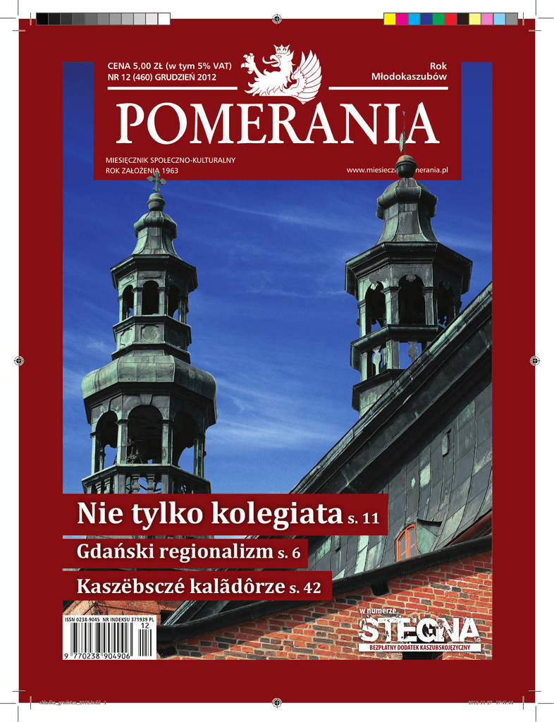 CENA 5,00 ZŁ (w tym 5% VAT) NR 12 (460) GRUDZIEŃ 2012 MIESIĘCZNIK SPOŁECZNO-KULTURALNY ROK ZAŁOŻENIA 1963 Rok Młodokaszubów www.miesiecznikpomerania.pl Nie tylko kolegiata s. 11 Gdański regionalizm s. 6 Kaszëbsczé kalãdôrze s. 42 w numerze BEZPŁATNY DODATEK KASZUBSKOJĘZYCZNY okladka_grudzien_2012.indd 1 2012-11-27 17:41:44 Witómë Ce, Jezëskù drodżi, Witómë Ce tu westrzód nas. Chòc jes jesz môłi, ju prosbã mómë: Ò Jezë, Jezë, ò Jezë, Jezë, Pòmòże zmienic nasz cãżczi czas. („Rëbackô kòlãda”, sł. Jerzi Łisk) Z leżnoscë Gòdów żëczimë najim Czëtińcóm, żebë cãżczi czas, ò jaczim spiéwómë w ti kòlãdze, jak nôchùdzy szedł w zabëcé. Niech môłi Jezësk błogòsławi nama z betlejemsczégò kùmka i dô szczescé, zgòdã, zdrowié i ùbëtk wszëtczim lëdzóm. Z okazji Świąt Bożego Narodzenia życzymy naszym Czytelnikom, żeby ciężkie czasy, o których śpiewamy w tej kolędzie, jak najszybciej odeszły w zapomnienie. Niech mały Jezusek błogosławi nam z betlejemskiego żłóbka i obdarzy wszystkich ludzi szczęściem, zgodą, zdrowiem i spokojem. Redakcjowé Kòlegium i redakcjô cządnika „Pomerania” okladka_grudzien_2012.indd 2 2012-11-27 17:41:45 Numer wydano dzięki dotacji Ministra Administracji i Cyfryzacji oraz Samorządu Województwa Pomorskiego. W NUMERZE: 2 Od redaktora 39 „KASZËBSCZI NOBEL” 3 Listy Marika Jelińskô, Kasza Główczewskô Kazimierz Ostrowski 40 WSPANIAŁA AŻ DO ŚMIERCI 4 Z drugiej ręki 6 REFLEKSJE NAD REGIONALIZMEM GDAŃSKIM 40 CËDOWNÔ JAŻ DO SMIERCË Marek Adamkowicz Tłom. Bòżena Ùgòwskô Z ks. Piotrem Krupińskim rozmawia Edmund Szczesiak Róman Drzéżdżón Zofia Watrak Maya Gelniôk, tłom. Jiwóna i Wòjcech Makùrôcë Jerzi Nacel, tłom. Danuta Pioch Jerzy Samp Józef Belgraù, tłom. Dariusz Majkòwsczi Zyta Wejer Z Duszanã Pażdżersczim gôdają Edita Jankòwskô-Germek i Pioter Léssnaù Maria Pająkowska-Kensik Bogusław Breza 50 MOJA POMORANIA Stanisłôw Hasse 52 NOWI SYMBÒL NORDË? 42 KASZËBSCZÉ KALÃDÔRZE 11 PRZYWRACANIE BLASKU 14 MIĘDZY TRADYCJĄ A NOWOCZESNOŚCIĄ 44 HUSKY NA PÒMÒRZIM 46 W GNIEŻDŻEWIE PRZED… LATY 17 Z DZEJÓW KARTËSCZÉGÒ APTÉKARSTWA 48 GWJIZDÓR 21 TAK SÃ WSZËTKÒ ZACZÃŁO 49 PÓKI SĄ WESELA 23 BÒ W BÔJKACH JE WSZËTKÒ 25 Z MIŁOŚCI DO REDY 27 TACZÉ TO BËŁO ŻËCÉ 28 KLEKÒTKA 49 Działo się w grudniu Ze Sławiną Kosmulską rozmawia Miłosława Kosmulska Matéùsz Bùllmann 53 Wiérztë. Gwiôzdczi, aniołë, danka… rd 29 NIÉ LENO PISANIÉ 54 Lektury Dariusz Majkòwsczi 57 JESZ JE WIELE PÒMÒRZANÓW DO ÒDKRËCÔ... Jolanta Justa Ana Glëszczëńskô, Karolëna Keler 59 Klëka Róman Drzéżdżón, Danuta Pioch 30 SZKIC DO PORTRETU MACIEJA KILARSKIEGO (CZĘŚĆ 1) 33 ÙCZBA 17. GÒDË I SYLWESTER I–VIII Najô Ùczba 35 NA MOSTKU KAPITAŃSKIM LUB ZA BURTĄ Marta Szagżdowicz Jacek Borkowicz Ryszard Szwoch 36 ASUBA I KACUBA (CZĘŚĆ 5) 38 KOCIEWIE PAMIĘTA pomerania_grudzien_2012.indd 1 65 CZAS TWARDYCH SUMIEŃ Tomasz Żuroch-Piechowski Ana Glëszczëńskô Tómk Fópka Rómk Drzéżdżónk 66 JAK ÒBARCHNIEC NA GÒDË 67 NIE STRZELAC DO ÒRGANISTË 68 KÙŃC SWIATA pomerania grudzień 2012 2012-11-30 17:45:49 Od redaktora Znany pomorski artysta Marian Kołodziej, mówiąc o jednej ze swych monograficznych wystaw „Zdarzyło mi się w Gdańsku”, dodawał „koło Kartuz”. Znaczenia Gdańska dla Pomorza nikt chyba nie zamierza negować, ale w tym roku warto zwrócić szczególną uwagę także na miasto w samym sercu Kaszub. Kończą się tam właśnie obchody sześćset trzydziestej rocznicy ufundowania klasztoru braciom z praskiego domu zakonnego kartuzów, co dało początek dzisiejszemu miastu. Niektórzy mówią, że Kartuzy są „w cieniu kolegiaty”, ale trzeba przyznać, że nawet gdyby tak było, to po ostatnich pracach w tej świątyni i wokół niej jest to cień wyjątkowo piękny i dostojny. Swoją rocznicę powstania – bardziej okrągłą, bo osiemsetną – świętuje też w tym roku Żukowo, nekropolia księżnych kaszubsko-pomorskich. Józef Belgrau na łamach „Pomeranii” przypomina początki Żukowa, które podobnie jak Kartuzy swój rozkwit zawdzięcza zakonowi. Obie te miejscowości przez wieki wywierały ogromny wpływ zarówno na duchowe, jak i kulturalne oraz gospodarcze życie sporej części Pomorza. Czy tak jest i dzisiaj? Działaniom podejmowanym przez kartuskie instytucje upowszechniania i tworzenia kultury przyjrzymy się w tym numerze, a do „stolëcë kaszëbsczégò wësziwkù” wrócimy w styczniu. A jako że to ostatni numer naszego miesięcznika w tym roku (Roku Młodokaszubów), chcemy gorąco podziękować naszym Czytelnikom za to, że byli z nami i nie tylko czytali to, co publikujemy, ale i pisali do nas, telefonowali z pochwałami i uwagami – na każdym kroku dawali znać, że traktują „Pomeranię” jako swoje pismo, na którym im zależy. Jesteśmy Państwu za to bardzo wdzięczni. Mamy nadzieję, że w nowym 2013 roku – jubileuszowym dla naszego pisma, które będzie świętować 50-lecie – ta współpraca, czyli współtworzenie „Pomeranii” będzie trwać i się rozwijać. Dariusz Majkowski Zaprenumeruj nasze pismo na 2013 rok – otrzymasz ciekawą książkę. Koszt prenumeraty rocznej krajowej z bezpłatną dostawą do domu: 55 zł. W przypadku prenumeraty zagranicznej: 150 zł. Podane ceny sa cenami brutto i uwzględniają 5% VAT. Zamawiający roczną prenumeratę obejmującą co najmniej 6 miesięcy 2013 roku otrzymają jedną z atrakcyjnych książek. Listę pozycji do wyboru zaprezentujemy w styczniowym numerze naszego pisma. Książki wyślemy we wrześniu 2013 roku. Aby zamówić roczną prenumeratę, należy • dokonać wpłaty na konto: PKO BP S.A. 28 1020 1811 0000 0302 0129 35 13, ZG ZKP, ul. Straganiarska 20–23, • 80-837 Gdańsk, podając imię i nazwisko (lub nazwę jednostki zamawiającej) oraz dokładny adr