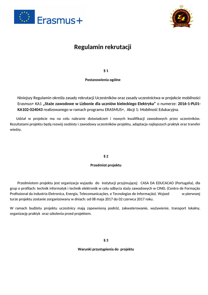 Regulamin rekrutacji §1 Postanowienia ogólne Niniejszy Regulamin określa zasady rekrutacji Uczestników oraz zasady uczestnictwa w projekcie mobilności Erasmus+ KA1 „Staże zawodowe w Lizbonie dla uczniów kieleckiego Elektryka” o numerze: 2016-1-PL01KA102-024043 realizowanego w ramach programu ERASMUS+, Akcji 1: Mobilność Edukacyjna. Udział w projekcie ma na celu nabranie doświadczeń i nowych kwalifikacji zawodowych przez uczestników. Rezultatami projektu będą rozwój osobisty i zawodowy uczestników projektu, adaptacja najlepszych praktyk oraz transfer wiedzy. §2 Przedmiot projektu Przedmiotem projektu jest organizacja wyjazdu do instytucji przyjmującej: CASA DA EDUCACAO (Portugalia), dla grup o profilach: technik informatyk i technik elektronik w celu odbycia staży zawodowych w CINEL (Centro de Formação Profissional da Industria Eletronica, Energia, Telecomunicações, e Tecnologias de Informação). Wyjazd w pierwszej turze projektu zostanie zorganizowany w dniach: od 08 maja 2017 do 02 czerwca 2017 roku. W ramach budżetu projektu uczestnicy mają zapewnioną podróż, zakwaterowanie, wyżywienie, transport lokalny, organizację praktyk oraz szkolenia przed projektem. §3 Warunki przystąpienia do projektu W projekcie mogą uczestniczyć uczniowie klas trzecich o profilu nauczania: technik informatyk i technik elektronik z Zespołu Szkół Elektrycznych w Kielcach. W Zespole Szkół Elektrycznych została powołana Komisja Rekrutacyjna, w skład której wchodzą: 1. Koordynator projektu/nauczyciel j. angielskiego- Pani Martyna Patyńska 2. Nauczyciel przedmiotów informatycznych- Pan Tomasz Baron 3. Nauczyciel przedmiotów elektronicznych- Pan Karol Witkowski 4. Nauczyciel przedmiotów elektronicznych- Pan Tomasz Scendo W celu wzięcia udziału w procesie rekrutacji należy: -wypełnić i własnoręcznie podpisać: Deklarację Przystąpienia do Projektu oraz Kartę Kwalifikacyjną Przystąpienia do Szkoleń przed Projektem, -złożyć osobiście u koordynatora projektu p. Martyny Patyńskiej w sali nr 112 w terminie do 16.09.2016r. godz. 13.40. do Formularze aplikacyjne zamieszczone są na stronie szkoły. Wyniki rekrutacji zostaną ogłoszone na stronie szkoły i w gablocie informacyjnej. §4 Kryteria uczestniczenia w wyjeździe zagranicznym Komisja Rekrutacyjna wybierze po 20 osób w zawodach technik informatyk i technik elektronik do uczestniczenia w szkoleniach przed projektem według ilości uzyskanych punktów na Karcie Kwalifikacyjnej. Po ukończeniu szkoleń zostanie przeprowadzony egzamin językowy, po którym zostanie wyłonionych po 18 uczestników w każdej grupie do wyjazdu zagranicznego. Pozostałe 2 osoby z każdej grupy zostaną umieszczone na liście rezerwowej. W przypadku rezygnacji osoby z listy podstawowej na jej miejsce do projektu zostaje zakwalifikowana pierwsza osoba z listy rezerwowej. Wyłonieni kandydaci przejdą przed wyjazdem szkolenie kulturowe, pedagogiczno-psychologiczne i językowe z języka angielskiego technicznego. §5 Obowiązki uczestnika szkolenia 1. Uczestnik szkolenia zobowiązany jest rzetelnie uczestniczyć w przygotowaniach do projektu obejmujących szkolenie językowe, kulturowe i pedagogiczno-psychologiczne. 2. Uczestnik szkolenia zobowiązany jest do przystąpienia do egzaminu pisemnego i ewentualnie ustnego (w przypadku uzyskania jednakowej ilości punktów z części pisemnej) z języka angielskiego po zakończeniu kursu językowego. §6 Obowiązki uczestnika wyjazdu 1. Uczestnik wyjazdu na zagraniczny staż zobowiązany jest do godnego reprezentowania szkoły i kraju w czasie całego pobytu zagranicą. 2. Uczestnik wyjazdu zobowiązany jest do przestrzegania Regulaminu Wyjazdu Uczestnika Stażu. 3. Uczestnik wyjazdu zobowiązany jest do rzetelnego wypełniania swoich obowiązków przed rozpoczęciem stażu (przygotowanie do projektu), podczas trwania projektu i po zakończeniu projektu (raport). 4. Uczestnik wyjazdu na zagraniczny staż zobowiązany jest do podpisania oświadczenia o wyrażeniu zgody na wykorzystaniu wizerunku w celach promocji projektu. Podanie danych i podpisanie oświadczenia jest dobrowolne, aczkolwiek odmowa jest równoznaczna z brakiem możliwości udzielenia wsparcia w ramach projektu. §7 Rezygnacje Rezygnacja ze szkolenia przygotowującego jest równoznaczna z rezygnacją z projektu i (w uzasadnionych przypadkach) możliwa jest po przedstawieniu jej w formie pisemnej do koordynatora projektu, najpóźniej tydzień przed rozpoczęciem kursów. W przypadku rezygnacji w momencie, gdy kurs się już rozpoczął, uczestnik szkolenia zobowiązany jest zwrócić materiały szkoleniowe do koordynatora projektu, a jego miejsce zostanie przyznane pierwszej osobie z listy rezerwowej. W przypadkach losowych rezygnacja z kursu możliwa jest po rzetelnym udokumentowaniu przyczyn rezygnacji. §8 Odwołania od decyzji Komisji Rekrutacyjnej Uczestnikowi szkolenia, który nie zakwalifikował się do wyjazdu zagranicznego przysługuje prawo odwołania od decyzji Komisji Rekrutacyjnej w terminie 3 dni roboczych od ogłoszenia wyników. §9 Postanowienia końcowe Wszelkie bieżące sprawy będą regulowane odrębnymi zarządzeniami.