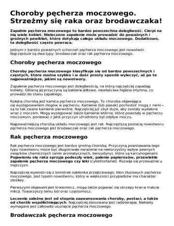 Choroby pęcherza moczowego. Strzeżmy się raka oraz brodawczaka! Zapalnie pęcherza moczowego to bardzo powszechna dolegliwość. Cierpi na nią wiele kobiet. Nieleczone zapalenie może prowadzić do poważnych i groźnych powikłań, które dotykają całego układu moczowego. Dodatkowo, ta dolegliwość często powraca. Jednym z bardzo poważnych schorzeń pęcherza moczowego jest nowotwór. Najczęstsze są dwa typy: brodawczak oraz rak pęcherza moczowego. Choroby pęcherza moczowego Choroby pęcherza moczowego klasyfikuje się od bardzo powszechnych i częstych, które można szybko i w dość prosty sposób wyleczyć, aż po te najpoważniejsze, jakimi są nowotwory. Zapalenie pęcherza moczowego jest dolegliwością, na którą najczęściej zapadają kobiety. Główną jej przyczyną są bakterie jelitowe, niewłaściwa higiena intymna, co prowadzi do stanu zapalnego. Kolejną chorobą jest kamica pęcherza moczowego. To choroba objawiająca się występowaniem złogów w pęcherzu. Kamienie (lub piasek) pochodzić mogą z nerki – są to tak zwane kamienie pierwotne. Najczęściej już zbyt duże, aby zostały wydalone wraz z moczem. Mogą występować także kamienie wtórne, które powstały w pęcherzu moczowym, ponieważ z jakiś przyczyn utrudniony był odpływ moczu. Najpoważniejszą chorobą układu moczowego jest rak. Najczęstszą postacią nowotworu pęcherza moczowego jest brodawczak oraz rak pęcherza moczowego. Rak pęcherza moczowego Rak pęcherza moczowego jest bardzo groźną chorobą. Przyczyną powstawania tego typu nowotworu może być długotrwałe narażenie na niekorzystny wpływ pewnych związków chemicznych (amin aromatycznych, benzydyny), które są karcynogenami. Pojawieniu się raka sprzyja podeszły wiek, palenie papierosów, przewlekłe zapalenie pęcherza moczowego czy leki (cyklofosfamid). Rozwija się przeważnie u mężczyzn. Najczęściej wywodzi się z komórek nabłonka przejściowego, błon śluzowych pęcherza moczowego. Jest typem nowotworu, który w większości przypadków ma charakter złośliwy. Pierwszymi objawami jest krwiomocz, mogą także pojawiać się skrzepy krwi w trakcie mikcji. Towarzyszy temu ból oraz częstomocz. Leczenie zależne jest od stopnia zaawansowania choroby, postaci, a także od chorób współistniejących. Najczęściej stosowana jest radioterapia. Niekiedy wymagane jest całkowite usunięcie pęcherza moczowego. Brodawczak pęcherza moczowego Brodawczak może rozwijać się przez długi czas nie dając żadnych objawów. Nowotwory brodawkowe zazwyczaj nie mają charakteru złośliwego. Charakterystyka nowotworu brodawkowego pęcherza moczowego jest bardzo podobna do raka pęcherza moczowego. Różni się nieco przebiegiem, wyglądem i mniejszą złośliwością. Najczęściej zmiany brodawkowe, gdy są dostatecznie wcześnie rozpoznane, można z powodzeniem usunąć, a przy dobrym prowadzeniu terapii, rzadko powracają. Schorzenia pęcherza moczowego mogą przybierać postać zapalną, która często nawraca, ale także przeradzać się mogą w poważną chorobę nowotworową. Jedna z postaci nowotworu – brodawczak, jest łagodną zmianą, którą z powodzeniem leczy się u pacjentów. Dużo poważniejszą sprawą jest rak pęcherza moczowego, który często okazuje się złośliwą i ciężką do leczenia zmianą. W celu uniknięcia problemów z pęcherzem moczowym, należy starannie dbać o higienę intymną i prawidłowo leczyć wszystkie dolegliwości układu moczowego. Author: Aleksandra Musiał Link do artykułu: http://bonavita.pl/choroby-pecherza-moczowego-strzezmy-sie-rakaoraz-brodawczaka