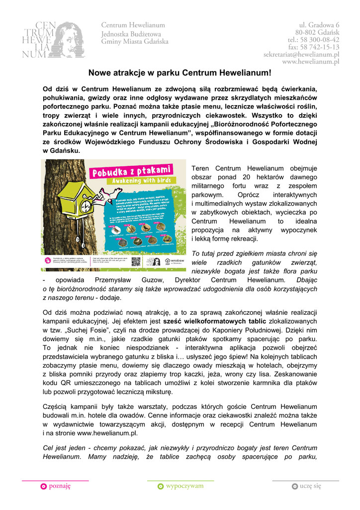 Nowe atrakcje w parku Centrum Hewelianum! Od dziś w Centrum Hewelianum ze zdwojoną siłą rozbrzmiewać będą ćwierkania, pohukiwania, gwizdy oraz inne odgłosy wydawane przez skrzydlatych mieszkańców pofortecznego parku. Poznać można także ptasie menu, lecznicze właściwości roślin, tropy zwierząt i wiele innych, przyrodniczych ciekawostek. Wszystko to dzięki zakończonej właśnie realizacji kampanii edukacyjnej „Bioróżnorodność Pofortecznego Parku Edukacyjnego w Centrum Hewelianum”, współfinansowanego w formie dotacji ze środków Wojewódzkiego Funduszu Ochrony Środowiska i Gospodarki Wodnej w Gdańsku. Teren Centrum Hewelianum obejmuje obszar ponad 20 hektarów dawnego militarnego fortu wraz z zespołem parkowym. Oprócz interaktywnych i multimedialnych wystaw zlokalizowanych w zabytkowych obiektach, wycieczka po Centrum Hewelianum to idealna propozycja na aktywny wypoczynek i lekką formę rekreacji. To tutaj przed zgiełkiem miasta chroni się wiele rzadkich gatunków zwierząt, niezwykle bogata jest także flora parku opowiada Przemysław Guzow, Dyrektor Centrum Hewelianum. Dbając o tę bioróżnorodność staramy sią także wprowadzać udogodnienia dla osób korzystających z naszego terenu - dodaje. Od dziś można podziwiać nową atrakcję, a to za sprawą zakończonej właśnie realizacji kampanii edukacyjnej. Jej efektem jest sześć wielkoformatowych tablic zlokalizowanych w tzw. „Suchej Fosie”, czyli na drodze prowadzącej do Kaponiery Południowej. Dzięki nim dowiemy się m.in., jakie rzadkie gatunki ptaków spotkamy spacerując po parku. To jednak nie koniec niespodzianek - interaktywna aplikacja pozwoli obejrzeć przedstawiciela wybranego gatunku z bliska i… usłyszeć jego śpiew! Na kolejnych tablicach zobaczymy ptasie menu, dowiemy się dlaczego owady mieszkają w hotelach, obejrzymy z bliska pomniki przyrody oraz złapiemy trop kaczki, jeża, wrony czy lisa. Zeskanowanie kodu QR umieszczonego na tablicach umożliwi z kolei stworzenie karmnika dla ptaków lub pozwoli przygotować leczniczą miksturę. Częścią kampanii były także warsztaty, podczas których goście Centrum Hewelianum budowali m.in. hotele dla owadów. Cenne informacje oraz ciekawostki znaleźć można także w wydawnictwie towarzyszącym akcji, dostępnym w recepcji Centrum Hewelianum i na stronie www.hewelianum.pl. Cel jest jeden - chcemy pokazać, jak niezwykły i przyrodniczo bogaty jest teren Centrum Hewelianum. Mamy nadzieję, że tablice zachęcą osoby spacerujące po parku, by z jeszcze większą uwagą i zachwytem przyjrzały się otaczającej przyrodzie - mówi Przemysław Guzow. Realizacja projektu pn. „Bioróżnorodność Pofortecznego Parku Edukacyjnego w Centrum Hewelianum” miała na celu zwiększenie wśród mieszkańców województwa pomorskiego, w tym wśród odwiedzających Centrum Hewelianum, wiedzy na temat różnorodności gatunków roślin i zwierząt występujących w parku oraz form ochrony stosowanych na jego obszarze. Projekt współfinansowany był ze środków Wojewódzkiego Funduszu Ochrony Środowiska i Gospodarki Wodnej w Gdańsku. Kontakt: Lucyna Rokitiańska, lucyna.rokitiań[email protected], 662 068 173.