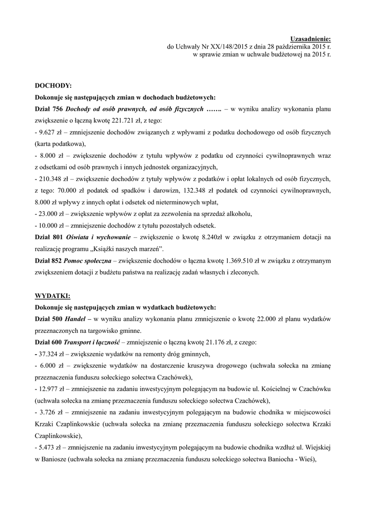 Uzasadnienie: do Uchwały Nr XX/148/2015 z dnia 28 października 2015 r. w sprawie zmian w uchwale budżetowej na 2015 r. DOCHODY: Dokonuje się następujących zmian w dochodach budżetowych: Dział 756 Dochody od osób prawnych, od osób fizycznych ……. – w wyniku analizy wykonania planu zwiększenie o łączną kwotę 221.721 zł, z tego: - 9.627 zł – zmniejszenie dochodów związanych z wpływami z podatku dochodowego od osób fizycznych (karta podatkowa), - 8.000 zł – zwiększenie dochodów z tytułu wpływów z podatku od czynności cywilnoprawnych wraz z odsetkami od osób prawnych i innych jednostek organizacyjnych, - 210.348 zł – zwiększenie dochodów z tytuły wpływów z podatków i opłat lokalnych od osób fizycznych, z tego: 70.000 zł podatek od spadków i darowizn, 132.348 zł podatek od czynności cywilnoprawnych, 8.000 zł wpływy z innych opłat i odsetek od nieterminowych wpłat, - 23.000 zł – zwiększenie wpływów z opłat za zezwolenia na sprzedaż alkoholu, - 10.000 zł – zmniejszenie dochodów z tytułu pozostałych odsetek. Dział 801 Oświata i wychowanie – zwiększenie o kwotę 8.240zł w związku z otrzymaniem dotacji na realizację programu „Książki naszych marzeń”. Dział 852 Pomoc społeczna – zwiększenie dochodów o łączna kwotę 1.369.510 zł w związku z otrzymanym zwiększeniem dotacji z budżetu państwa na realizację zadań własnych i zleconych. WYDATKI: Dokonuje się następujących zmian w wydatkach budżetowych: Dział 500 Handel – w wyniku analizy wykonania planu zmniejszenie o kwotę 22.000 zł planu wydatków przeznaczonych na targowisko gminne. Dział 600 Transport i łączność – zmniejszenie o łączną kwotę 21.176 zł, z czego: - 37.324 zł – zwiększenie wydatków na remonty dróg gminnych, - 6.000 zł – zwiększenie wydatków na dostarczenie kruszywa drogowego (uchwała sołecka na zmianę przeznaczenia funduszu sołeckiego sołectwa Czachówek), - 12.977 zł – zmniejszenie na zadaniu inwestycyjnym polegającym na budowie ul. Kościelnej w Czachówku (uchwała sołecka na zmianę przeznaczenia funduszu sołeckiego sołectwa Czachówek), - 3.726 zł – zmniejszenie na zadaniu inwestycyjnym polegającym na budowie chodnika w miejscowości Krzaki Czaplinkowskie (uchwała sołecka na zmianę przeznaczenia funduszu sołeckiego sołectwa Krzaki Czaplinkowskie), - 5.473 zł – zmniejszenie na zadaniu inwestycyjnym polegającym na budowie chodnika wzdłuż ul. Wiejskiej w Baniosze (uchwała sołecka na zmianę przeznaczenia funduszu sołeckiego sołectwa Baniocha - Wieś), - 10.000 zł – zmniejszenie wydatków w związku z rezygnacją z realizacji przedsięwzięcia dwuletniego (2015-2016) mającego polegać na modernizacji przepustu drogowego na drodze gminnej w Lininie, - 5.000,- zł – wprowadzenie nowego przedsięwzięcia dwuletniego (2015-2016) polegającego na budowie dwóch dróg gminnych na terenie dawnej Jednostki Wojskowej w Górze Kalwarii, - 37.324 zł – zmniejszenie na zadaniu polegającym na modernizacji ul. Sadowej w Czaplinku (zadanie zakończone). Dział 750 Administracja publiczna – zmniejszenie planu wydatków o łączną kwotę 23.000 zł, z tego: - 52.000 zł – zwiększenie planu wydatków bieżących Urzędu, - 75.000 zł – zmniejszenie planu wydatków na zadanie inwestycyjne polegające na modernizacji Ratusza. Dokonuje się przesunięcia pomiędzy zakupami inwestycyjnymi w kwocie 2.497 zł z zakupu urządzenia wielofunkcyjnego do Ratusza (wykonane) na komputeryzację Urzędu. Ponadto, w omawianej dziedzinie, następuje zmiana paragrafów klasyfikacji budżetowej polegająca na przesunięciu z §4300 kwoty 400 zł na § 4210 w związku z realizacją funduszu sołeckiego sołectwa Łubna (korekta techniczna). Dział 756 Dochody od osób prawnych, od osób fizycznych ……. – zwiększenie wydatków o kwotę 2.000 zł z przeznaczeniem na postępowanie sądowe względem dłużników. Dział 801 Oświata i wychowanie – zwiększenie wydatków o łączna kwotę 353.331 zł, w tym: - 310.860 zł – zwiększenie planu wydatków na placówki oświatowe (analiza wykonania planu wydatków bieżących), - 20.000 zł – zwiększenie planu wydatków z przeznaczeniem na zakup pieca konwekcyjno – parowego dla stołówki szkolnej w Zespole Szkół w Baniosze, - 8.240 zł – zwiększenie planów finansowych 5 placówek oświatowych w związku z otrzymaniem dotacji na realizację programu „Książki naszych marzeń”, - 9.417 zł – zwiększenie planu wydatków przeznaczonych na udzielenie dotacji dla niepublicznych przedszkoli działających na terenie gminy, - 4.814 zł – zwiększenie z przeznaczeniem na zakup pomocy dydaktycznych dla szkoły w Czachówku (uchwała sołecka na zmianę przeznaczenia funduszu sołeckiego sołectwa Czachówek). Dział 851 Ochrona zdrowia – zwiększenie planu wydatków o 23.000 zł z przeznaczeniem na realizację gminnego programu profilaktyki i rozwiązywania problemów alkoholowych i przeciwdziałania narkomanii. Dział 852 Pomoc społeczna – zwiększenie wydatków o łączną kwotę 1.369.510 zł zgodnie z otrzymanymi dotacjami z budżetu państwa. Dział 854 Edukacyjna opieka wychowawcza – zwiększenie planu wydatków o łączną kwotę 11.140 zł, z tego: - 13.500 zł – zmniejszenie planu wydatków przeznaczonych na funkcjonowanie świetlic szkolnych (oszczędności w planie), - 24.640 zł – zwiększenie planu wydatków na stypendia dla uczniów. Dział 900 Gospodarka komunalna i ochrona środowiska – zwiększenie planu wydatków o łączną kwotę 78.666 zł, z tego: - 5.000 zł – zwiększenie planu wydatków na zakup usług związanych z oczyszczaniem miasta i wsi, - 14.000 zł – zmniejszenie planu na zakup lamp oświetlenia ulicznego (oszczędności w planie), - 4.561 zł – zwiększenie planu na montaż oświetlenia ulicznego (3 szt.) - uchwała sołecka na zmianę przeznaczenia funduszu sołeckiego sołectwa B
