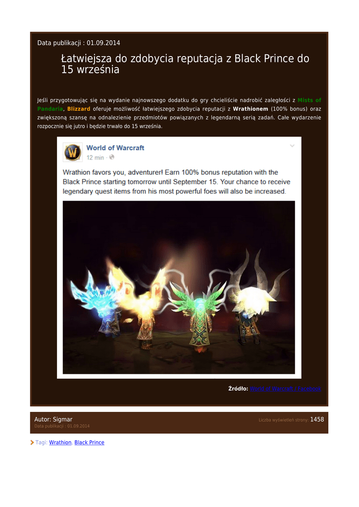 Data publikacji : 01.09.2014 Łatwiejsza do zdobycia reputacja z Black Prince do 15 września Jeśli przygotowując się na wydanie najnowszego dodatku do gry chcieliście nadrobić zaległości z Mists of Pandaria, Blizzard oferuje możliwość łatwiejszego zdobycia reputacji z Wrathionem (100% bonus) oraz zwiększoną szansę na odnalezienie przedmiotów powiązanych z legendarną serią zadań. Całe wydarzenie rozpocznie się jutro i będzie trwało do 15 września. Źródło: World of Warcraft / Facebook Autor: Sigmar Data publikacji : 01.09.2014 Tagi: Wrathion, Black Prince Liczba wyświetleń strony: 1458 Komentarz (0) dodaj komentarz Brak komentarzy dodaj komentarz Pozostałe nowości Zapowiedź zmian w klasach - Mnich Legion wkroczył w fazę alfa testów w czasie których dostępna jest póki co jedynie lokacja startowa łowców demonów, a my przyglądamy się temu, jakich zmian doczeka się klasa, która stosunkowo niedawno pojawiła się w World of Warcraft. Oto co na najnowszy dodatek Blizzard przygotował dla mnichów.Data publikacji: 24.11.20150 Zapowiedź zmian w klasach - Wojownik Po krótkiej przerwie wracamy z tłumaczeniami blogów poświęconych zmianom, jakie pojawią się w klasach w nadchodzącym dodatku do World of Warcraft. Oto czego powinni spodziewać się wojownicy z Azeroth w LegionieData publikacji: 23.11.20150 Zapowiedź zmian w klasach - Szaman Kolejna zapowiedzieć, która pojawiła się jakiś czas temu na łamach oficjalnej strony społecznościowej dotyczy szamana. Największe zmiany w przypadku tej klasy dotknęły totemy oraz system zasobów specjalizacji Elemental oraz EnhancementData publikacji: 16.11.20150 11 urodziny World of Warcraft World of Warcraft obchodzi już swoje 11 urodziny. Z tej okazji Blizzard przygotował kilka zabawek, które powinny wszystkim przypomnieć sam początek przygody w świecie Azeroth - w rolach głównych Edwin VanCleef, Hogger, murlok oraz Windfury (w wersji nadmuchiwanej).Data publikacji: 16.11.20150 Zapowiedź zmian w klasach - Rycerz śmierci Kolejna zapowiedź opublikowana na łamach oficjalnej strony społecznościowej World of Warcraft poświęcona jest klasie rycerzy śmierci. Poniżej znajdziecie informacje między innymi o ujednoliceniu wszystkich run oraz nowej umiejętności specjalizacji Blood, która została zainspirowana Lordem Marrowgarem z Icecrown Citadel.Data publikacji: 15.11.20150 Wszystkie nowości