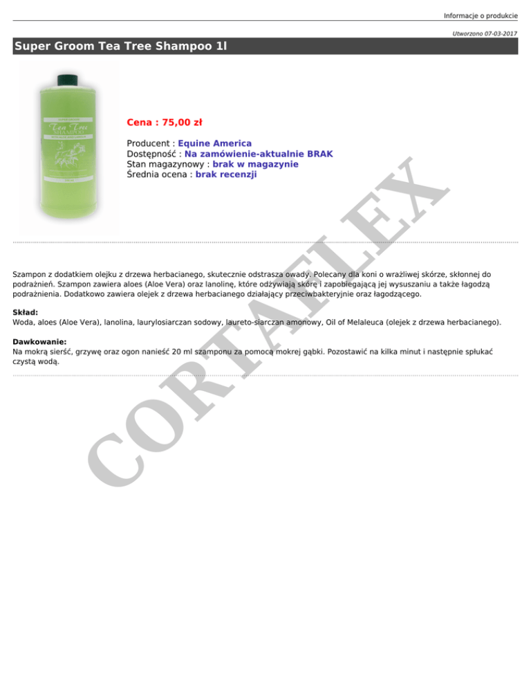 Informacje o produkcie Utworzono 07-03-2017 Super Groom Tea Tree Shampoo 1l Cena : 75,00 zł FL EX Producent : Equine America Dostępność : Na zamówienie-aktualnie BRAK Stan magazynowy : brak w magazynie Średnia ocena : brak recenzji Szampon z dodatkiem olejku z drzewa herbacianego, skutecznie odstrasza owady. Polecany dla koni o wrażliwej skórze, skłonnej do podrażnień. Szampon zawiera aloes (Aloe Vera) oraz lanolinę, które odżywiają skórę i zapobiegającą jej wysuszaniu a także łagodzą podrażnienia. Dodatkowo zawiera olejek z drzewa herbacianego działający przeciwbakteryjnie oraz łagodzącego. TA Skład: Woda, aloes (Aloe Vera), lanolina, laurylosiarczan sodowy, laureto-siarczan amonowy, Oil of Melaleuca (olejek z drzewa herbacianego). C O R Dawkowanie: Na mokrą sierść, grzywę oraz ogon nanieść 20 ml szamponu za pomocą mokrej gąbki. Pozostawić na kilka minut i następnie spłukać czystą wodą.