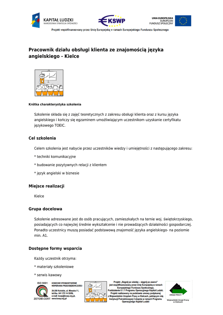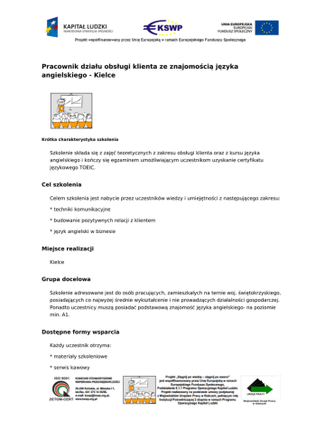 Pracownik działu obsługi klienta ze znajomością języka angielskiego - Kielce . Krótka charakterystyka szkolenia Szkolenie składa się z zajęć teoretycznych z zakresu obsługi klienta oraz z kursu języka angielskiego i kończy się egzaminem umożliwiającym uczestnikom uzyskanie certyfikatu językowego TOEIC. Cel szkolenia Celem szkolenia jest nabycie przez uczestników wiedzy i umiejętności z następującego zakresu: * techniki komunikacyjne * budowanie pozytywnych relacji z klientem * język angielski w biznesie Miejsce realizacji Kielce Grupa docelowa Szkolenie adresowane jest do osób pracujących, zamieszkałych na ternie woj. świętokrzyskiego, posiadających co najwyżej średnie wykształcenie i nie prowadzących działalności gospodarczej. Ponadto uczestnicy muszą posiadać podstawową znajomość języka angielskiego- na poziomie min. A1. Dostępne formy wsparcia Każdy uczestnik otrzyma: * materiały szkoleniowe * serwis kawowy * zwrot kosztów dojazdu * zaświadczenie o ukończeniu szkolenia Szczegółowych informacji udziela: Iwona Klimczyk tel. 41 343 17 80 Elementy powiązane ● . Sięgnij po wiedzę – sięgnij po awans