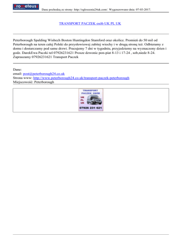 Dane pochodzą ze strony: http://ogloszenia24uk.com/. Wygenerowano dnia: 07-03-2017. TRANSPORT PACZEK osób UK PL UK Peterborough Spalding Wisbech Boston Huntingdon Stamford oraz okolice. Promień do 50 mil od Peterborough na teren całej Polski do przysłowiowej zabitej wiochy i w drugą stronę też. Odbieramy z domu i dostarczamy pod same drzwi. Pracujemy 7 dni w tygodniu, przyjedziemy na wyznaczony dzien i godz. DarekEwa Paczki tel 07926231621 Prosze dzwonic pon-piat 8-13 i 17-24 , sob,niedz 8-24. Zapraszamy 07926231621 Transport Paczek Dane: email: [email protected] Strona www: http://www.peterborough24.co.uk/transport-paczek-peterborough Miejscowość: Peterborough