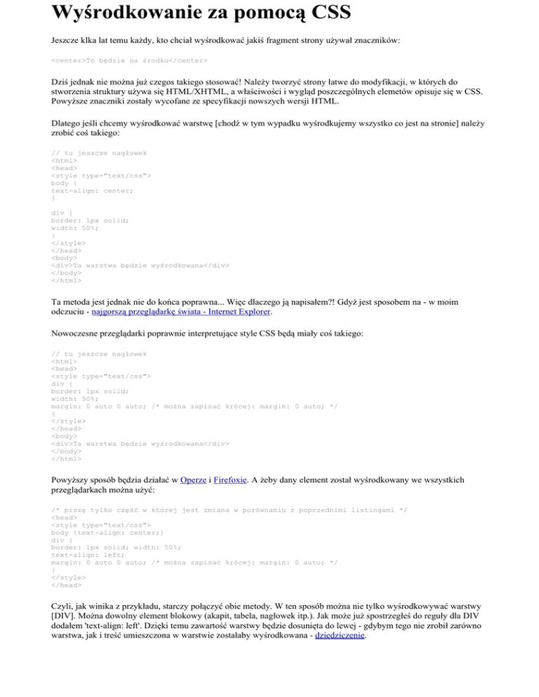 Jeszcze klka lat temu każdy, kto chciał wyśrodkować jakiś fragment strony używał znaczników: