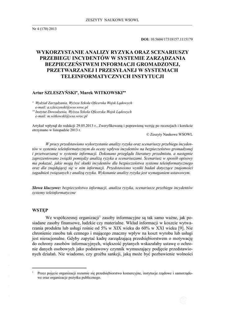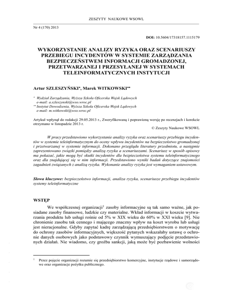 ZESZYTY NAUKOWE WSOWL Nr 4 (170) 2013 ISSN 1731-8157 DOI: 10.5604/17318157.1115179 WYKORZYSTANIE ANALIZY RYZYKA ORAZ SCENARIUSZY PRZEBIEGU INCYDENTÓW W SYSTEMIE ZARZĄDZANIA BEZPIECZEŃSTWEM INFORMACJI GROMADZONEJ, PRZETWARZANEJ I PRZESYŁANEJ W SYSTEMACH TELEINFORMATYCZNYCH INSTYTUCJI Artur SZLESZYŃSKI, Marek WITKOWSKI Wydział Zarządzania, Wyższa Szkoła Oficerska Wojsk Lądowych e-mail: [email protected] Instytut Dowodzenia, Wyższa Szkoła Oficerska Wojsk Lądowych e-mail: [email protected] Artykuł wpłynął do redakcji 29.05.2013 r., Zweryfikowaną i poprawioną wersję po recenzjach i korekcie otrzymano w listopadzie 2013 r. © Zeszyty Naukowe WSOWL W pracy przedstawiono wykorzystanie analizy ryzyka oraz scenariuszy przebiegu incydentów w systemie teleinformatycznym do oceny wpływu incydentów na bezpieczeństwo gromadzonej i przetwarzanej w systemie informacji. Dokonano przeglądu literatury przedmiotu, a następnie zaprezentowano związki pomiędzy analizą ryzyka a scenariuszami. Scenariusz w sposób opisowy ma pokazać, jakie mogą być skutki incydentów dla bezpieczeństwa systemu teleinformatycznego oraz dla znajdującej się w nim informacji. Przedstawiono wyniki badań dotyczące znajomości zagadnień związanych z analizą ryzyka. Wykonanie analizy ryzyka jest wymaganiem ustawowym. Słowa kluczowe: bezpieczeństwo informacji, analiza ryzyka, scenariusze przebiegu incydentów systemy teleinformatyczne We współczesnej organizacji1 zasoby informacyjne są tak samo ważne, jak posiadane zasoby finansowe, ludzkie czy materialne. Wkład informacji w koszcie wytwarzania produktu lub usługi rośnie od 5% w XIX wieku do 60% w XXI wieku [9]. Nie chronienie zasobu tak cennego i mającego znaczny wpływ na koszt wyrobu lub usługi jest nieracjonalne. Gdyby zapytać kadrę zarządzającą przedsiębiorstwem o motywację do ochrony zasobów informacyjnych, większość pytanych wskazałaby ustawę o ochronie danych osobowych jako podstawowy czynnik wymuszający podjęcie przedstawionych działań. Nie wiadomo, czy groźba sankcji, jaką może być pozbawienie wolności - - WSTĘP - - - 1 Przez pojęcie organizacji rozumie się przedsiębiorstwo komercyjne, instytucje rządowe i samorządowe oraz organizacje pożytku publicznego. Artur SZLESZYŃSKI, Marek WITKOWSKI lub kara finansowa, jest większym czynnikiem motywującym do ochrony zasobów informacyjnych [14]. Abstrahując od kwestii motywacji do ochrony zasobów informacyjnych, należy odnieść się do kwestii związanych z systemem ochrony informacji wewnątrz organizacji. Przyjęte w tytule artykułu ograniczenie do zasobów, które są gromadzone i przetwarzane w systemach teleinformatycznych wynika z rozpowszechnienia środków elektronicznej obróbki informacji wykorzystywanych w organizacjach. Środki te umożliwiają obróbkę dużych zbiorów danych2 oraz wygodną, dla odbiorcy, prezentację wyników obróbki. Wygoda odbiorcy, oprócz walorów estetycznych wynikających z graficznej formy prezentacji wyników przetwarzania, posiada również wymiar utylitarny. Oznacza on, że użytkownik przetworzonych informacji właściwie ocenia sytuację oraz podejmuje adekwatne decyzje. Dąży się zatem do zmniejszenia wartości entropii informacji do zera, co jednocześnie ogranicza niepewność decyzyjną. Należy ją rozumieć jako ryzyko związane z możliwością wystąpienia niewłaściwie podjętej decyzji oraz jej konsekwencjami. Oba warunki można wyrazić przy pomocy wzorów (1) i (2). n H x = xi lgxi 0, (1) i=1 gdzie: H(x) – entropia informacji, xi – prawdopodobieństwo wystąpienia informacji i-tej, Z i Z min , (2) gdzie: Z(i) – niepewność decyzyjna związana z wykorzystaniem informacji i-tej, Zmin – akceptowana niepewność lub minimalne ryzyko decyzyjne związane z wykorzystaniem informacji i-tej. Konieczność ochrony zasobów informacyjnych organizacji jest wymaganiem zawartym w aktach prawnych takich jak np.: ustawa o ochronie danych osobowych czy - - Mówiąc o bezpieczeństwie informacji, znajdującej się w systemie teleinformatycznym, należy uściślić pojęcie bezpieczeństwa informacji. Definicja, którą można znaleźć w literaturze przedmiotu stwierdza, że bezpieczeństwo „jest to brak poczucia obecności zagrożenia” [2]. Przedstawiona definicja jest filozoficzna i odnosi się do stanu psychicznego osoby, która odczuwa lub nie obecność zagrożeń dla swojej egzystencji. Próba zbudowania systemu chroniącego bezpieczeństwo informacji na podstawie subiektywnego kryterium, takiego jak brak obecności zagrożeń, jest nie możliwa. Dlatego bezpieczeństwo informacji będzie rozumiane jako „zachowanie atrybutów bezpieczeństwa informacji, takich jak: poufność, integralność i dostępność” [5]. Rozwinięte definicje poszczególnych atrybutów zawarte są w normie PN ISO/IEC-17799:2007, dlatego znaczenie atrybutów nie będzie wyjaśniane. Pod pojęciem dużego zbioru danych rozumie się pliki o rozmiarze od dziesiątek MB do TB. W przypadku baz danych są bazy zawierające powyżej 10000 rekordów. - - 2 - 154 WYKORZYSTANIE ANALIZY RYZYKA ORAZ SCENARIUSZY PRZEBIEGU INCYDENTÓW … ustawa o ochronie informacji niejawnych [15]. Wymienione ustawy nie są jedynymi aktami prawnymi regulującymi kwestie ochrony zasobów informacyjnych 3, jakie występują w polskim systemie prawnym. Nieprzestrzeganie przez organizację zapisów ustaw wiąże się z sankcjami karnymi w postaci grzywny lub kary pozbawienia wolności [14]. Z zaniechaniem ochrony zasobów informacyjnych związane są konsekwencje niematerialne, takie jak utrata pozytywnego wizerunku czy odejście grupy klientów danej organizacji. Niematerialność związana jest z brakiem możliwości dokładnego określenia rozmiaru strat. Do ich określenia można posłużyć się jedynie szacunkami wykorzystującymi dane historyczne, które dotyczą podobnych przypadków. Ochrona zasobów informacyjnych organizacji motywowana