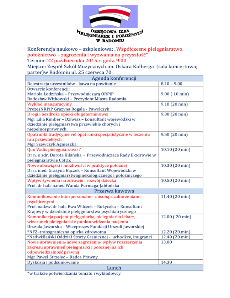 Konferencja naukowo – szkoleniowa: „Współczesne pielęgniarstwo, położnictwo – zagrożenia i wyzwania na przyszłość” Termin: 22 października 2015 r. godz. 9.00 Miejsce: Zespół Szkół Muzycznych im. Oskara Kolberga (sala koncertowa; parter)w Radomiu ul. 25 czerwca 70 Agenda konferencji Rejestracja uczestników - kawa na powitanie Otwarcie konferencji: Mariola Łodzińska – Przewodniczącą ORPiP Radosław Witkowski – Prezydent Miasta Radomia Wykład inauguracyjny PrezesNRPiP Grażyna Rogala - Pawelczyk Drogi i bezdroża opieki długoterminowej Mgr Lilia Kimber – Dziwisz – konsultant wojewódzki w dziedzinie pielęgniarstwa przewlekle chorych i niepełnosprawnych Opatrunki tradycyjne vel opatrunki specjalistyczne w leczeniu ran przewlekłych Mgr Szewczyk Agnieszka Quo Vadis pielęgniarstwo ? Dr n. o zdr. Dorota Kilańska – Przewodnicząca Rady E-zdrowie w pielęgniarstwie CSIOZ Nowe obowiązki i możliwości w praktyce położnej Dr n. med. Grażyna Bączek – Konsultant Wojewódzki w dziedzinie pielęgniarstwaginekologicznego i położniczego Wpływ żywienia na zdrowie i rozwój dziecka Prof. dr hab. n.med Wanda Furmaga-Jabłońska 8.10 – 9.00 9.00 ( 10 min) 9.10 (20 min) 9.30 (20 min) 9.50 (20 min) 10.10 (20 min) 10.30 (20 min) 10.50 (20 min) Przerwa kawowa Komunikowanie interpersonalne z osobą z zaburzeniami psychicznymi Prof. nadzw. dr hab. Ewa Wilczek – Rużyczka – Konsultant Krajowy w dziedzinie pielęgniarstwa psychiatrycznego Komunikacja pacjent pielęgniarka, pielęgniarka lekarz, wizerunek pielęgniarki z punktu widzenia pacjenta Urszula Jaworska – Wiceprezes Fundacji Urszuli Jaworskiej *NFZ–transgraniczna opieka zdrowotna *Nadwiślański Oddział Straży Granicznej - uchodźcy, imigranci Nowe uprawnienia-nowe zagrożenia- wpływ rozszerzenia zakresu uprawnień pielęgniarki i położnej na ich odpowiedzialność prawną Mgr Paweł Strzelec – Radca Prawny Dyskusja i podsumowanie Lunch *w trakcie potwierdzania tematu i wykładowcy 11.40 (20 min) 12.00 ( 20 min) 12.20 (20.min) 12.40 (20 min) 13.00 14.30