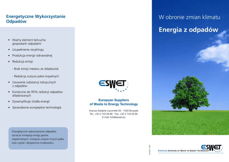 W obronie zmian klimatu Energetyczne Wykorzystanie Odpadów Energia z odpadów Ważny element łańcucha gospodarki odpadami ■ Uzupełnienie recyklingu ■ Produkcja energii odnawialnej ■ Redukcja emisji: ■ - Brak emisji metanu ze składowisk - Redukcja zużycia paliw kopalnych Usuwanie substancji toksycznych z odpadów ■ onieczne do 95% redukcji odpadów K składowanych ■ Dywersyfikuje źródła energii ■ Sprawdzone europejskie technologie European Suppliers of Waste to Energy Technology ■ Avenue Adolphe Lacomblé 59 - 1030 Brussels Tel.: +32 2 743 29 88 - Fax: +32 2 743 29 90 E-mail: [email protected] © ESWET 2009 Energetyczne wykorzystanie odpadów oznacza mniejszą emisję gazów cieplarnianych, mniejsze zużycie innych paliw oraz czyste i bezpieczne środowisko. Narzędzie w ochronie klimatu Zmiana w traktowaniu odpadów automatycznie redukuje zużycie paliw kopalnych a w konsekwencji redukcję emisji CO2. Czy o tym wiesz? Sortowane odpady komunalne mają wartość opałową 10,000kJ/kg. Energia z każdego kilograma odpadów może zasilić żarówkę energooszczędną 12W (odpowiednik tradycyjnej żarówki 60W) przez 75 godzin. Termiczne wykorzystanie odpadów redukuje w Europie emisję 30 milionów ton CO2 w stosunku do zużycia węgla lub o 15 milionów ton w przypadku zużycia gazu. Energia z odpadów dywersyfikuje źródła energii i zapewnia ją w przyszłości. Energia z odpadów jest rozwiązaniem pozwalającym na redukcję metanu ze składowisk a 60% odpadów to neutralna względem emisji biomasa. Źródło czystej energii Uzyskanie maksymalnej ilości energii z odpadów wymaga doświadczenia i stosowania najnowszych technologii. Tę wiedzę ESWET może przekazać poprzez swoich członków. Dokładnie monitorowane gazy spalinowe są neutralizowane przed skierowaniem do atmosfery. Nowoczesne spalarnie mają najniższą emisję wśród innych branż przemysłowych, aczkolwiek nie było tak w przeszłości. Jest oczywiste, że energia z odpadów jest również jedynym bezpiecznym sposobem pozbycia się substancji toksycznych. Patrz na dane E-PRTR dostępne na: http://prtr.ec.europa.eu Zintegrowana gospodarka odpadami i źródło zielonej energii. Nowoczesna, zintegrowana gospodarka odpadami opiera się na kombinacji sortowania, zbiórki selektywnej, recyklingu oraz produkcji energii. Powoduje redukcję o 95% ilości odpadów składowanych. Termiczne przekształcanie odpadów jest jedyną alternatywą dla składowania. Dodatkową zaletą jest produkcja ciepła lub/i energii elektrycznej. Spalarnia odpadów – jak pracuje? W trosce o przyszłość świata. Nieograniczone źródło energii Obecnie w Europie energia elektryczna produkowana z odpadów odpowiada zapotrzebowaniu kraju wielkości Słowacji lub Irlandii. Celem ESWET jest osiągnięcie określonego Dyrektywami 50% współczynnika recyklingu i czterokrotne zwiększenie produkcji energii z odpadów w porównaniu z sytuacją obecną. Energia z odpadów – czyste środowisko w przyszłości Zakład odbiera odpady komunalne i spala je. Energia (ciepło lub/i energia elektryczna) jest odzyskiwana ze spalin i przekazywana do sieci odbiorczej. Gazy spalinowe przed skierowaniem do atmosfery są poddawane oczyszczaniu i neutralizacji.