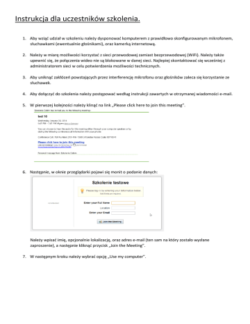 Instrukcja dla uczestników szkolenia. 1. Aby wziąć udział w szkoleniu należy dysponować komputerem z prawidłowo skonfigurowanym mikrofonem, słuchawkami (ewentualnie głośnikami), oraz kamerką internetową. 2. Należy w miarę możliwości korzystać z sieci przewodowej zamiast bezprzewodowej (WiFi). Należy także upewnić się, że połączenia wideo nie są blokowane w danej sieci. Najlepiej skontaktować się wcześniej z administratorem sieci w celu potwierdzenia możliwości technicznych. 3. Aby uniknąć zakłóceń powstających przez interferencję mikrofonu oraz głośników zaleca się korzystanie ze słuchawek. 4. Aby dołączyć do szkolenia należy postępować według instrukcji zawartych w otrzymanej wiadomości e-mail. 5. W pierwszej kolejności należy klinąć na link „Please click here to join this meeting”. 6. Następnie, w oknie przeglądarki pojawi się monit o podanie danych: Należy wpisać imię, opcjonalnie lokalizację, oraz adres e-mail (ten sam na który zostało wysłane zaproszenie), a następnie kliknąć przycisk „Join the Meeting”. 7. W następnym kroku należy wybrać opcję „Use my computer”. 8. Wyświetlona zostanie informacja ze wskazówkami podpowiadającymi jak uzyskać najlepsze rezultaty podczas korzystania ze szkolenia: Zaleca się korzystanie ze słuchawek – powoduje to wyeliminowanie zakłóceń. Aby dołączyć do szkolenia należy klinąć na przycisk „Got it, thanks!” 9. Następuje podłączenie do szkolenia. Pojawia się następujący ekran: W centralnej części ekranu wyświetlony jest obraz z kamery prowadzącego szkolenie. Po lewej stronie ekranu znajdują się dwa obszary: • lista uczestników • czat Istnieje możliwość wysyłania wiadomości do wszystkich uczestników (Send to Everyone) albo do prowadzącego (Send to Presenters). 10. Jeżeli uczestnik szkolenia ma także udostępniać widok ze swojej kamery, wystarczy kliknąć na ikonę kamery w górnym obszarze ekranu: Po kliknięciu na ikonę kamery należy zezwolić na dostęp do kamery i mikrofonu klikając Zezwól: Następnie w centralnym obszarze ekranu widoczny będzie zarówno prowadzący jak i uczestnik: 11. Podczas szkolenia uczestnik ma możliwość włączenia oraz wyłączenia mikrofonu – wystarczy kliknąć na ikonę mikrofonu znajdującą się na liście uczestników szkolenia. 12. Kamerę oraz mikrofon można także w każdej chwili włączyć lub wyłączyć używając ikon znajdujących się w górnym obszarze ekranu: 13. Aby zakończyć udział w szkoleniu wystarczy zamknąć okno przeglądarki internetowej.