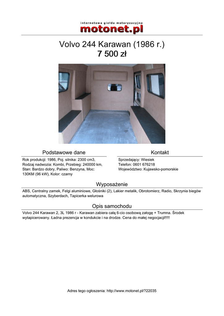 Volvo 244 Karawan (1986 r.) 7 500 zł Podstawowe dane Kontakt Rok produkcji: 1986, Poj. silnika: 2300 cm3, Rodzaj nadwozia: Kombi, Przebieg: 240000 km, Stan: Bardzo dobry, Paliwo: Benzyna, Moc: 130KM (96 kW), Kolor: czarny Sprzedający: Wiesiek Telefon: 0601 676218 Województwo: Kujawsko-pomorskie Wyposażenie ABS, Centralny zamek, Felgi aluminiowe, Głośniki (2), Lakier metalik, Obrotomierz, Radio, Skrzynia biegów automatyczna, Szyberdach, Tapicerka welurowa Opis samochodu Volvo 244 Karawan 2, 3L 1986 r - Karawan zabiera całą 6-cio osobową załogę + Trumna. Środek wytapicerowany. Ładna prezencja w kondukcie i na drodze. Cena do małej negocjacji!!!!! Adres tego ogłoszenia: http://www.motonet.pl/?22035