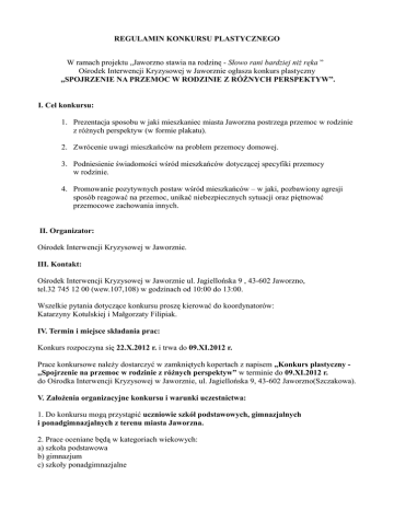 REGULAMIN KONKURSU PLASTYCZNEGO W ramach projektu „Jaworzno stawia na rodzinę - Słowo rani bardziej niż ręka ” Ośrodek Interwencji Kryzysowej w Jaworznie ogłasza konkurs plastyczny „SPOJRZENIE NA PRZEMOC W RODZINIE Z RÓŻNYCH PERSPEKTYW”. I. Cel konkursu: 1. Prezentacja sposobu w jaki mieszkaniec miasta Jaworzna postrzega przemoc w rodzinie z różnych perspektyw (w formie plakatu). 2. Zwrócenie uwagi mieszkańców na problem przemocy domowej. 3. Podniesienie świadomości wśród mieszkańców dotyczącej specyfiki przemocy w rodzinie. 4. Promowanie pozytywnych postaw wśród mieszkańców – w jaki, pozbawiony agresji sposób reagować na przemoc, unikać niebezpiecznych sytuacji oraz piętnować przemocowe zachowania innych. II. Organizator: Ośrodek Interwencji Kryzysowej w Jaworznie. III. Kontakt: Ośrodek Interwencji Kryzysowej w Jaworznie ul. Jagiellońska 9 , 43-602 Jaworzno, tel.32 745 12 00 (wew.107,108) w godzinach od 10:00 do 13:00. Wszelkie pytania dotyczące konkursu proszę kierować do koordynatorów: Katarzyny Kotulskiej i Małgorzaty Filipiak. IV. Termin i miejsce składania prac: Konkurs rozpoczyna się 22.X.2012 r. i trwa do 09.XI.2012 r. Prace konkursowe należy dostarczyć w zamkniętych kopertach z napisem „Konkurs plastyczny „Spojrzenie na przemoc w rodzinie z różnych perspektyw” w terminie do 09.XI.2012 r. do Ośrodka Interwencji Kryzysowej w Jaworznie, ul. Jagiellońska 9, 43-602 Jaworzno(Szczakowa). V. Założenia organizacyjne konkursu i warunki uczestnictwa: 1. Do konkursu mogą przystąpić uczniowie szkół podstawowych, gimnazjalnych i ponadgimnazjalnych z terenu miasta Jaworzna. 2. Prace oceniane będą w kategoriach wiekowych: a) szkoła podstawowa b) gimnazjum c) szkoły ponadgimnazjalne 2. Jedna osoba może zgłosić do konkursu tylko jedną pracę. 3. Nie przyjmujemy prac zbiorowych. 4. Temat pracy: „Spojrzenie na przemoc w rodzinie z różnych perspektyw”. 5. Forma pracy: - format A4 (kartka z bloku technicznego) - technika wykonania pracy - dowolna 6. Każda praca musi być opatrzona na odwrocie czytelnym opisem zawierającym następujące informacje: a) Imię i nazwisko autora pracy, klasa, szkoła (adres i telefon szkoły) oraz imię i nazwisko oraz telefon kontaktowy do opiekuna pod kierunkiem, którego została praca wykonana. b) Do pracy proszę dodatkowo dołączyć zgody o treści: „Wyrażam zgodę na prezentację i publikację mojej pracy przez Ośrodek Interwencji Kryzysowej w Jaworznie na stronach internetowych i w mediach”(zał. 1). „Wyrażam zgodę na przetwarzanie moich danych osobowych dla potrzeb procesu rekrutacji (zgodnie z ustawą o ochronie danych osobowych z dnia 29.08.1997 Dz.U. z 2002 r. Nr 101, pozycja 926 z późniejszymi zmianami)" (zał. 2). c) Osoby niepełnoletnie dołączają w/w zgody podpisane przez rodziców lub opiekunów prawnych. d) Organizatorzy nie zwracają nadesłanych prac, natomiast w stosunku do nagrodzonych prac zastrzegają sobie prawo do ich prezentacji i publikacji bez honorarium za prawa autorskie na stronach internetowych i w mediach. 7. W konkursie mogą brać udział jedynie te prace, które nie były publikowane oraz nie brały udziału w żadnym konkursie. 8. W konkursie mogą brać udział jedynie prace będące wynikiem indywidualnej pracy twórczej, nie zawierające słów powszechnie uznanych za obraźliwe, cytatów, nie naruszające praw autorskich oraz jakichkolwiek innych praw osób trzecich. 9. Złamanie postanowień regulaminu wiąże się z dyskwalifikacją zgłoszonej pracy. 10.Laureaci konkursu oraz Szkoły zostaną poinformowani o wynikach konkursu telefonicznie oraz pocztą elektroniczną. 11. Prezentacja nagrodzonych prac i uroczyste wręczenie nagród odbędzie się podczas Seminarium „Jaworzno stawia na rodzinę – Słowo rani bardziej niż ręka” w Sali Obrad Urzędu Miejskiego w Jaworznie dnia 05.12.2012 r. VI. Jury: 1. Wszystkie prace nadesłane do konkursu podlegają ocenie Jury powołanego przez Organizatorów. 2. Z przebiegu konkursu Jury przygotowuje protokół zawierający listę laureatów. 3. Spośród nadesłanych prac konkursowych, Jury wybierze po trzy prace w każdej kategorii wiekowej, które zajmą I miejsce, II miejsce i III miejsce. VII. Kryteria oceny prac konkursowych 1. Jury dokonuje oceny po zakończeniu okresu trwania konkursu biorąc pod uwagę jakość, oryginalność, wyjątkowość złożonych prac. VIII. Nagrody: 1. Uczniowie, którzy zajmą trzy pierwsze miejsca w swojej kategorii wiekowej otrzymają nagrody rzeczowe. X Sekretarz konkursu 1.Sekretarzem konkursu jest Małgorzata Filipiak – pracownik Ośrodka Interwencji Kryzysowej w Jaworznie. 2. Sekretarz konkursu przyjmuje dostarczone prace i przekazuje Jury. XII. Postanowienia końcowe 1. Prace pisemne po zakończeniu konkursu nie będą odsyłane autorom. 2. Decyzja jury jest ostateczna (nie przysługuje odwołanie od werdyktu). 3. Udział w konkursie jest równoznaczny z akceptacją niniejszego regulaminu. 4. Regulamin dostępny jest na stronie internetowej Ośrodka Interwencji Kryzysowej w Jaworznie – www.oik.jaworzno.pl ZAŁĄCZNIK NR 1 Jaworzno, dn. ............................. ZGODA „Wyrażam zgodę na prezentację i publikację mojej pracy/pracy mojego dziecka* przez Ośrodek Interwencji Kryzysowej w Jaworznie na stronach internetowych i w mediach”. ........................................................... czytelny podpis * niepotrzebne skreślić ZAŁĄCZNIK NR 2 Jaworzno, dn. ............................. ZGODA "Wyrażam zgodę na przetwarzanie moich danych/danych mojego dziecka* osobowych dla potrzeb procesu rekrutacji (zgodnie z ustawą o ochronie danych osobowych z dnia 29.08.1997 Dz.U. z 2002 r. Nr 101, pozycja 926 z późniejszymi zmianami)". ........................................................ czytelny podpis * niepotrzebne skreślić