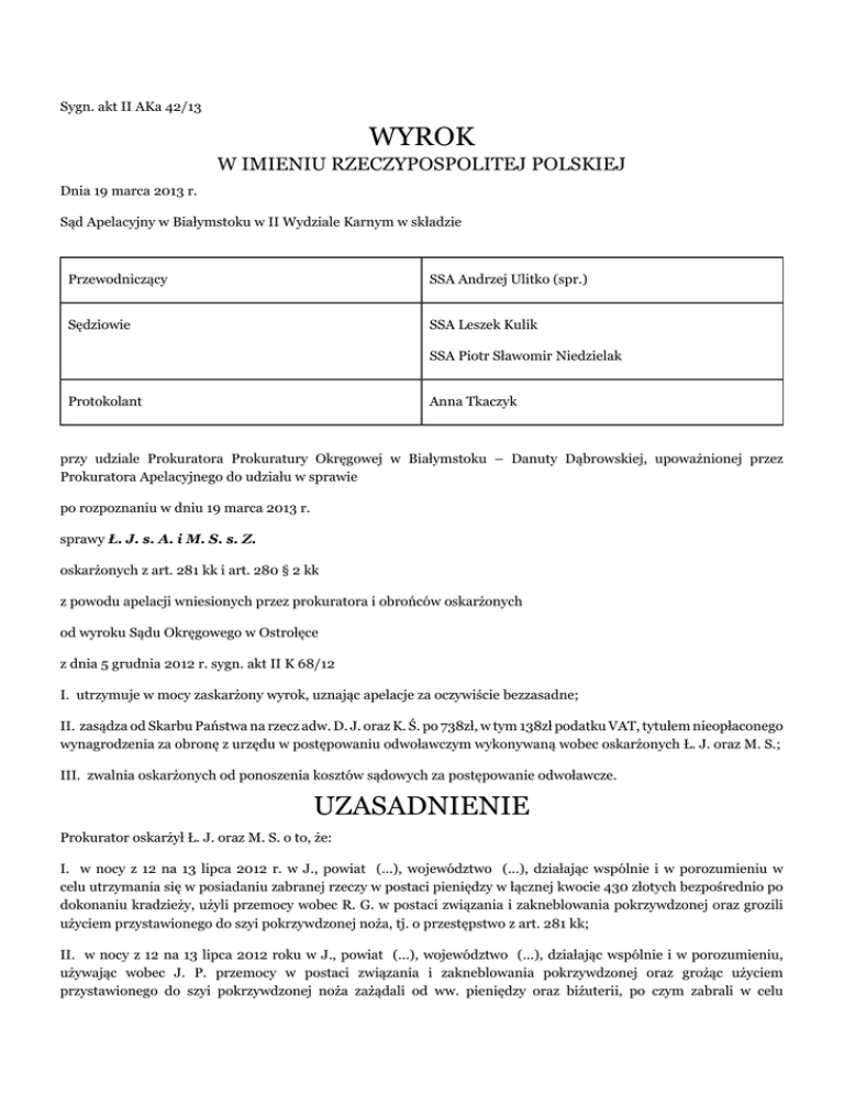 Sygn. akt II AKa 42/13 WYROK W IMIENIU RZECZYPOSPOLITEJ POLSKIEJ Dnia 19 marca 2013 r. Sąd Apelacyjny w Białymstoku w II Wydziale Karnym w składzie Przewodniczący SSA Andrzej Ulitko (spr.) Sędziowie SSA Leszek Kulik SSA Piotr Sławomir Niedzielak Protokolant Anna Tkaczyk przy udziale Prokuratora Prokuratury Okręgowej w Białymstoku – Danuty Dąbrowskiej, upoważnionej przez Prokuratora Apelacyjnego do udziału w sprawie po rozpoznaniu w dniu 19 marca 2013 r. sprawy Ł. J. s. A. i M. S. s. Z. oskarżonych z art. 281 kk i art. 280 § 2 kk z powodu apelacji wniesionych przez prokuratora i obrońców oskarżonych od wyroku Sądu Okręgowego w Ostrołęce z dnia 5 grudnia 2012 r. sygn. akt II K 68/12 I. utrzymuje w mocy zaskarżony wyrok, uznając apelacje za oczywiście bezzasadne; II. zasądza od Skarbu Państwa na rzecz adw. D. J. oraz K. Ś. po 738zł, w tym 138zł podatku VAT, tytułem nieopłaconego wynagrodzenia za obronę z urzędu w postępowaniu odwoławczym wykonywaną wobec oskarżonych Ł. J. oraz M. S.; III. zwalnia oskarżonych od ponoszenia kosztów sądowych za postępowanie odwoławcze. UZASADNIENIE Prokurator oskarżył Ł. J. oraz M. S. o to, że: I. w nocy z 12 na 13 lipca 2012 r. w J., powiat (...), województwo (...), działając wspólnie i w porozumieniu w celu utrzymania się w posiadaniu zabranej rzeczy w postaci pieniędzy w łącznej kwocie 430 złotych bezpośrednio po dokonaniu kradzieży, użyli przemocy wobec R. G. w postaci związania i zakneblowania pokrzywdzonej oraz grozili użyciem przystawionego do szyi pokrzywdzonej noża, tj. o przestępstwo z art. 281 kk; II. w nocy z 12 na 13 lipca 2012 roku w J., powiat (...), województwo (...), działając wspólnie i w porozumieniu, używając wobec J. P. przemocy w postaci związania i zakneblowania pokrzywdzonej oraz grożąc użyciem przystawionego do szyi pokrzywdzonej noża zażądali od ww. pieniędzy oraz biżuterii, po czym zabrali w celu przywłaszczenia pieniądze w łącznej kwocie 350 złotych oraz biżuterię w postaci srebrnych kolczyków wartości 200 złotych, złotego łańcuszka wartości 1.000 złotych oraz łańcuszka z białego złota o wartości 400 złotych, działając na szkodę J. P., tj. o przestępstwo z art. 280 § 2 kk. Wyrokiem z dnia 5 grudnia 2012 r. Sąd Okręgowy w Ostrołęce uznał oskarżonych Ł. J. i M. S. w ramach zarzucanych im czynów opisanych w pkt. I i II aktu oskarżenia za winnych tego, że w nocy z 12 na 13 lipca 2012 r. w J., powiat (...), województwo (...), działając wspólnie i w porozumieniu, dopuścili się rozboju w ten sposób, że posługując się niebezpiecznym przedmiotem w postaci noża, poprzez przystawienie go do ciała R. G. i J. P., grozili pokrzywdzonym natychmiastowym użyciem przemocy, a następnie zabrali w celu przywłaszczenia pieniądze w kwocie 430 złotych na szkodę R. G., oraz pieniędzy w kwocie 350 złotych, srebrne kolczyki o wartości 200 złotych, złotych łańcuszek wartości 1.000 złotych i łańcuszek z białego złota wartości 400 złotych na szkodę J. P. tj. czynu z art. 280 § 2 kk i za to na podstawie art. 280 § 2 kk skazał ich na karę po 4 lata pozbawienia wolności. Na mocy art. 63 § 1 kk na poczet orzeczonej kary pozbawienia wolności zaliczył oskarżonym okres rzeczywistego pozbawienia wolności: • Ł. J. od 13 lipca 2012 r. do 5 grudnia 2012 r. • M. S. od 13 lipca 2012 r. do 5 grudnia 2012 r. Na podstawie art. 46 § 1 kk orzekł wobec oskarżonych obowiązek częściowego naprawienia szkody poprzez zapłacenie na rzecz J. P. kwoty po 800 złotych. Na podstawie art. 44 § 2 kk oraz art. 230 § 2 kpk Sąd rozstrzygnął o dowodach rzeczowych. Zasądził od Skarbu Państwa na rzecz adw. D. J. i adw. K. Ś. kwotę po 738 złotych, w tym VAT, tytułem nieopłaconego wynagrodzenia za obronę z urzędu. Zwolnił oskarżonych od ponoszenia opłaty. Wydatkami poniesionymi w sprawie obciążył Skarb Państwa. Wyrok ten zaskarżyli prokurator i obrońcy oskarżonych. Apelacja prokuratora, skierowana na niekorzyść i do całości orzeczenia zarzuciła mu: Obrazę przepisów prawa materialnego, tj. przepisów art. 281 § 1 kk poprzez jego niesłuszne niezastosowanie w stosunku do oceny zachowania oskarżonych wobec pokrzywdzonej R. G., a w konsekwencji uznanie, iż czyny popełnione na szkodę R. G. i J. P. stanowią jedno przestępstwa kwalifikowane z art. 280 § 2 kk, w sytuacji, gdy z ustalonego w toku postępowania sposobu zachowania Ł. J. i M. S. wobec R. G. wynika, iż oskarżeni zastosowali wobec niej groźbę użycia przemocy po dokonaniu kradzieży na jej szkodę pieniędzy, co wypełnia znamiona ustawowe przestępstwa z art. 281 kk. Podnosząc powyższe skarżący wniósł o zmianę zaskarżonego wyroku i uznanie, iż oskarżeni dopuścili się dwóch przestępstw kwalifikowanych z art. 281 kk i art. 280 § 2 kk i wymierzenie oskarżonym: Ł. J. za przestępstwo z art. 281 kk – kary 1 roku i 6 miesięcy pozbawienia wolności, za przestępstwo z art. 280 § 2 kk kary 4 lat pozbawienia wolności i orzeczenie obowiązku częściowego naprawienia szkody poprzez zapłacenie na rzecz J. P. kwoty 800 złotych oraz orzeczenie wobec tego oskarżonego kary łącznej 5 lat pozbawienia wolności, zaś w stosunku do M. S. – za przestępstwo z art. 281 kk – kary 1 roku i 6 miesięcy pozbawienia wolności, za przestępstwo z art. 280 § 2 kk – kary 3 lat pozbawienia wolności oraz orzeczenie obowiązku częściowego naprawienia szkody poprzez zapłacenia na rzecz J. P. kwoty 800 złotych i wymierzenie temu oskarżonemu kary łącznej 4 lat pozbawienia wolności. Apelacja obrońcy oskarżonego Ł. J. kwestionowała rozstrzygnięcie w części dotyczącej orzeczenia o karze zarzucając mu: - rażącą niewspółmierność kary wymierzonej oskarżonemu Ł. J. w stosunku do stopnia społecznej szkodliwości czynu oraz zawinienia oskarżonego wynikającą z orzeczenia kary zbyt wysokiej, co powoduje, że kara 