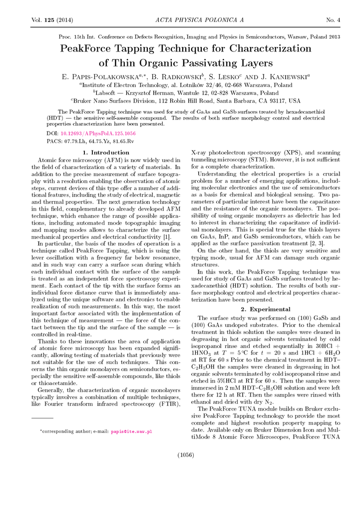 ACTA PHYSICA POLONICA A Vol. 125 (2014) No. 4 Proc. 15th Int. Conference on Defects Recognition, Imaging and Physics in Semiconductors, Warsaw, Poland 2013 PeakForce Tapping Technique for Characterization of Thin Organic Passivating Layers a,∗ b c a E. Papis-Polakowska , B. Radkowski , S. Lesko and J. Kaniewski a Institute of Electron Technology, al. Lotników 32/46, 02-668 Warszawa, Poland b c Labsoft Krzysztof Herman, Wantule 12, 02-828 Warszawa, Poland Bruker Nano Surfaces Division, 112 Robin Hill Road, Santa Barbara, CA 93117, USA The PeakForce Tapping technique was used for study of GaAs and GaSb surfaces treated by hexadecanethiol (HDT) the sensitive self-assemble compound. The results of both surface morphology control and electrical properties characterization have been presented. DOI: 10.12693/APhysPolA.125.1056 PACS: 07.79.Lh, 64.75.Yz, 81.65.Rv X-ray photoelectron spectroscopy (XPS), and scanning 1. Introduction Atomic force microscopy (AFM) is now widely used in the eld of characterization of a variety of materials. In tunneling microscopy (STM). However, it is not sucient for a complete characterization. addition to the precise measurement of surface topogra- Understanding the electrical properties is a crucial phy with a resolution enabling the observation of atomic problem for a number of emerging applications, includ- steps, current devices of this type oer a number of addi- ing molecular electronics and the use of semiconductors tional features, including the study of electrical, magnetic as a basis for chemical and biological sensing. Two pa- and thermal properties. The next generation technology rameters of particular interest have been the capacitance in this eld, complementary to already developed AFM and the resistance of the organic monolayers. The pos- technique, which enhance the range of possible applica- sibility of using organic monolayers as dielectric has led tions, including automated mode topographic imaging to interest in characterizing the capacitance of individ- and mapping modes allows to characterize the surface ual monolayers. This is special true for the thiols layers mechanical properties and electrical conductivity [1]. on GaAs, InP, and GaSb semiconductors, which can be In particular, the basis of the modes of operation is a applied as the surface passivation treatment [2, 3]. technique called PeakForce Tapping, which is using the On the other hand, the thiols are very sensitive and lever oscillation with a frequency far below resonance, typing mode, usual for AFM can damage such organic and in such way can carry a surface scan during which structures. each individual contact with the surface of the sample In this work, the PeakForce Tapping technique was is treated as an independent force spectroscopy experi- used for study of GaAs and GaSb surfaces treated by he- ment. Each contact of the tip with the surface forms an xadecanethiol (HDT) solution. The results of both sur- individual force distance curve that is immediately ana- face morphology control and electrical properties charac- lyzed using the unique software and electronics to enable terization have been presented. realization of such measurements. In this way, the most 2. Experimental important factor associated with the implementation of this technique of measurement the force of the contact between the tip and the surface of the sample is controlled in real-time. Thanks to these innovations the area of application of atomic force microscopy has been expanded signicantly, allowing testing of materials that previously were not suitable for the use of such techniques. This con- cerns the thin organic monolayers on semiconductors, especially the sensitive self-assemble compounds, like thiols or thioacetamide. Generally, the characterization of organic monolayers typically involves a combination of multiple techniques, like Fourier transform infrared spectroscopy (FTIR), The surface study was performed on (100) GaSb and (100) GaAs undoped substrates. Prior to the chemical treatment in thiols solution the samples were cleaned in degreasing in hot organic solvents terminated by cold isopropanol rinse and etched sequentially in 30HCl + 1HNO3 at T = 5 ◦C for t = 20 s and 1HCl + 6H2 O at RT for 60 s Prior to the chemical treatment in HDT C2 H5 OH the samples were cleaned in degreasing in hot organic solvents terminated by cold isopropanol rinse and etched in 5%HCl at RT for 60 s. Then the samples were immersed in 2 mM HDTC2 H5 OH solution and were left there for 12 h at RT. Then the samples were rinsed with ethanol and dried with dry N2 . The PeakForce TUNA module builds on Bruker exclusive PeakForce Tapping technology to provide the most complete and highest resolution property mapping to ∗ corresponding author; e-mail: [email protected] date. Available only on Bruker Dimension Icon and MultiMode 8 Atomic Force Microscopes, PeakForce TUNA (1056) PeakForce Tapping Technique for Characterization . . . 1057 enables, for the rst time, quantitative conductivity map- of soft or delicate samples. ping on fragile samples, such as organic photovoltaics, Mode, the AFM tip oscillates relative to the sample by lithium ion cathodes, and carbon nanotube assemblies, tens of nanometers, and only spends a few percent of that while eliminating the adverse eects caused by sample oscillation in contact with the surface. This is advanta- damage and tip contamination. geous for eliminating tip wear and sample damage, but PeakForce TUNA oers highest resolution current When imaging in Tapping- presents a problem for conductivity measurements. mapping on the most fragile samples, unmatched re- In order to measure the current signal in such a short peatability and consistency in nanoelectrical measure- time duration (µs) with reasonable signal-to-noise ratio, ments of correlated nanomechanical and nanoelectrical the current amplier would need a bandwidth in the MHz properties. range at a high gain (10 9 −1011