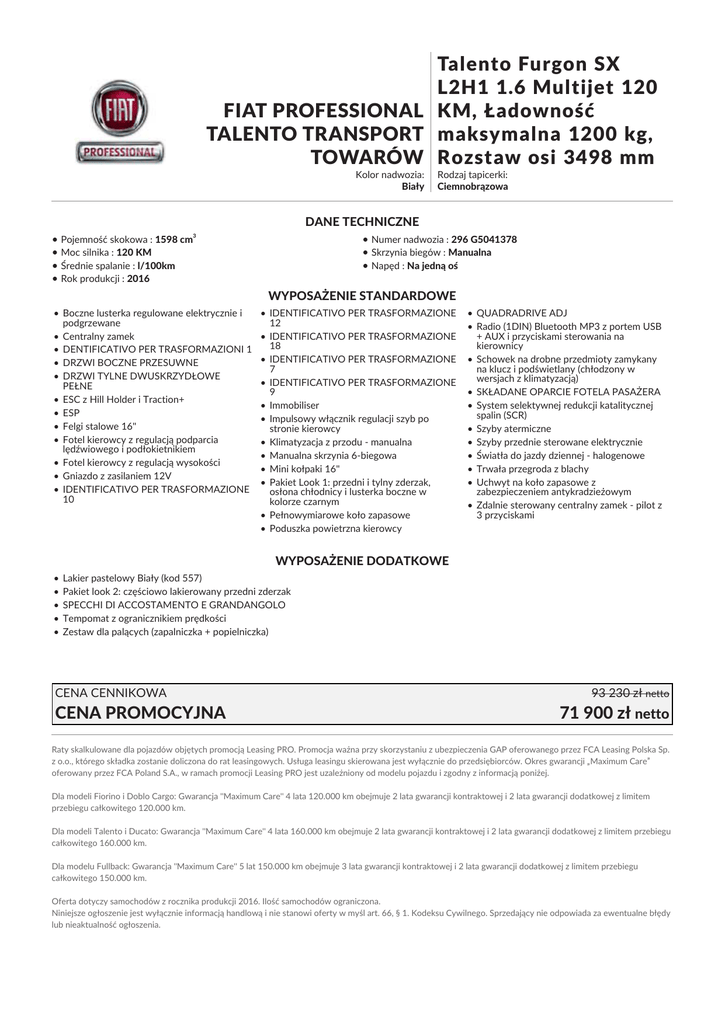 Talento Furgon SX L2H1 1.6 Multijet 120 FIAT PROFESSIONAL KM, Ładowność TALENTO TRANSPORT maksymalna 1200 kg, TOWARÓW Rozstaw osi 3498 mm Kolor nadwozia: Biały Rodzaj tapicerki: Ciemnobrązowa DANE TECHNICZNE • Pojemność skokowa : 1598 cm3 • Moc silnika : 120 KM • Średnie spalanie : l/100km • Rok produkcji : 2016 • Numer nadwozia : 296 G5041378 • Skrzynia biegów : Manualna • Napęd : Na jedną oś WYPOSAŻENIE STANDARDOWE • Boczne lusterka regulowane elektrycznie i podgrzewane • Centralny zamek • DENTIFICATIVO PER TRASFORMAZIONI 1 • DRZWI BOCZNE PRZESUWNE • DRZWI TYLNE DWUSKRZYDŁOWE PEŁNE • ESC z Hill Holder i Traction+ • ESP • Felgi stalowe 16" • Fotel kierowcy z regulacją podparcia lędźwiowego i podłokietnikiem • Fotel kierowcy z regulacją wysokości • Gniazdo z zasilaniem 12V • IDENTIFICATIVO PER TRASFORMAZIONE 10 • IDENTIFICATIVO PER TRASFORMAZIONE 12 • IDENTIFICATIVO PER TRASFORMAZIONE 18 • IDENTIFICATIVO PER TRASFORMAZIONE 7 • IDENTIFICATIVO PER TRASFORMAZIONE 9 • Immobiliser • Impulsowy włącznik regulacji szyb po stronie kierowcy • Klimatyzacja z przodu - manualna • Manualna skrzynia 6-biegowa • Mini kołpaki 16" • Pakiet Look 1: przedni i tylny zderzak, osłona chłodnicy i lusterka boczne w kolorze czarnym • Pełnowymiarowe koło zapasowe • Poduszka powietrzna kierowcy • QUADRADRIVE ADJ • Radio (1DIN) Bluetooth MP3 z portem USB + AUX i przyciskami sterowania na kierownicy • Schowek na drobne przedmioty zamykany na klucz i podświetlany (chłodzony w wersjach z klimatyzacją) • SKŁADANE OPARCIE FOTELA PASAŻERA • System selektywnej redukcji katalitycznej spalin (SCR) • Szyby atermiczne • Szyby przednie sterowane elektrycznie • Światła do jazdy dziennej - halogenowe • Trwała przegroda z blachy • Uchwyt na koło zapasowe z zabezpieczeniem antykradzieżowym • Zdalnie sterowany centralny zamek - pilot z 3 przyciskami WYPOSAŻENIE DODATKOWE • • • • • Lakier pastelowy Biały (kod 557) Pakiet look 2: częściowo lakierowany przedni zderzak SPECCHI DI ACCOSTAMENTO E GRANDANGOLO Tempomat z ogranicznikiem prędkości Zestaw dla palących (zapalniczka + popielniczka) CENA CENNIKOWA CENA PROMOCYJNA 93 230 zł netto 71 900 zł netto Raty skalkulowane dla pojazdów objętych promocją Leasing PRO. Promocja ważna przy skorzystaniu z ubezpieczenia GAP oferowanego przez FCA Leasing Polska Sp. z o.o., którego składka zostanie doliczona do rat leasingowych. Usługa leasingu skierowana jest wyłącznie do przedsiębiorców. Okres gwarancji „Maximum Care” oferowany przez FCA Poland S.A., w ramach promocji Leasing PRO jest uzależniony od modelu pojazdu i zgodny z informacją poniżej. Dla modeli Fiorino i Doblo Cargo: Gwarancja "Maximum Care" 4 lata 120.000 km obejmuje 2 lata gwarancji kontraktowej i 2 lata gwarancji dodatkowej z limitem przebiegu całkowitego 120.000 km. Dla modeli Talento i Ducato: Gwarancja "Maximum Care" 4 lata 160.000 km obejmuje 2 lata gwarancji kontraktowej i 2 lata gwarancji dodatkowej z limitem przebiegu całkowitego 160.000 km. Dla modelu Fullback: Gwarancja "Maximum Care" 5 lat 150.000 km obejmuje 3 lata gwarancji kontraktowej i 2 lata gwarancji dodatkowej z limitem przebiegu całkowitego 150.000 km. Oferta dotyczy samochodów z rocznika produkcji 2016. Ilość samochodów ograniczona. Niniejsze ogłoszenie jest wyłącznie informacją handlową i nie stanowi oferty w myśl art. 66, § 1. Kodeksu Cywilnego. Sprzedający nie odpowiada za ewentualne błędy lub nieaktualność ogłoszenia.
